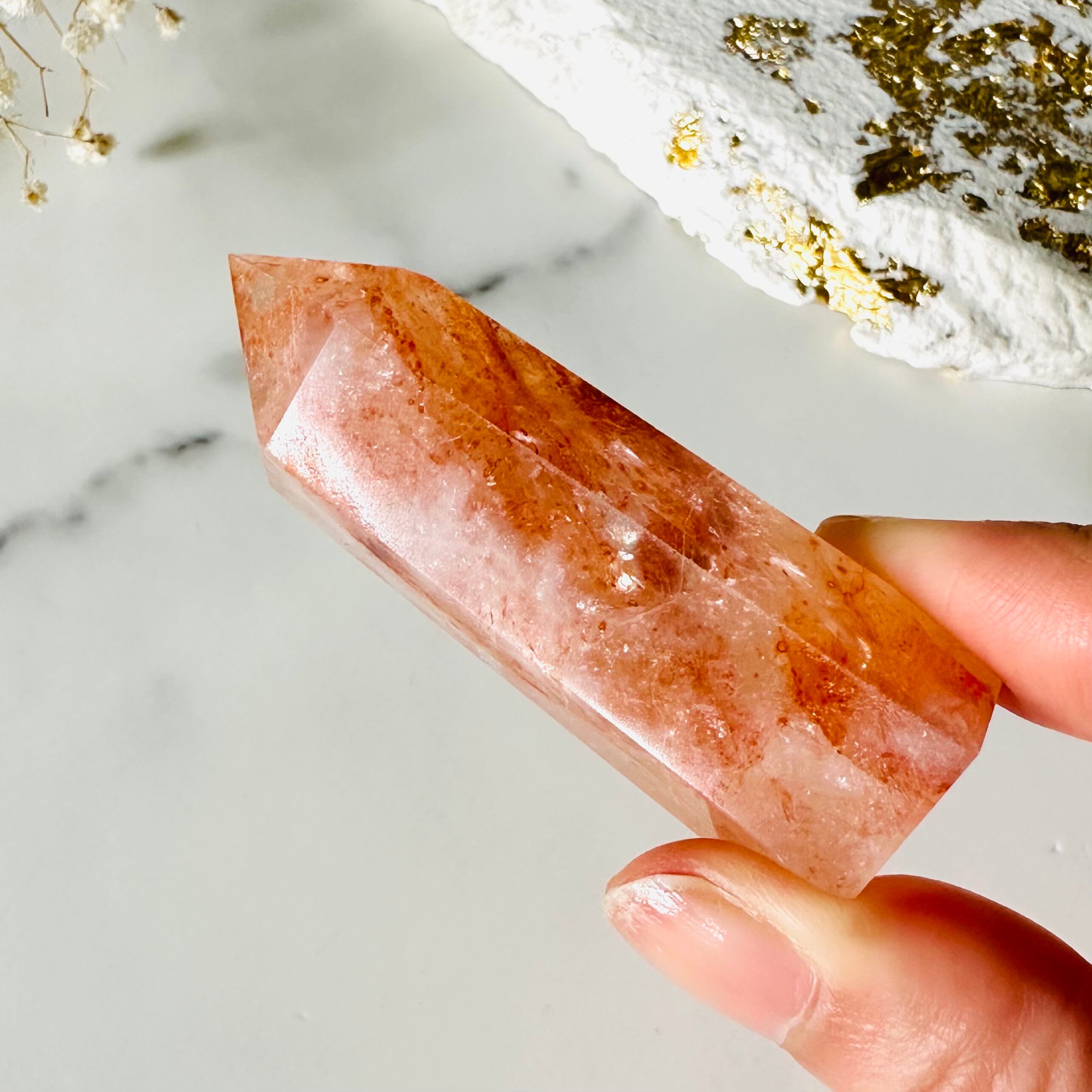 レピドクロサイトを内包した水晶で、別名「レピドクロサイト イン クォーツ」と言います。 スーパーセブンやストロベリークォーツと同じくクリスタルヒーラーに人気があるパワーストーンで、全体的に赤みを帯びていることから「情熱」「力強さ」を表し、持ち主に自信と決断力を与えると言われています。