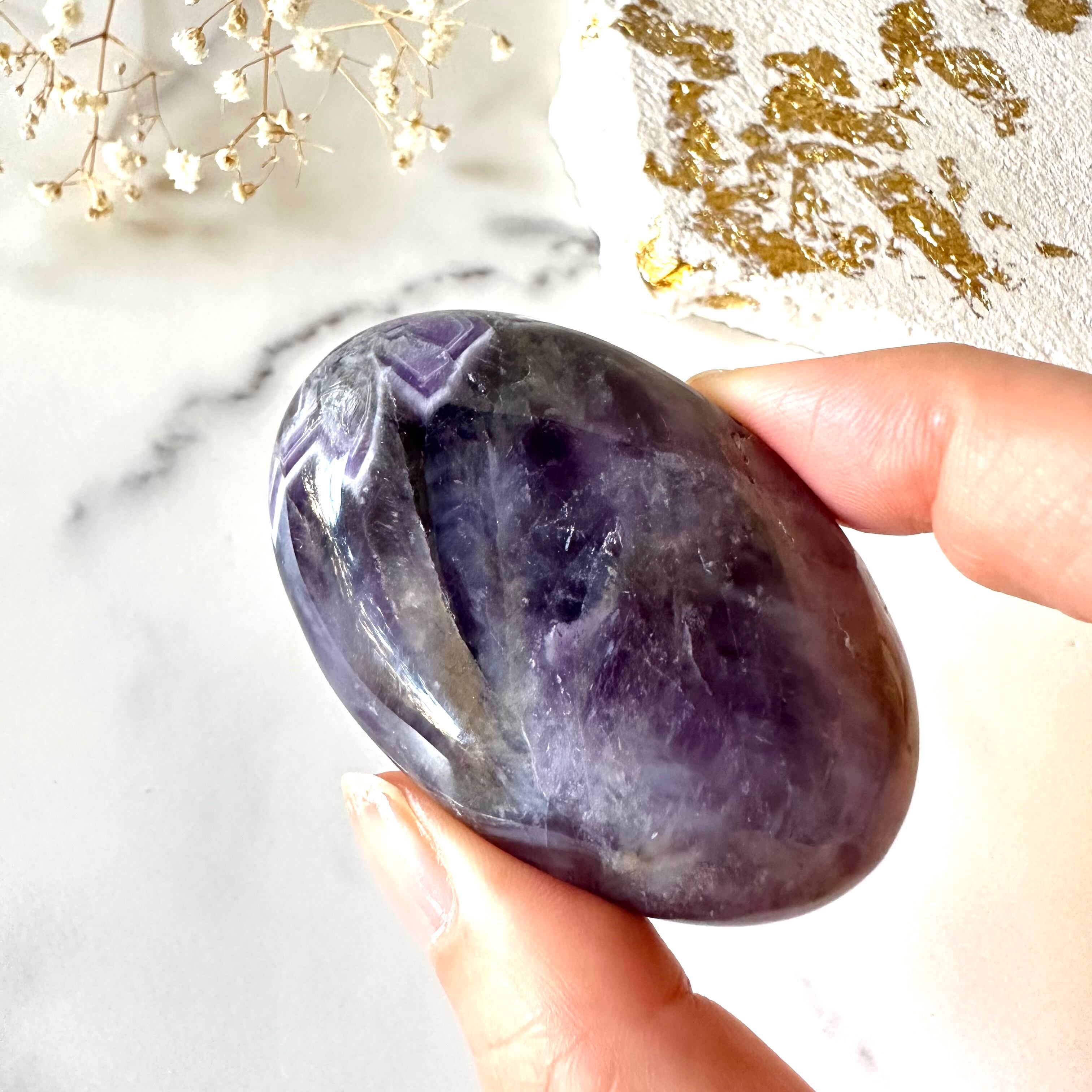 握りやすい大きさでひんやりと触り心地のいいパームストーンです。握り石としてはもちろん、インテリアとして飾っていただくのにもいいサイズ感です。磨き上げられた表面には艶があり、アメジストの深い紫色と羽のような模様がとても美しいアイテムです。