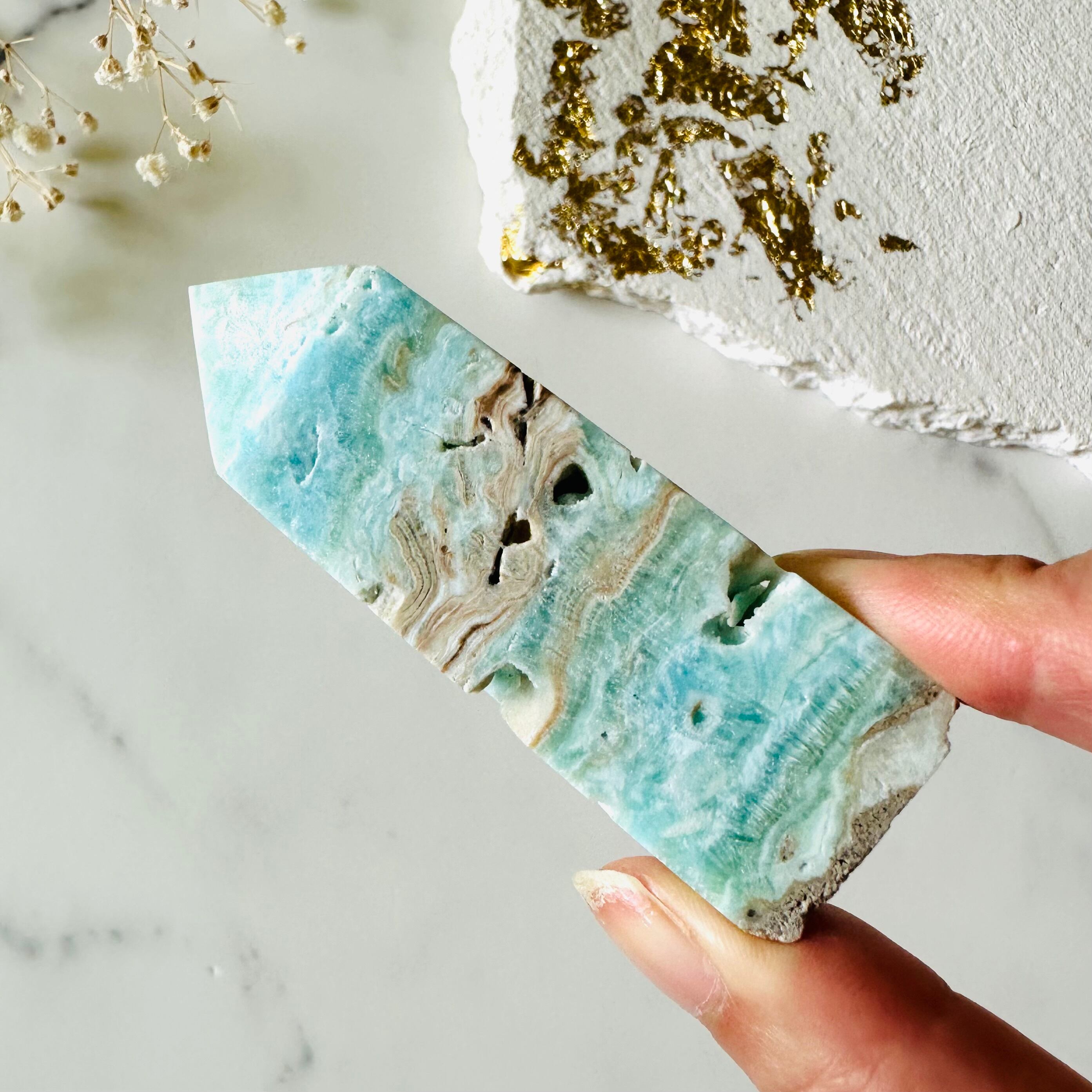 カリビアンブルーカルサイトは2019年にパキスタンで発見された新しい鉱石です。爽やかなオーシャンブルーとサンドブラウンの層がカリブの海と砂浜を想定させる美しい色合いとパターンが特徴の石で、瞬く間に世界中で人気を博すストーンの仲間入りをしました。