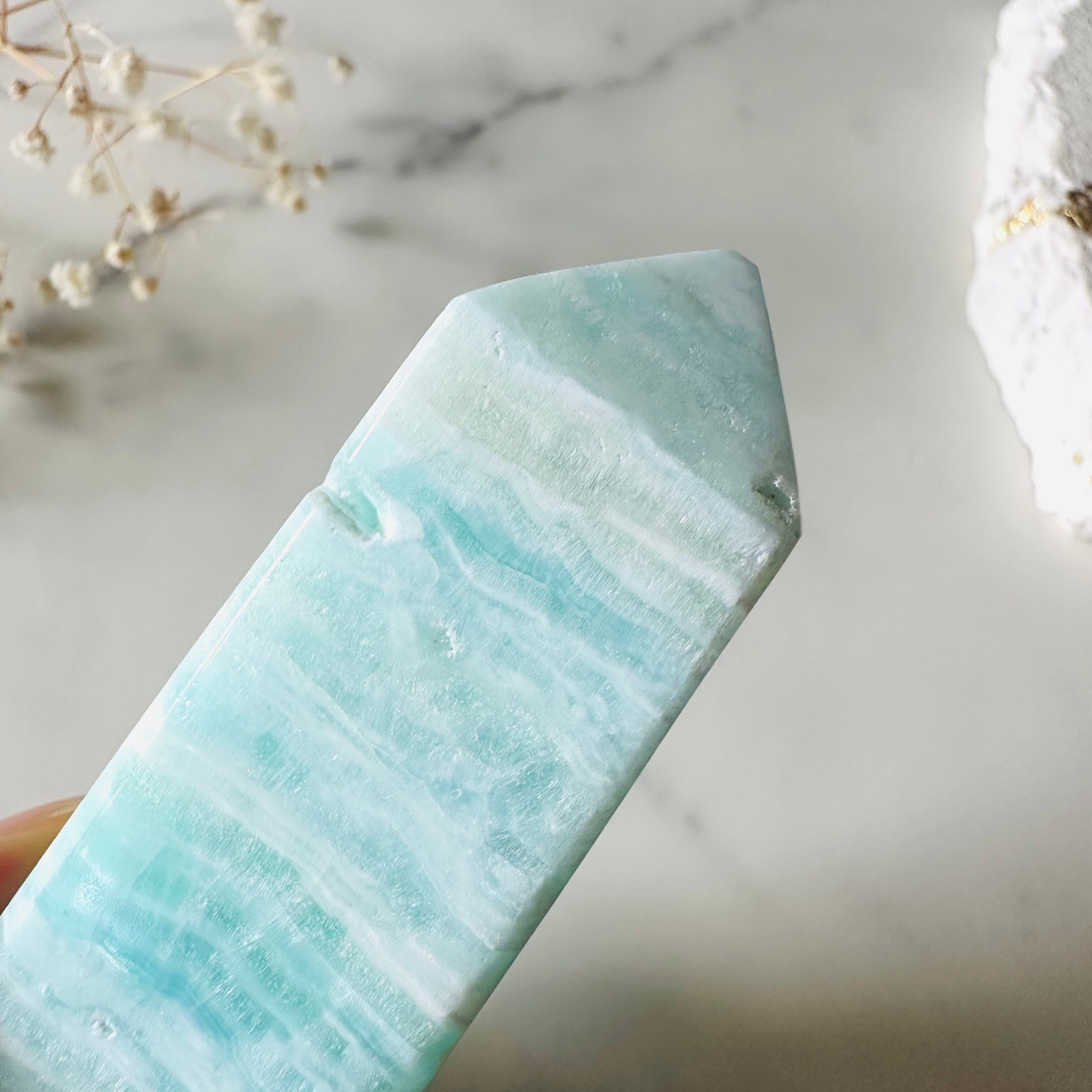 カリビアンブルーカルサイトは2019年にパキスタンで発見された新しい鉱石です。爽やかなオーシャンブルーとサンドブラウンの層がカリブの海と砂浜を想定させる美しい色合いとパターンが特徴の石で、瞬く間に世界中で人気を博すストーンの仲間入りをしました。