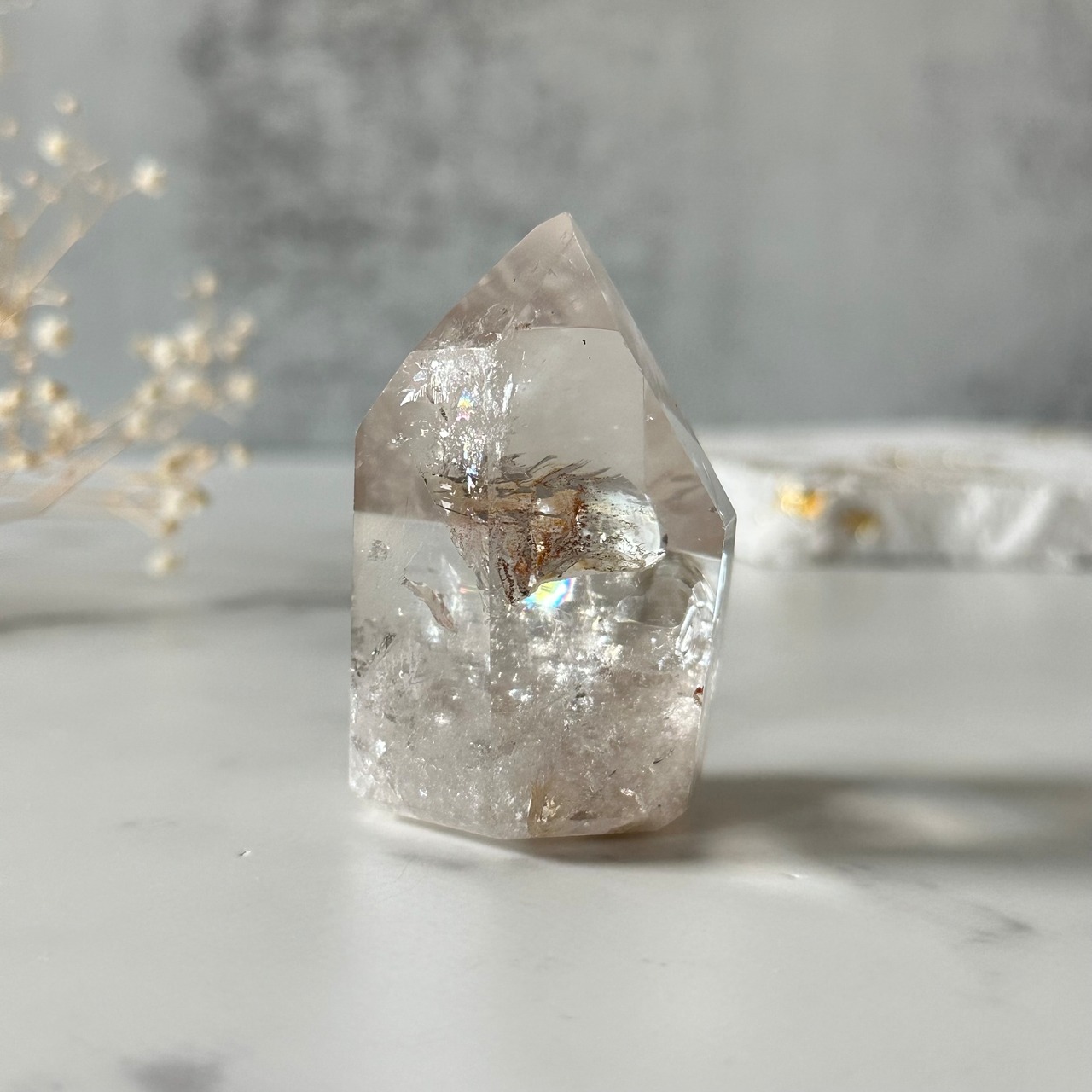 柔らかいニュアンスカラーが美しいブラジル産アイリスクォーツタワーです。