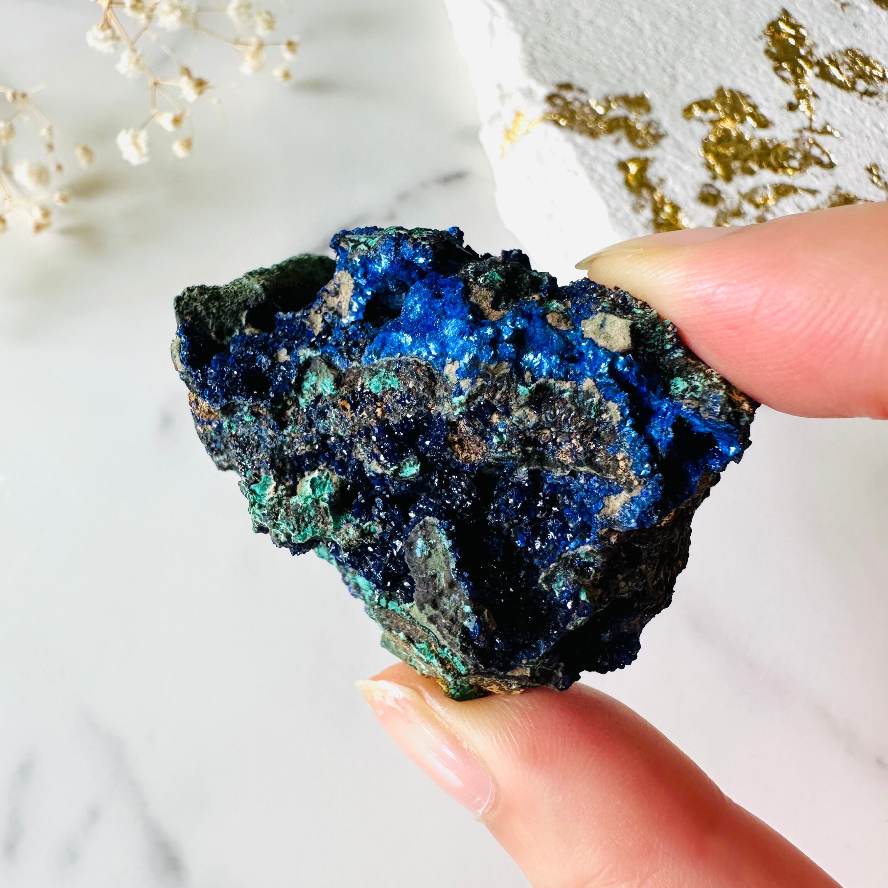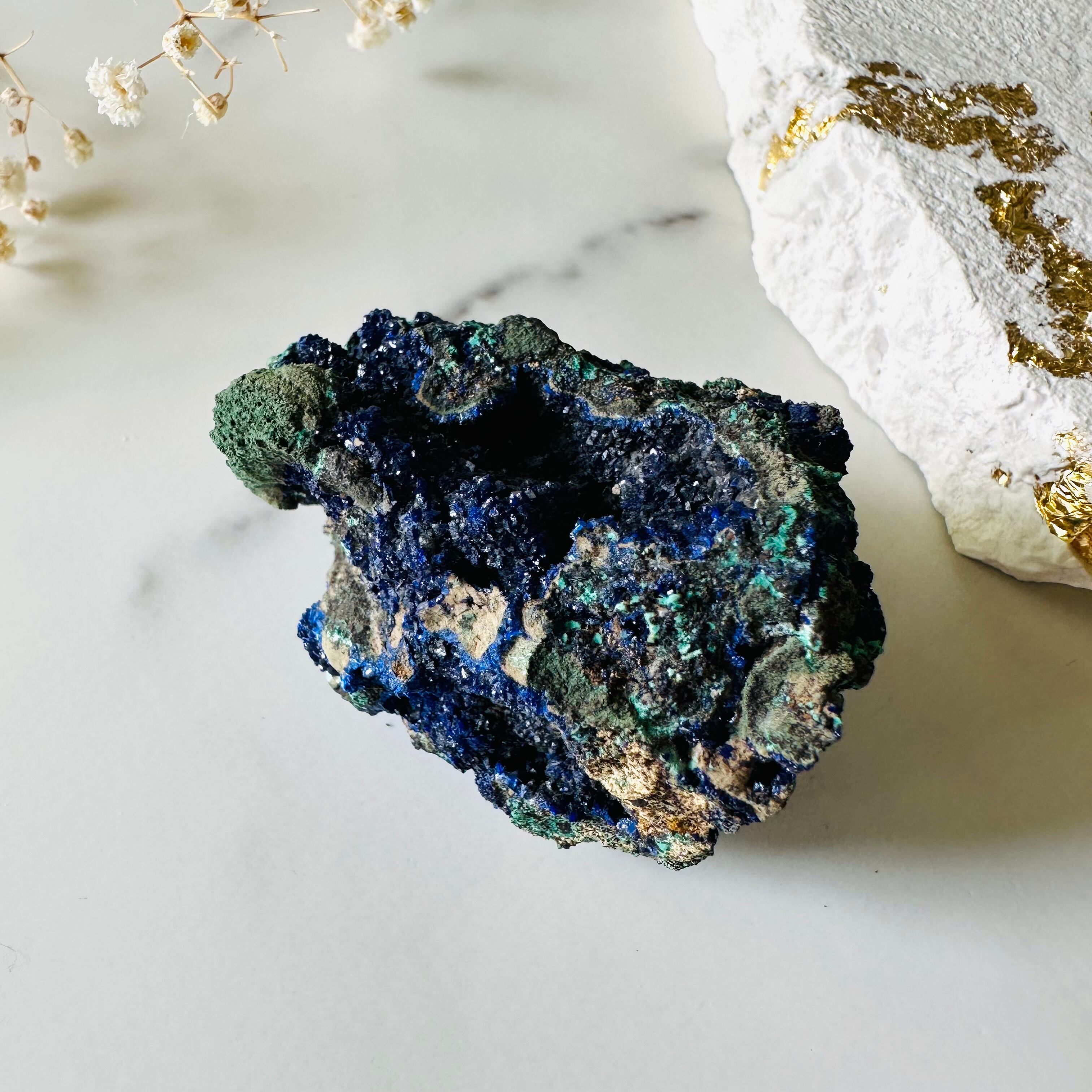 凹凸のある表面の、凹んだ部分からアズライトの深いブルーがキラキラと湧き上がっているようで、その美しさに心を奪われます。マラカイトのエメラルドグリーンとの対比もきれいです。