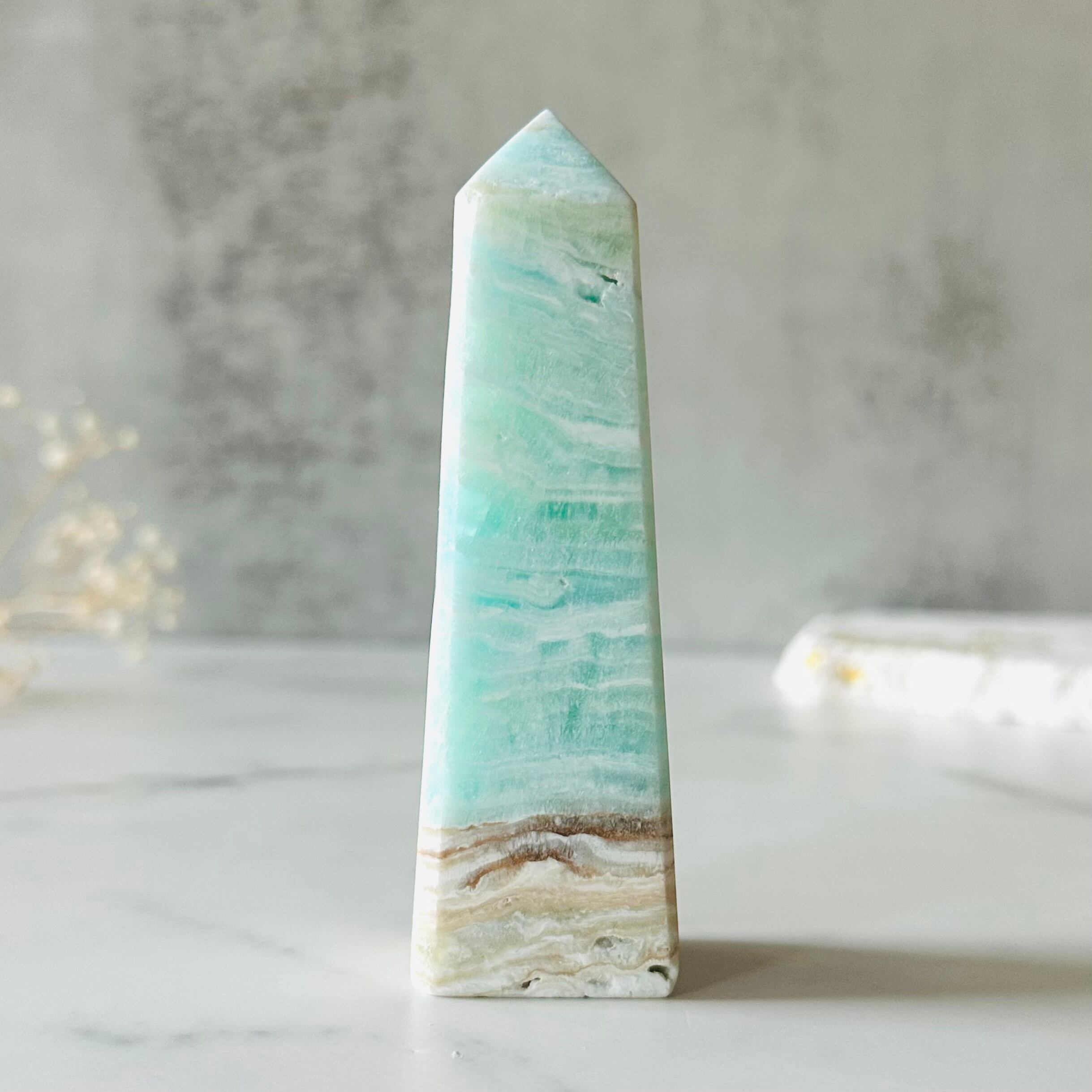 爽やかな水色のカリビアンブルーカルサイトタワー。幾重にも重なった石の層が美しい模様を描き出します。夏にぴったりの涼しげなタワーです。
