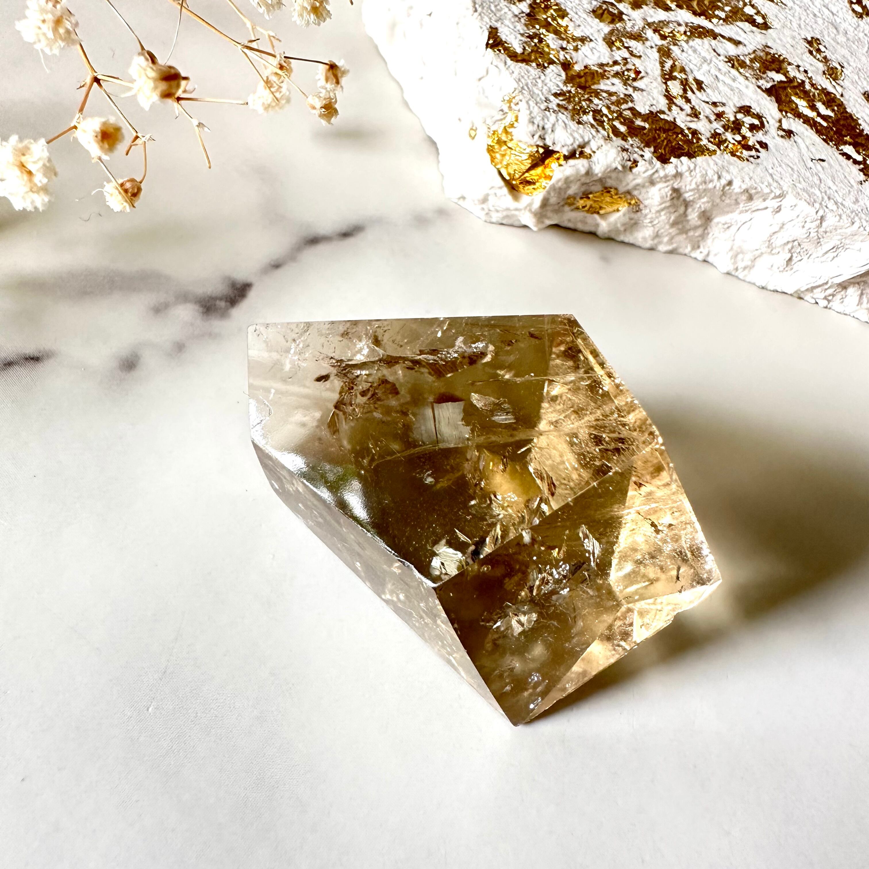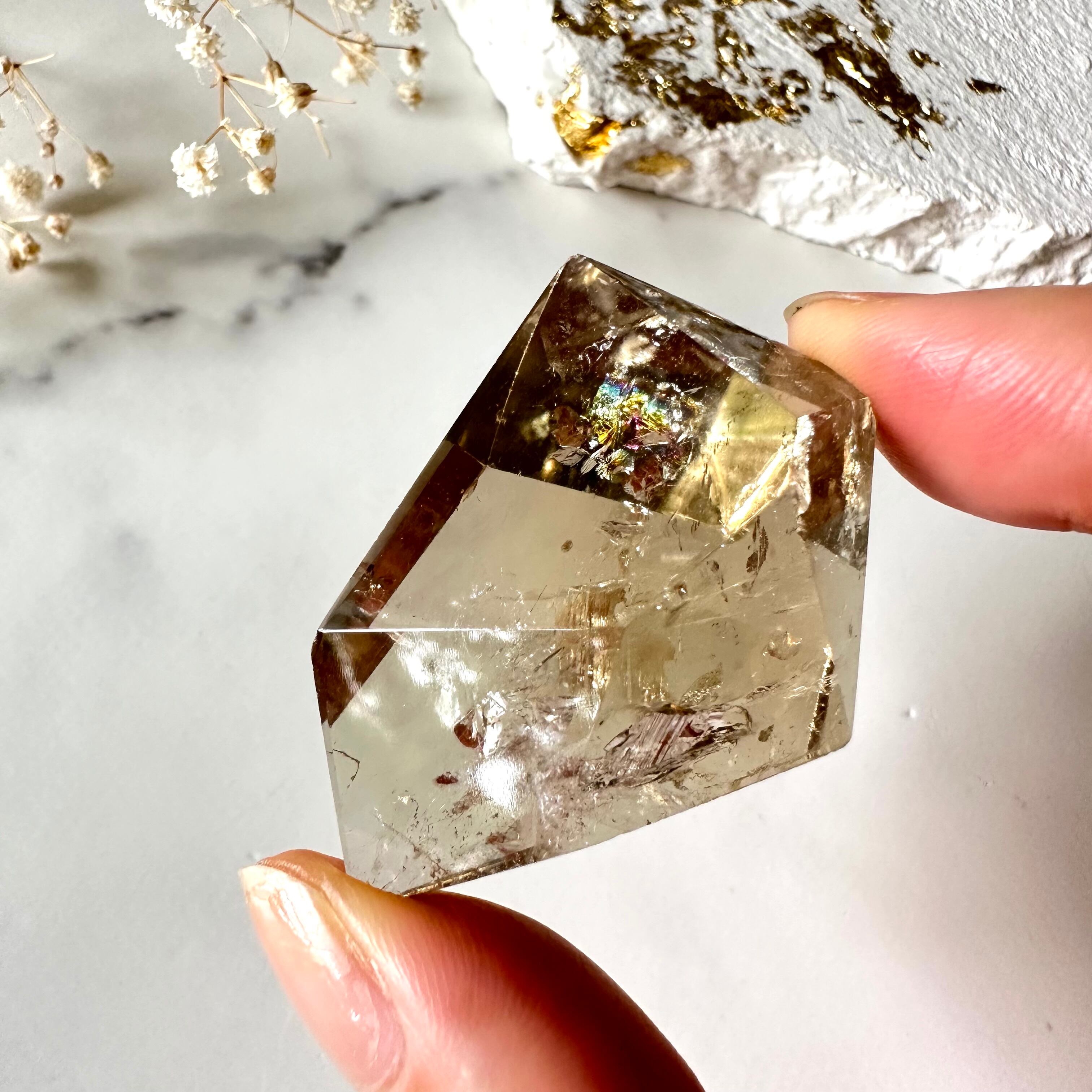 内部の細かなクラックは、舞い落ちる雪や花びらのように儚く美しく、光を入れると一転、虹が華やかに輝き出します。スモーキーは持ち主を災いから守ってくれる魔除けの石なので、バッグに忍ばせて持ち歩くのもおすすめです。