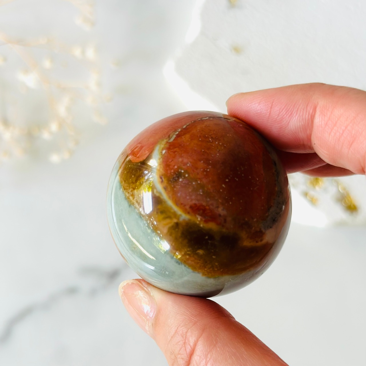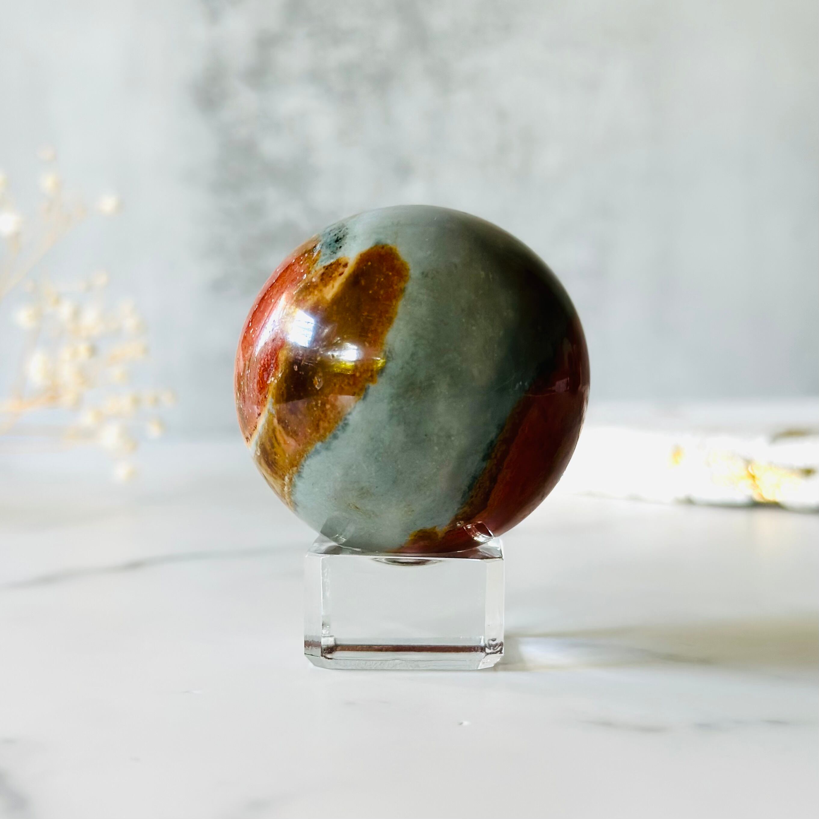 柔らかな色合いが魅力のポリクロームジャスパーのスフィアです。アースカラーが混ざり合ったアートな色合いとパターンが魅力です。ひんやりつややかな石の質感で、見る角度によって様々な自然の模様を楽しむことができます。ハートの形の模様も可愛らしいです。