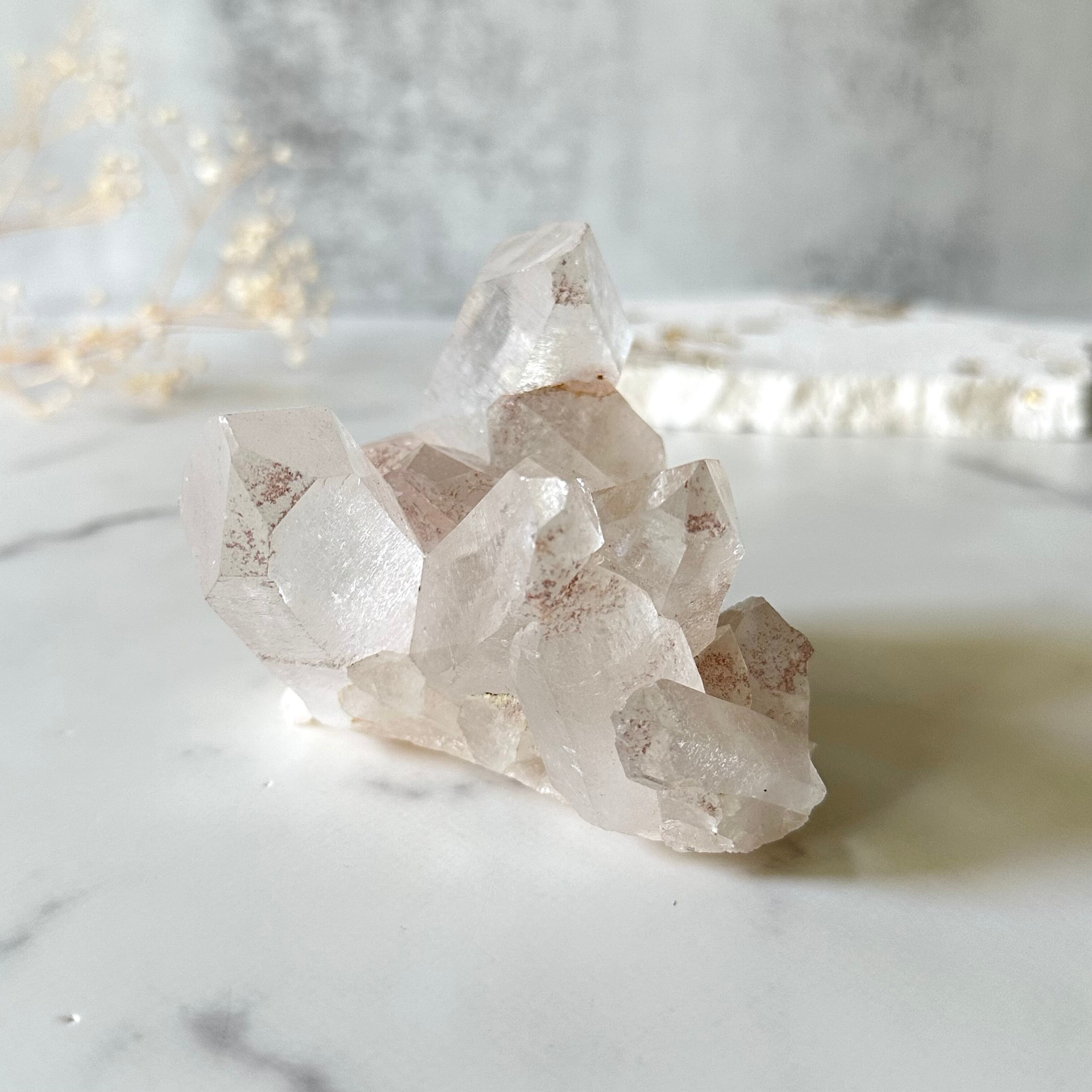 ほんのりピンクに色づいたマ二カラン産水晶のクラスターです。