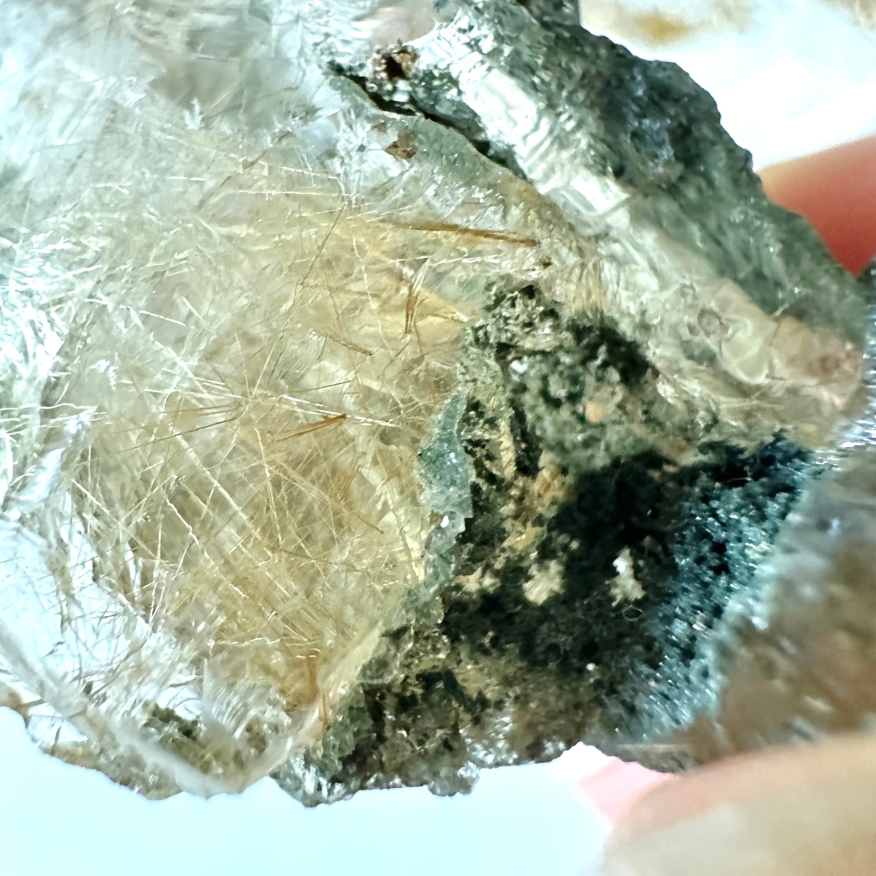 マニハール産水晶は、このようにクローライトを伴ったルチル水晶が産出し始めたことから一躍有名となりました。密度が高く、クル地方産の中でもトップクラスといえる極上の湧水のような透明度と艶やかな照り持つ水晶にキラキラと光り輝くゴールドの針状結晶が映し出された内面の美しさはマニハール産ヒマラヤ水晶の素晴らしい特徴であり、他に類を見ない魅力的な水晶です。