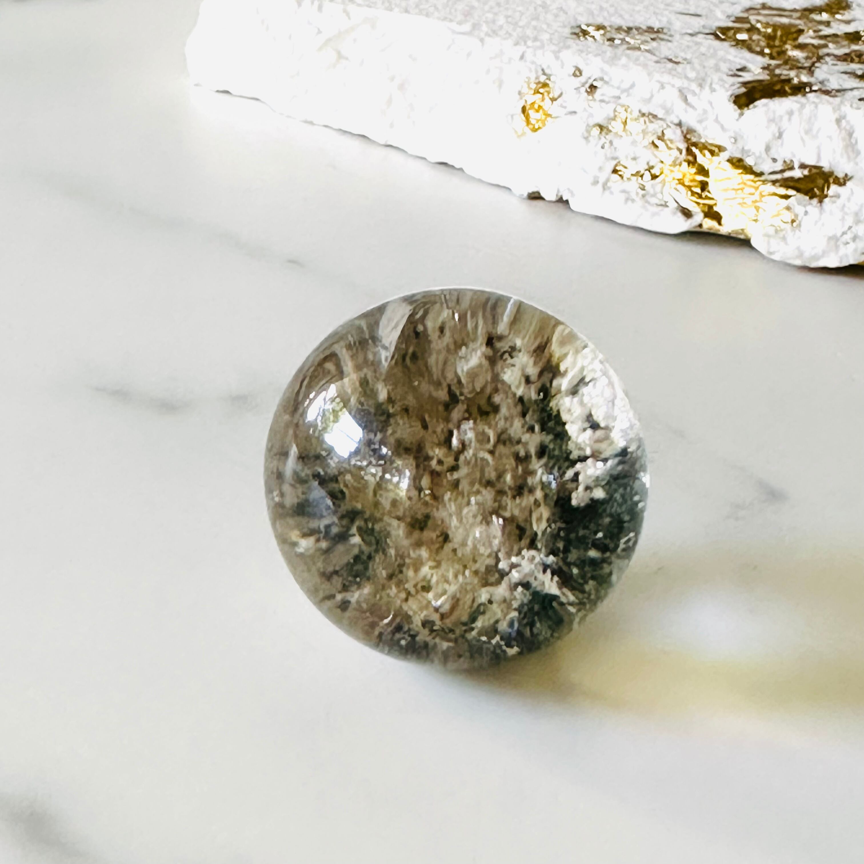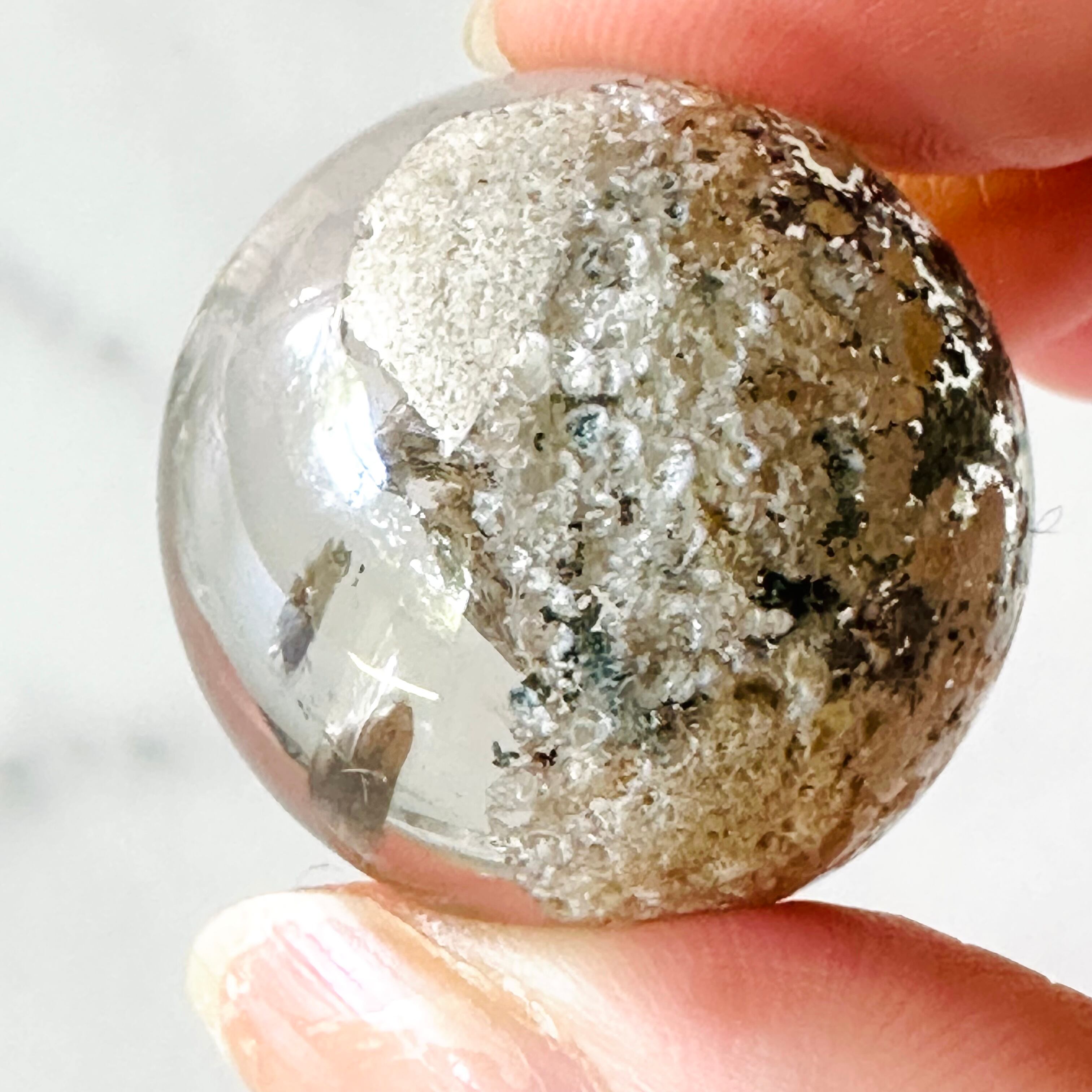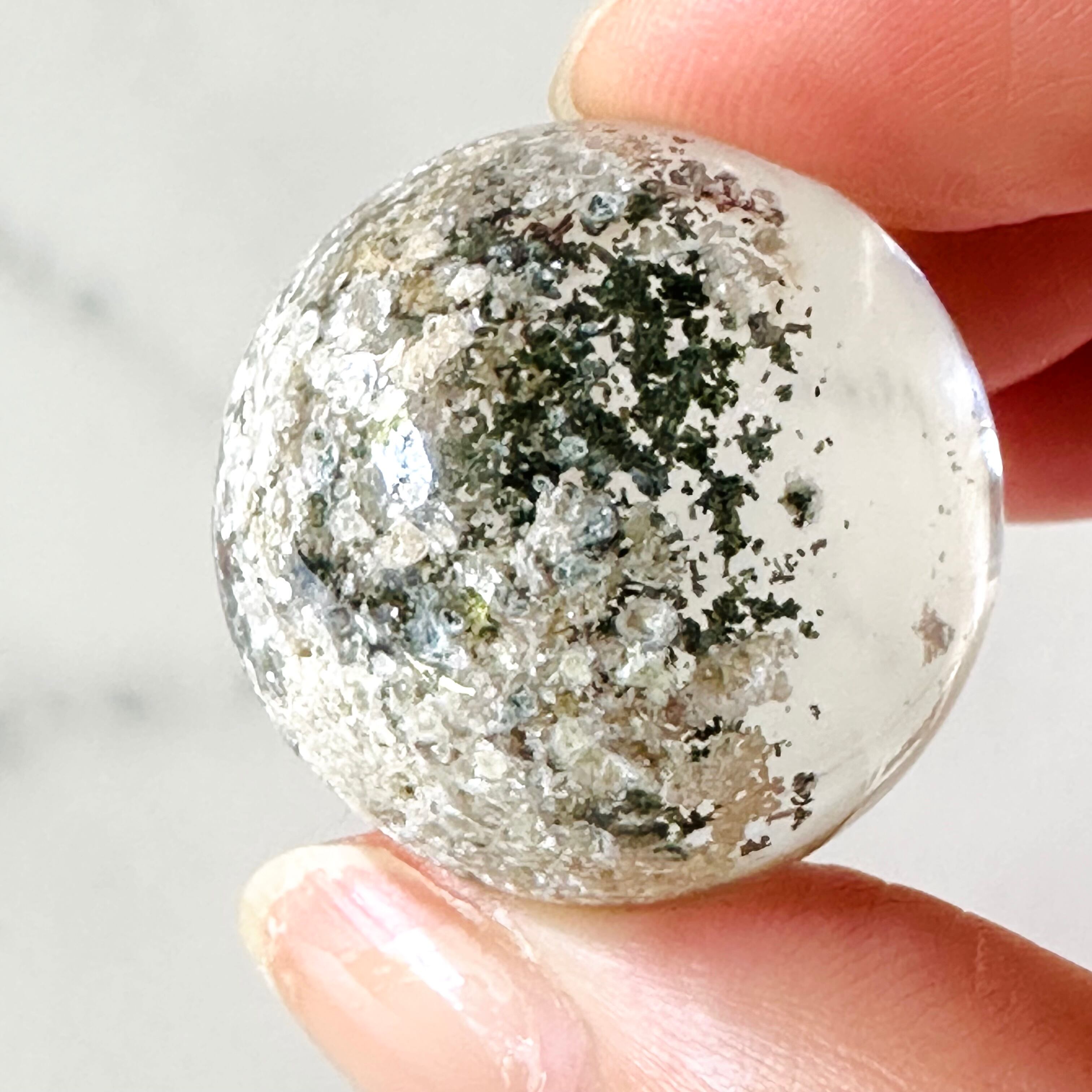 幻想的な雪景色のようなところが魅力のホワイトガーデンクォーツ。内側にはふわりふわりと雪のようなモスと苔のようなグリーンも入り混じります。回すとクラックがキラキラと輝きます。