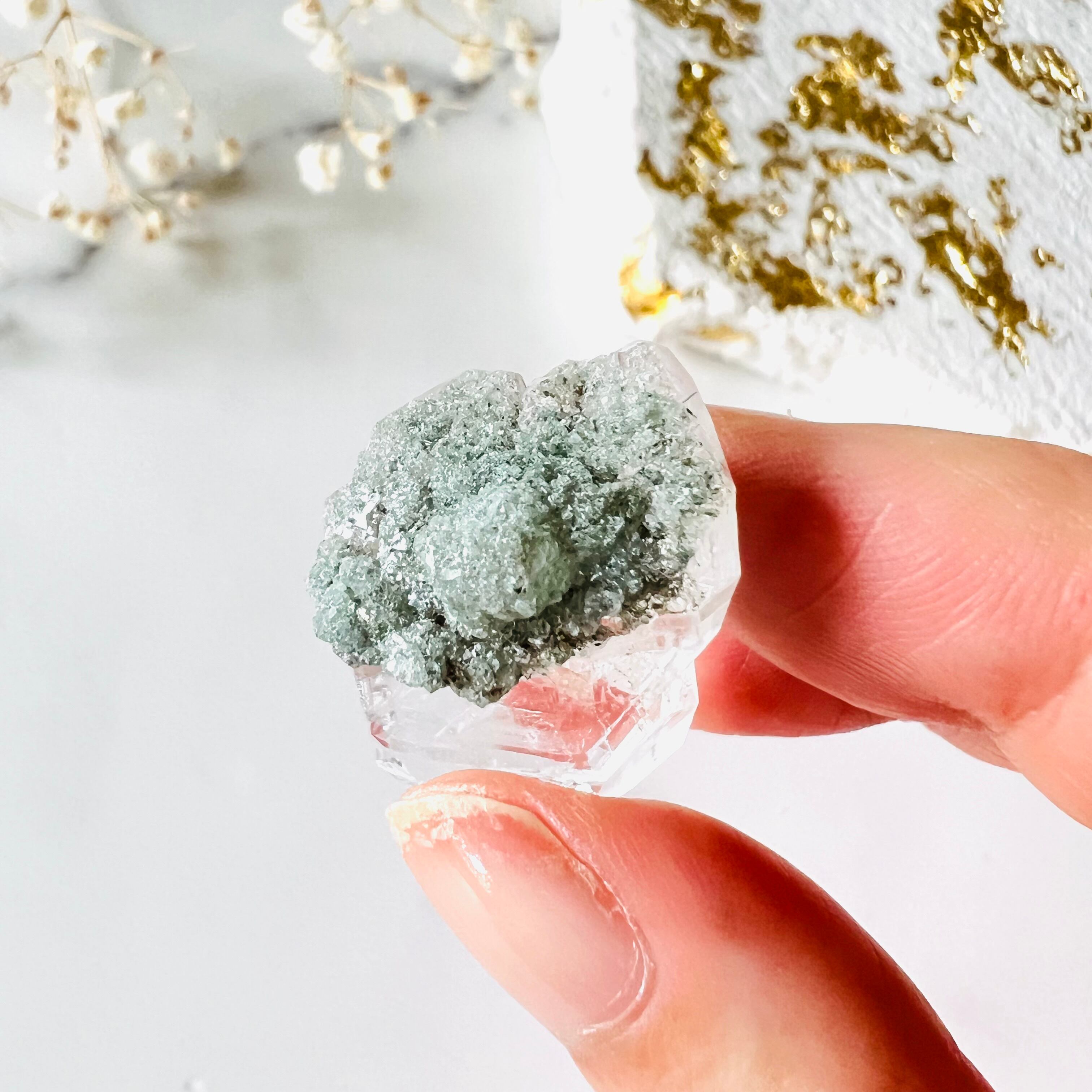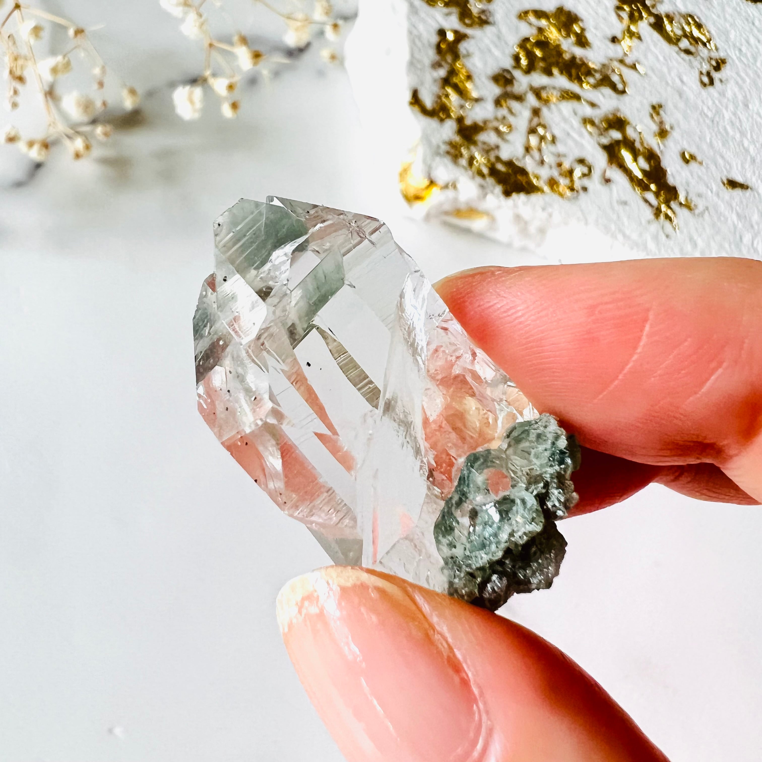 極上の湧水のような透明度と艶やかな照りのある美しさで、タビー形状とカテドラル、クローライトとのコントラストも美しい小さいながらに魅力的が詰まった水晶です。忙しない心を鎮まらせ、静かにひたひたと満たしてくれる特別なクリスタルです。