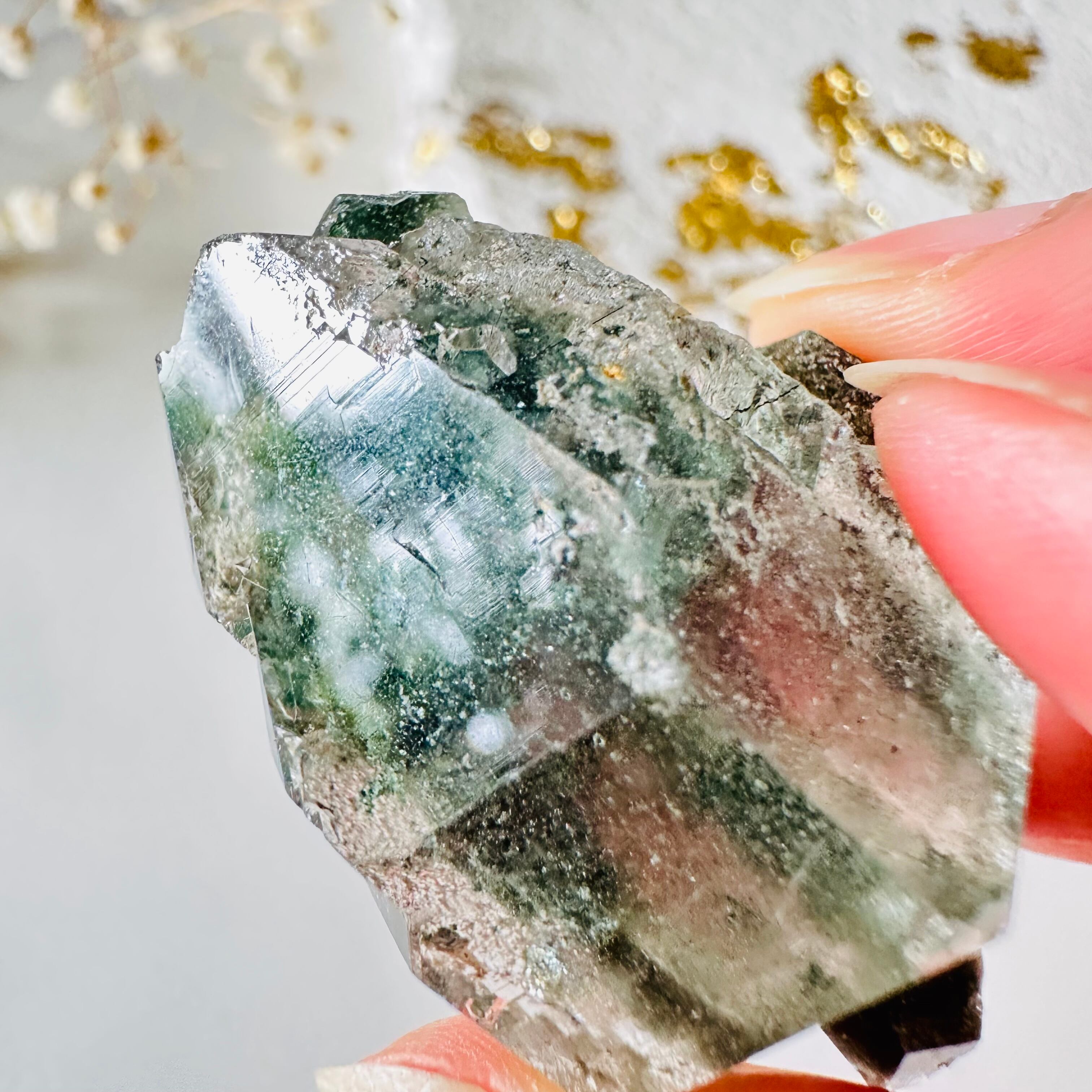 極上の湧水のような透明度と艶やかな照りのある美しさで、たっぷり入ったキラキラ輝くクローライトのモスグリーンと水晶のコントラストが美しい魅力的な水晶です。