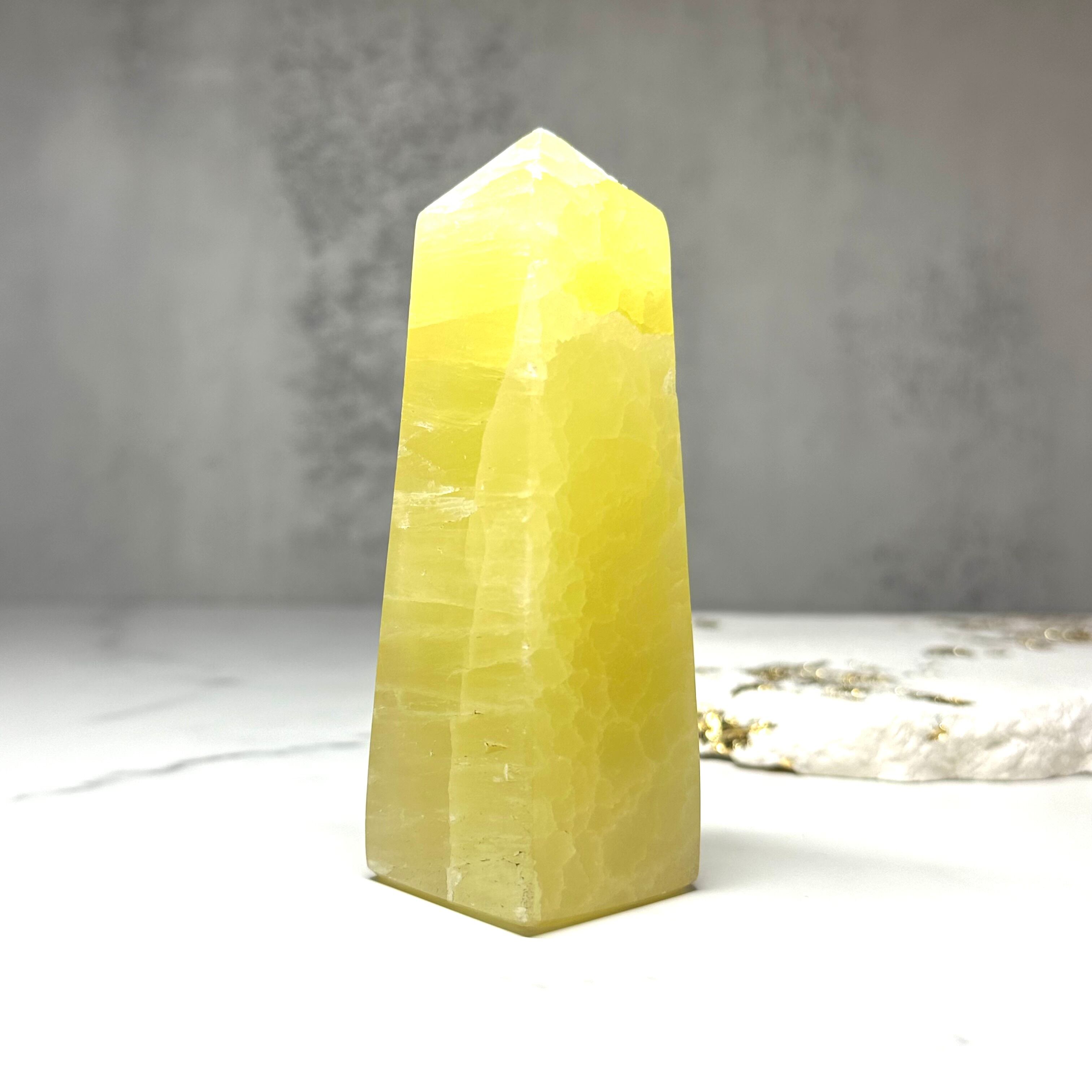 綺麗なレモンイエローのレモンカルサイトタワーです。カルサイトのほんのり透け感のある軽やかな質感と、美しい発色が魅力です。