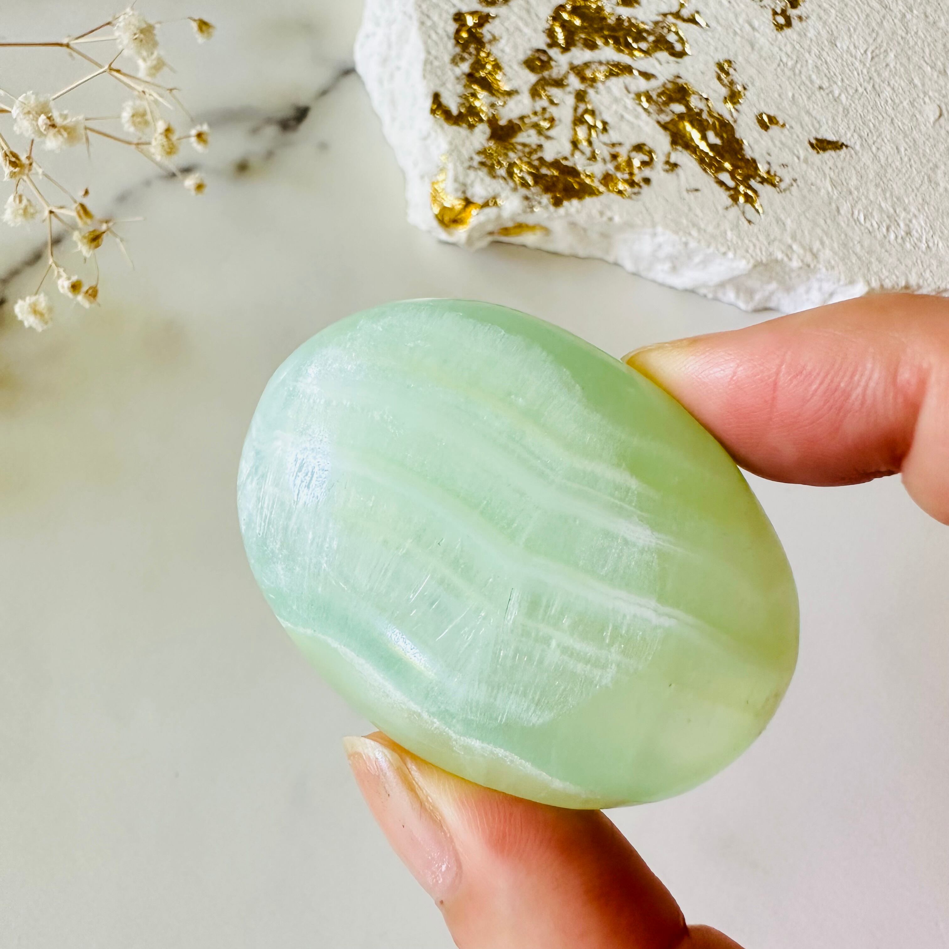 淡く透け感のあるグリーンがとても綺麗なグリーンカルサイト。光を含んでキラキラと輝きます。カルサイトは波動が穏やかで、気づかないほどに優しく心身に癒しを与えてくれます。