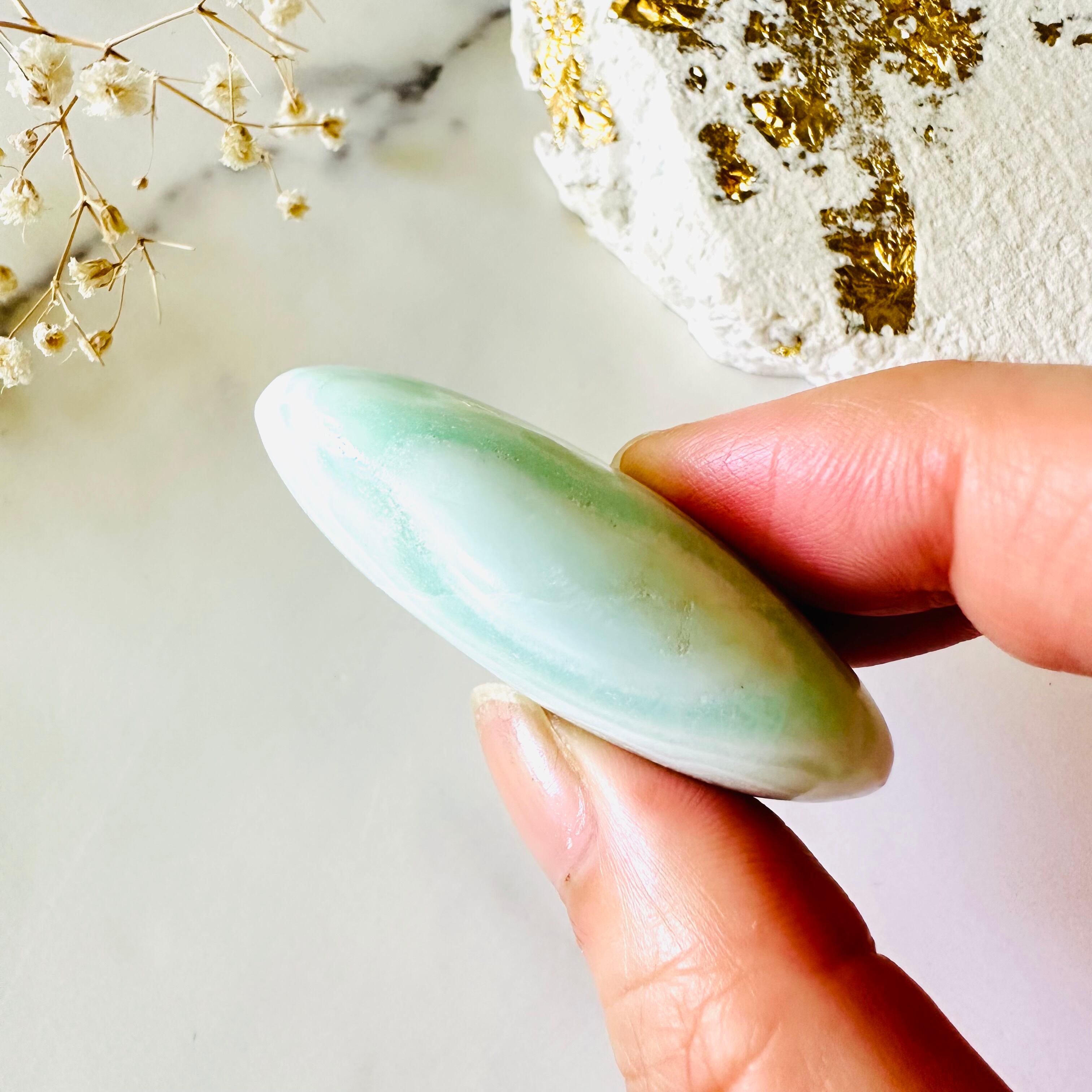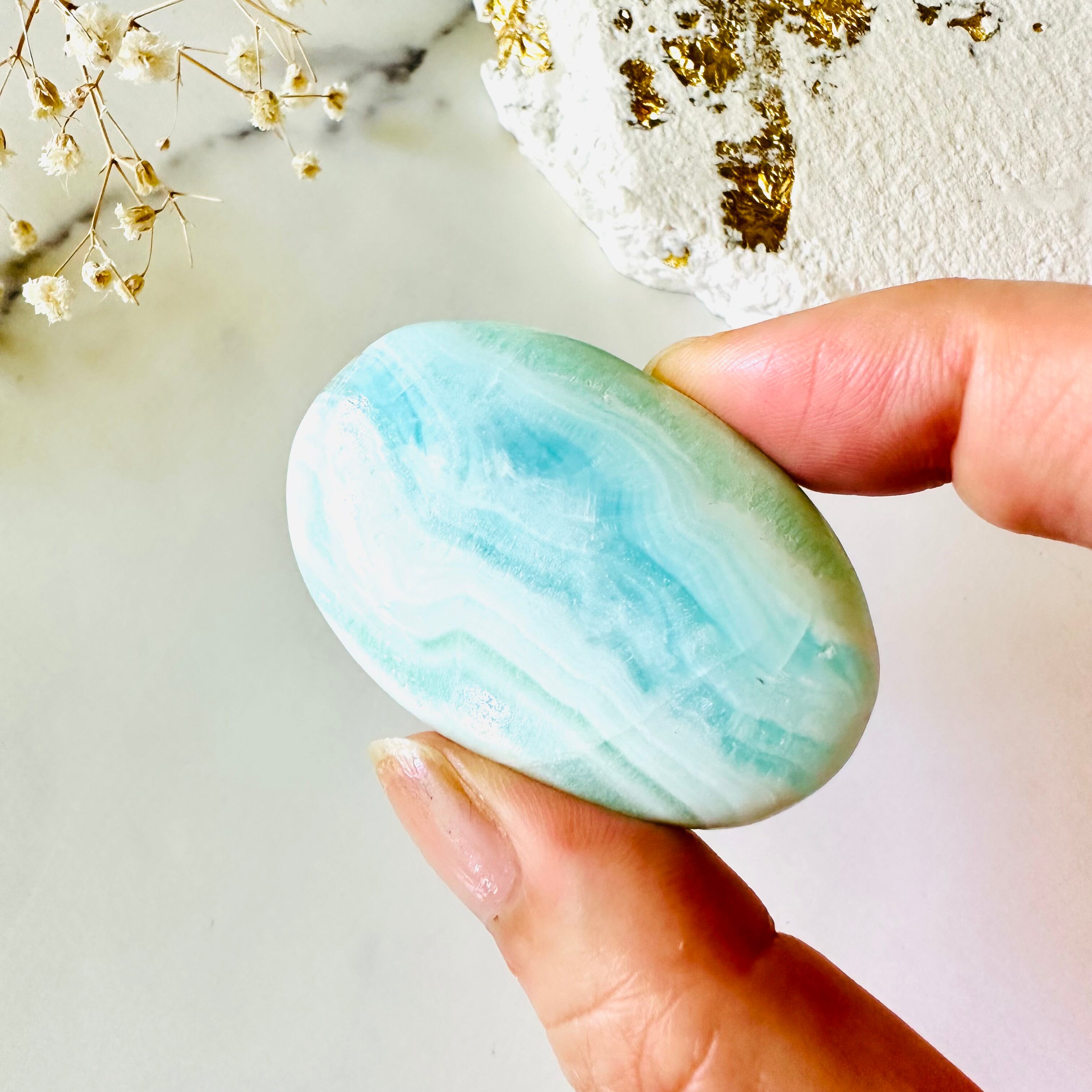 カリビアンブルーカルサイトは2019年にパキスタンで発見された新しい鉱石で、爽やかなオーシャンブルーと茶色の層がカリブの美しい海と砂浜を思わせる美しい天然石です。