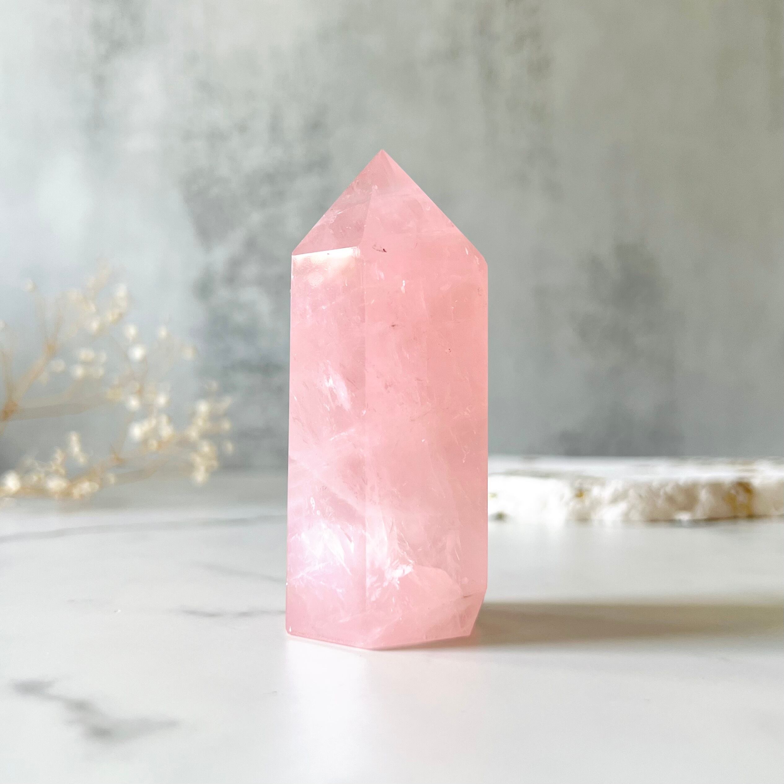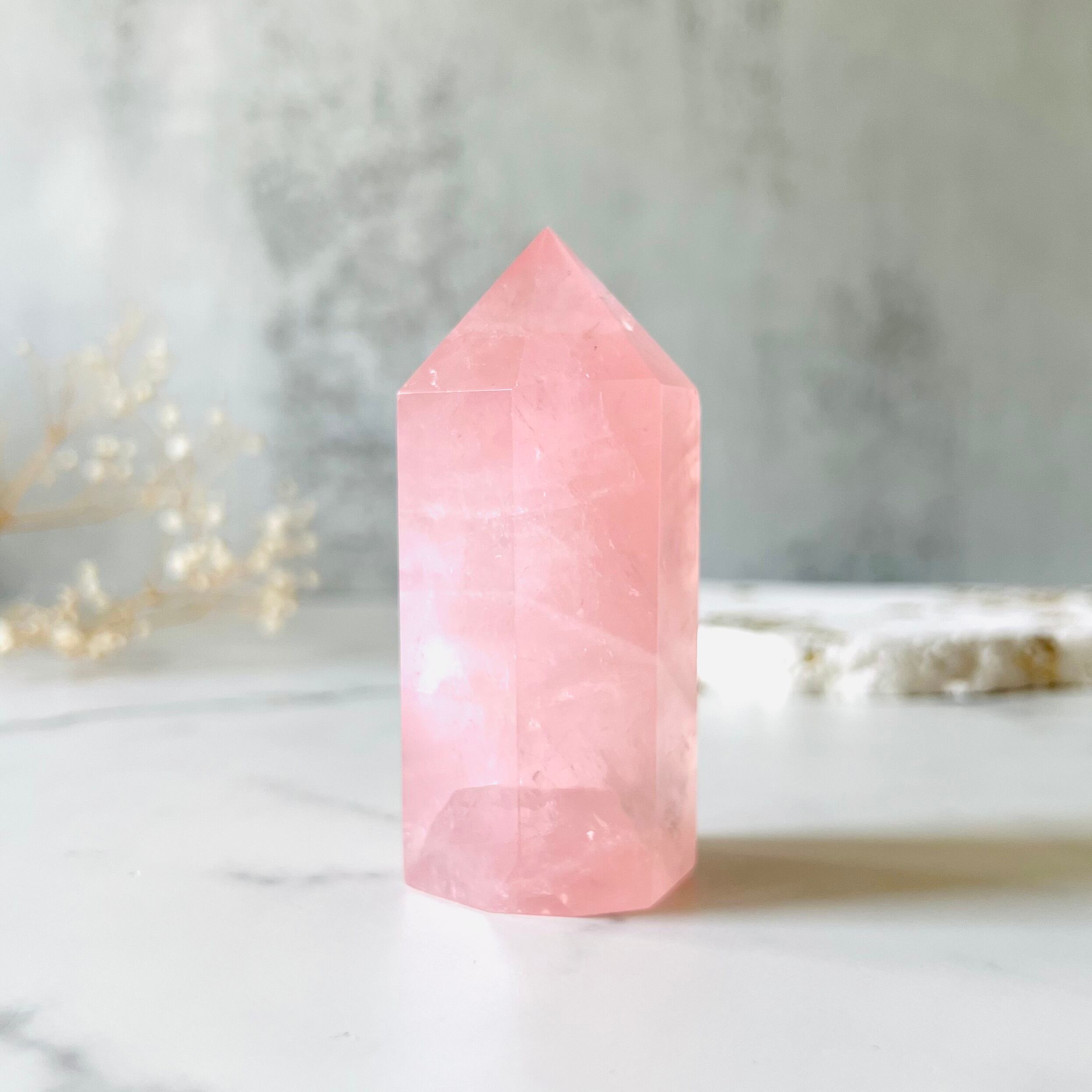 明るく濃いめのピンクが綺麗なローズクォーツタワーです。石の質感がすっきり綺麗でキラキラ輝きます。