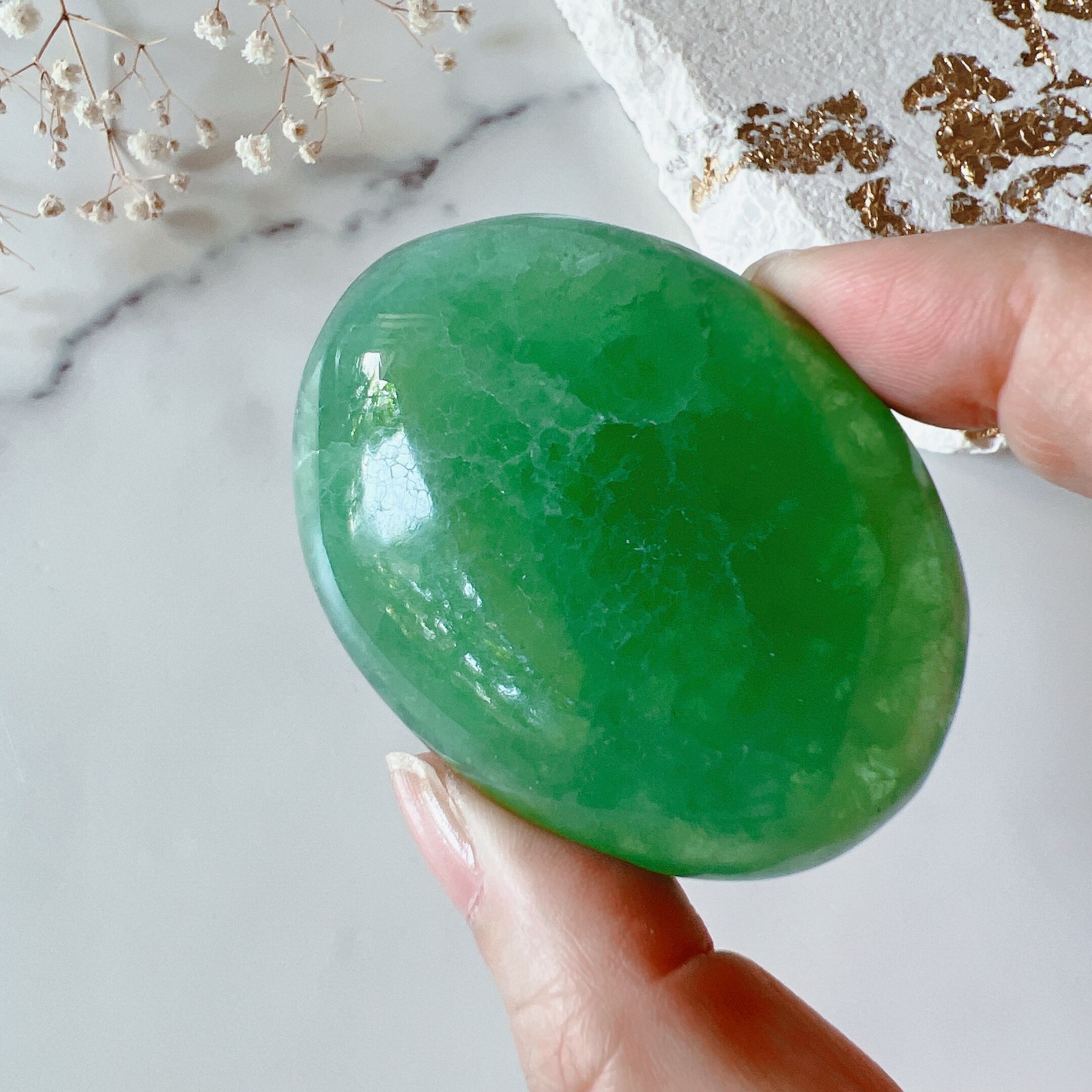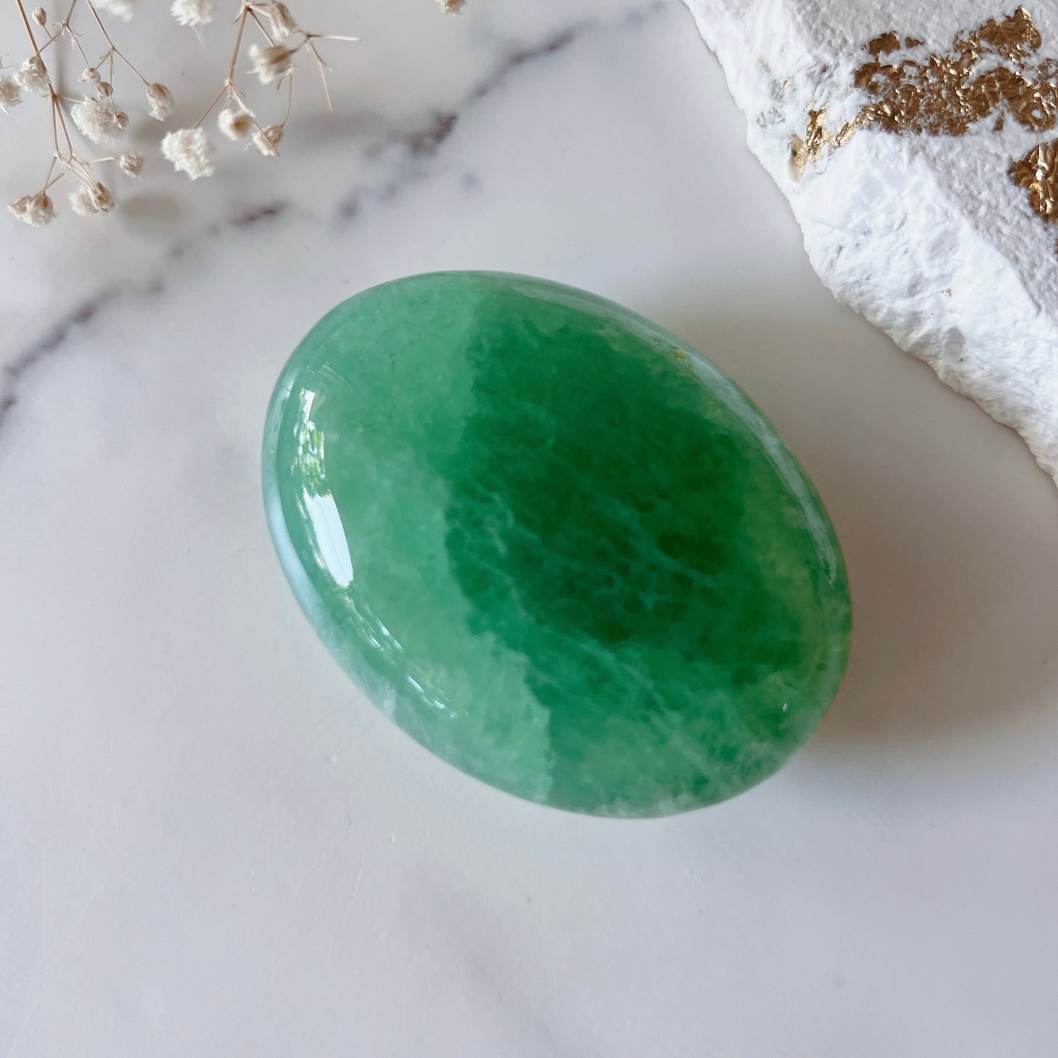 くっきりと鮮やかなグリーンが美しいグリーンフローライトのパームストーンです。