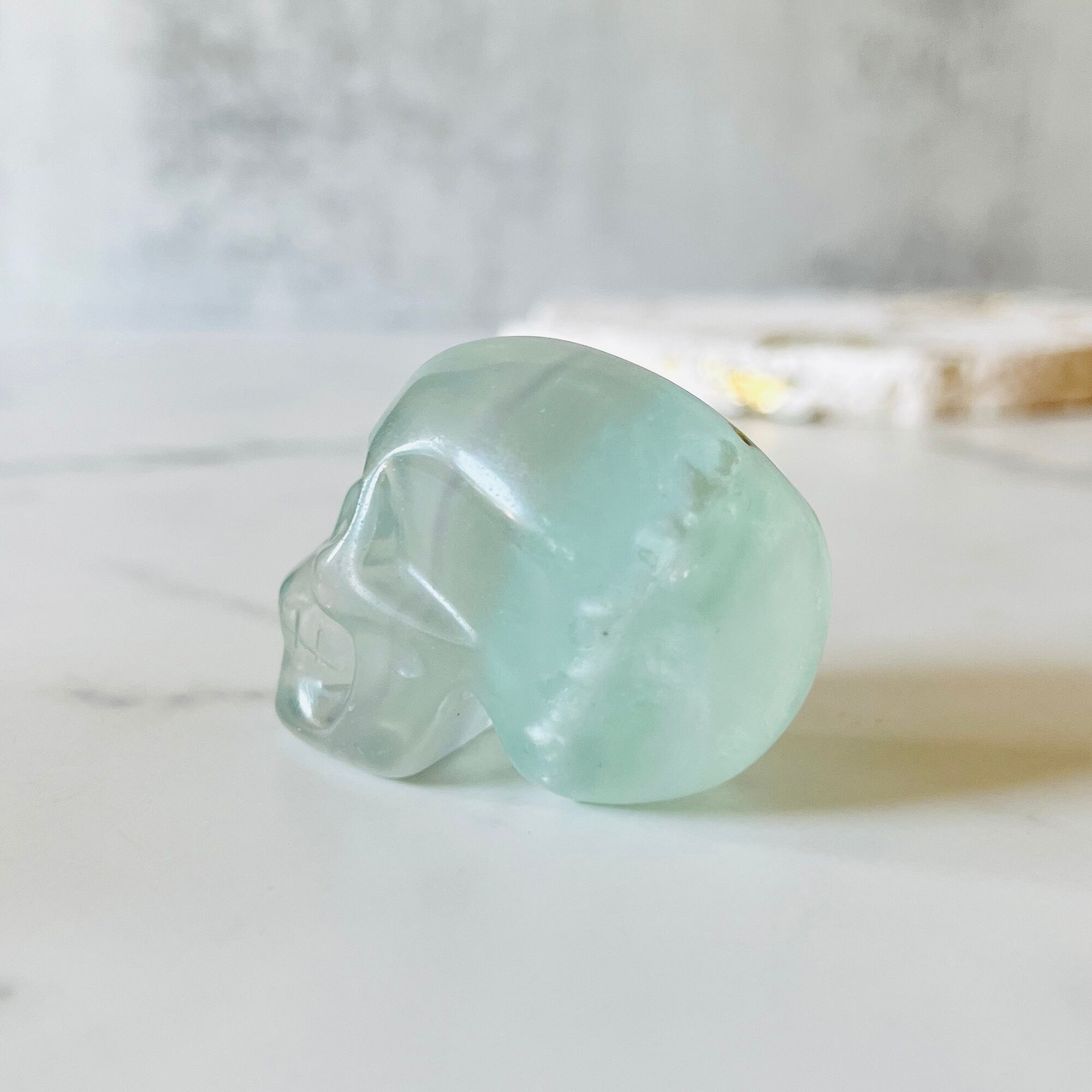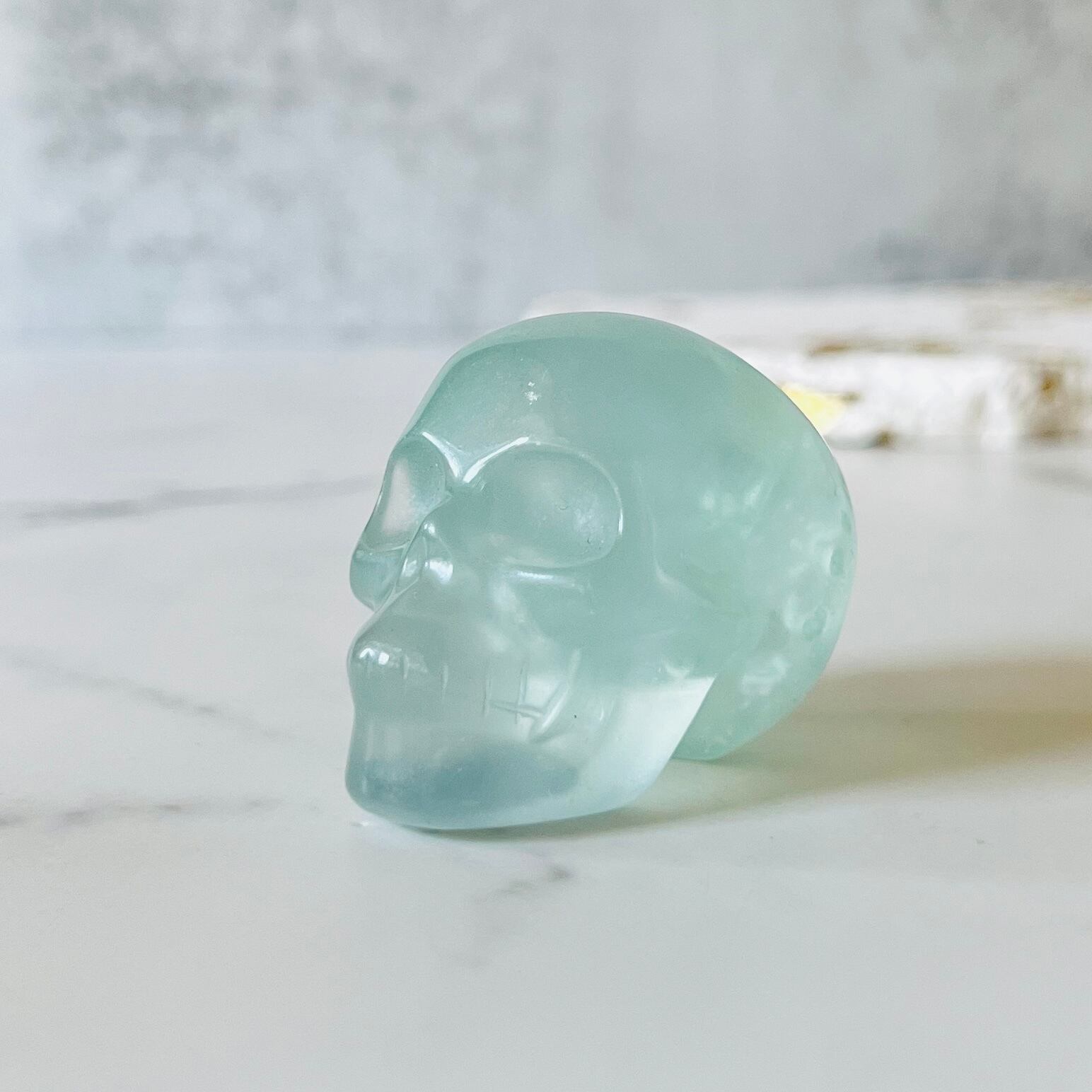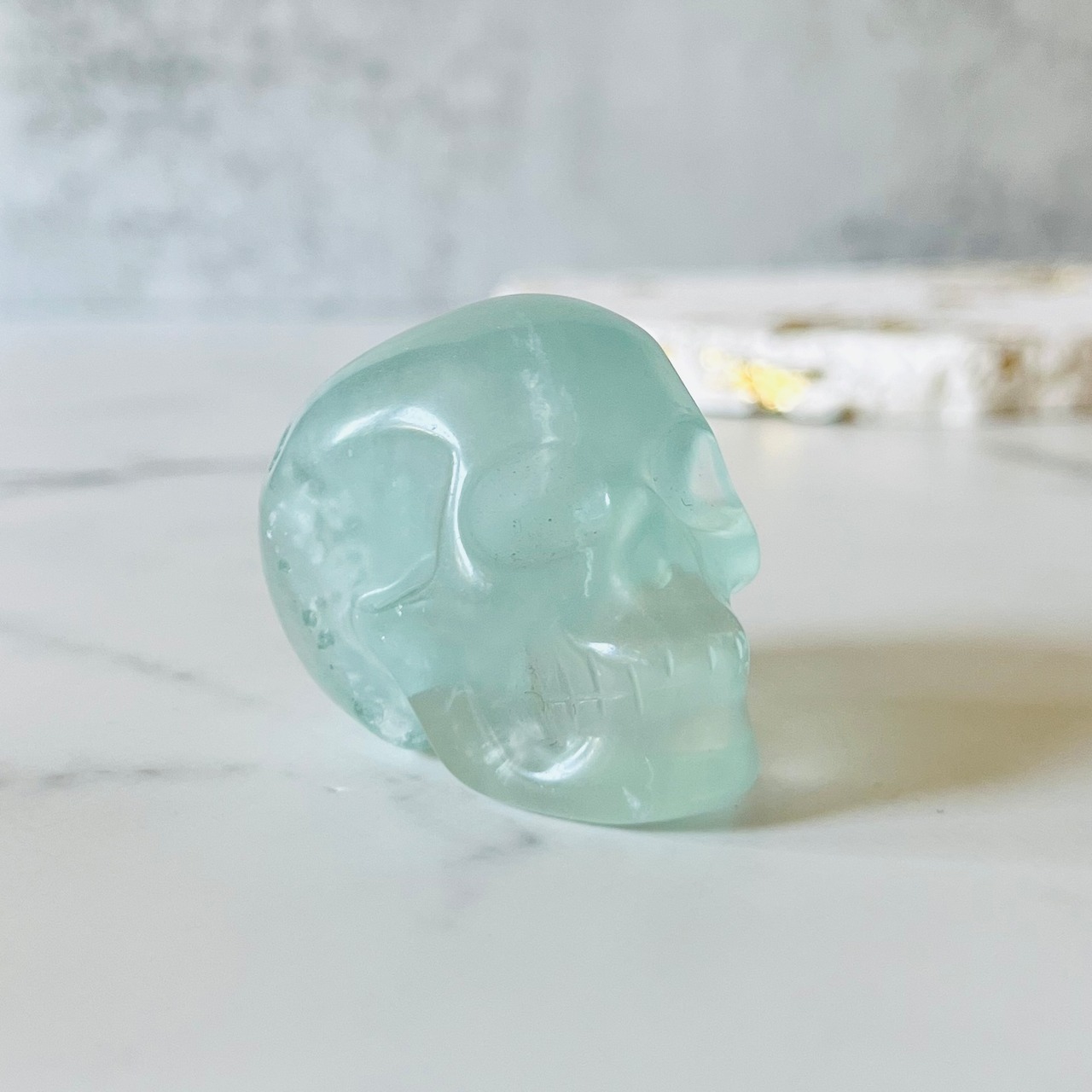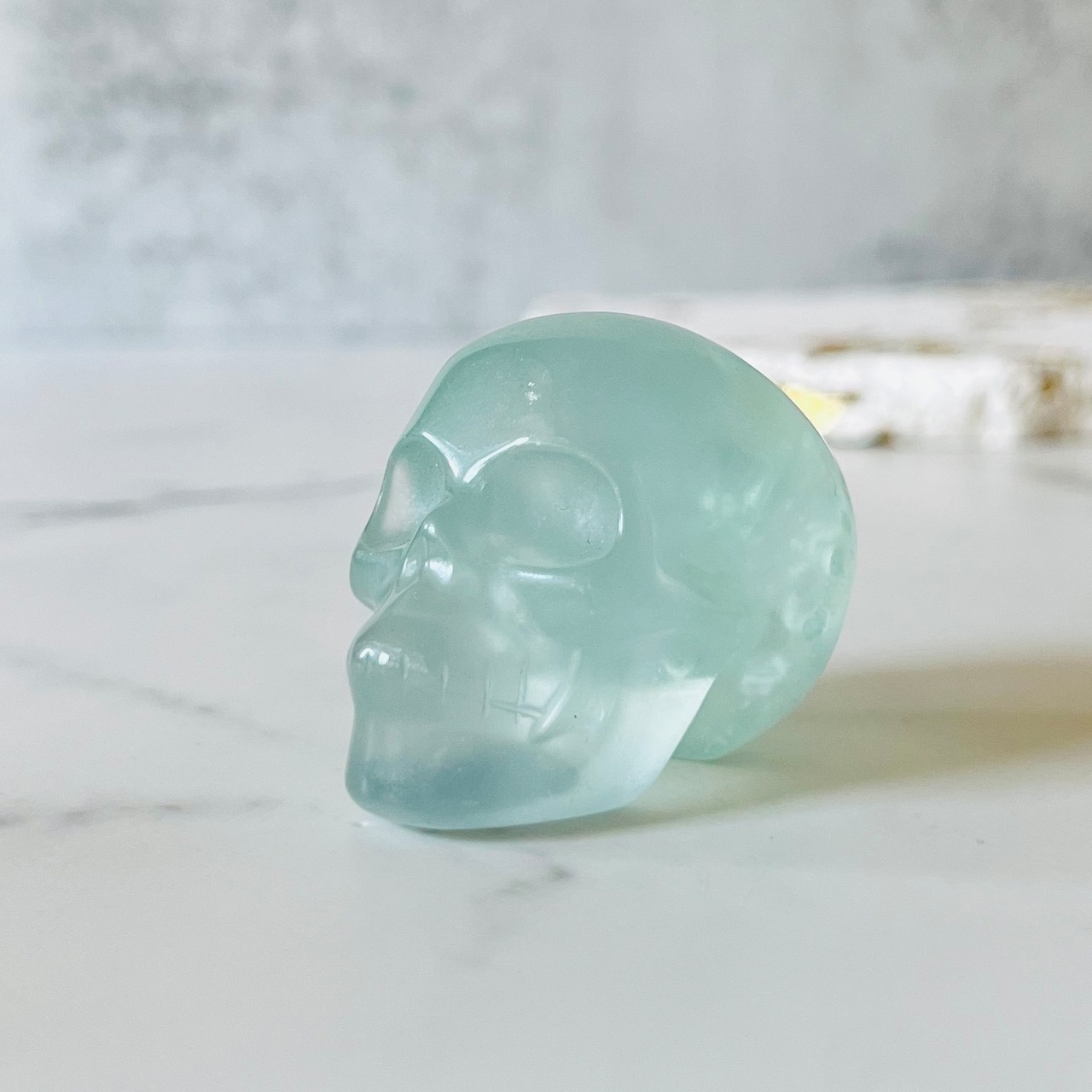 透明度の高いグリーンフローライトのスカルヘッドです。