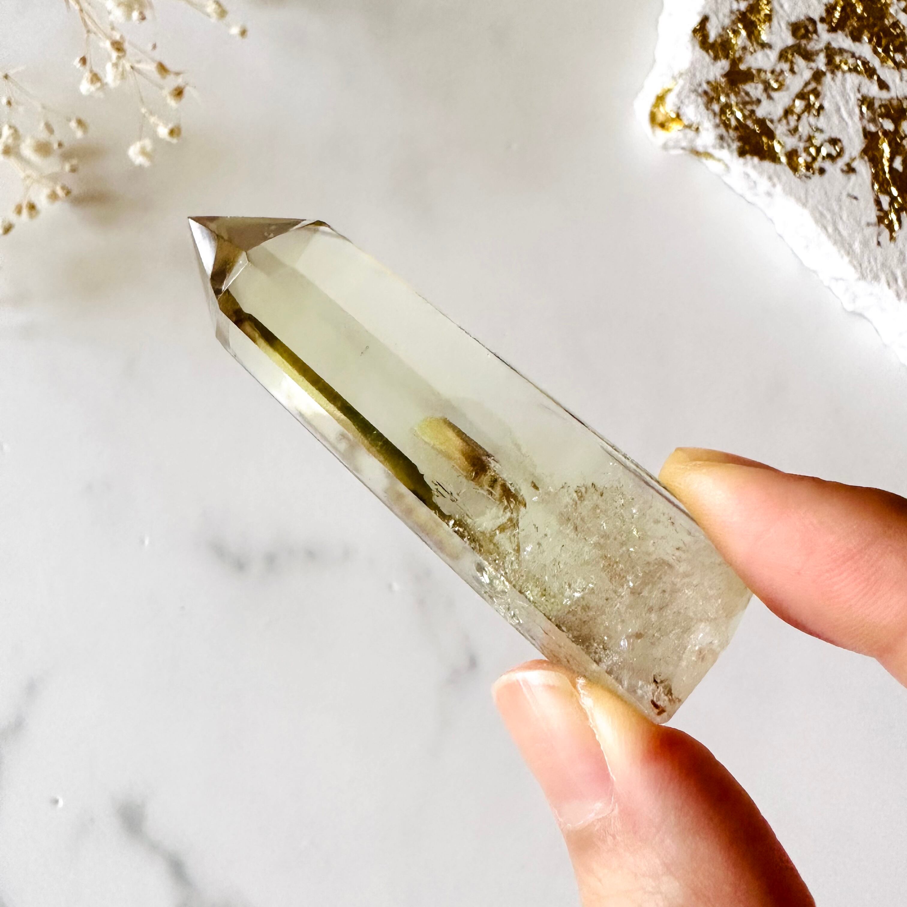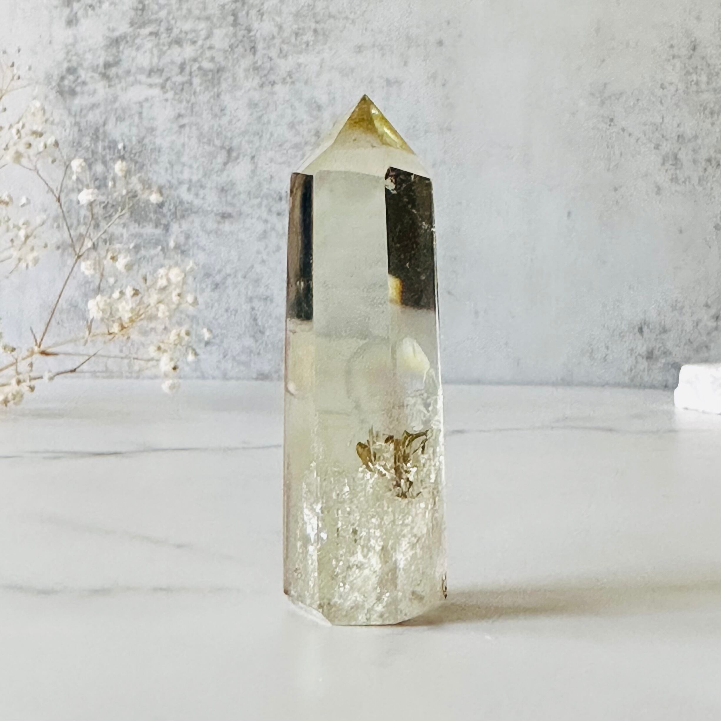 すっきりとした印象のクリアなクォーツで、足元のクラックが光の反射で虹を描き出します。