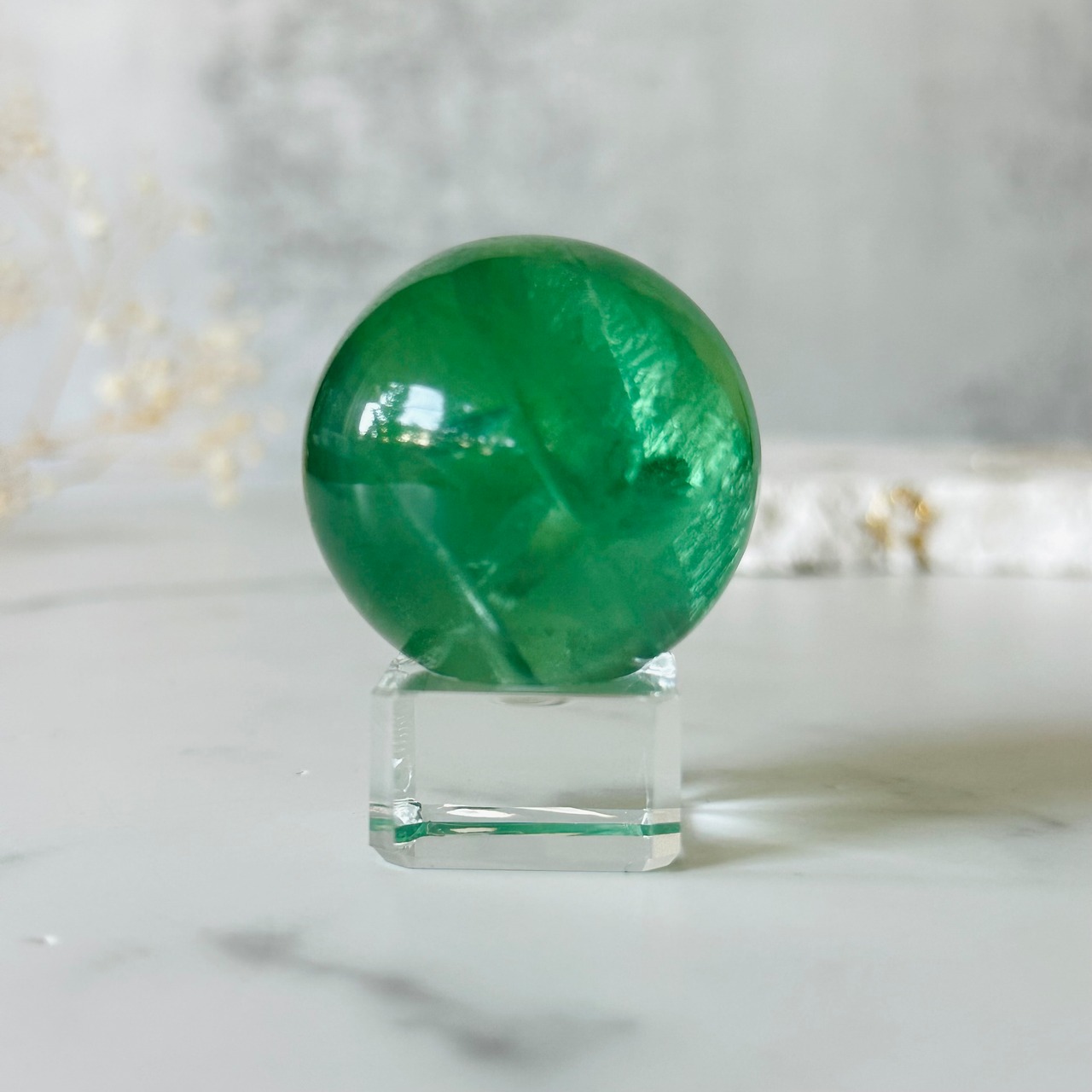 透明度の高いグリーンフローライトスフィアです。
