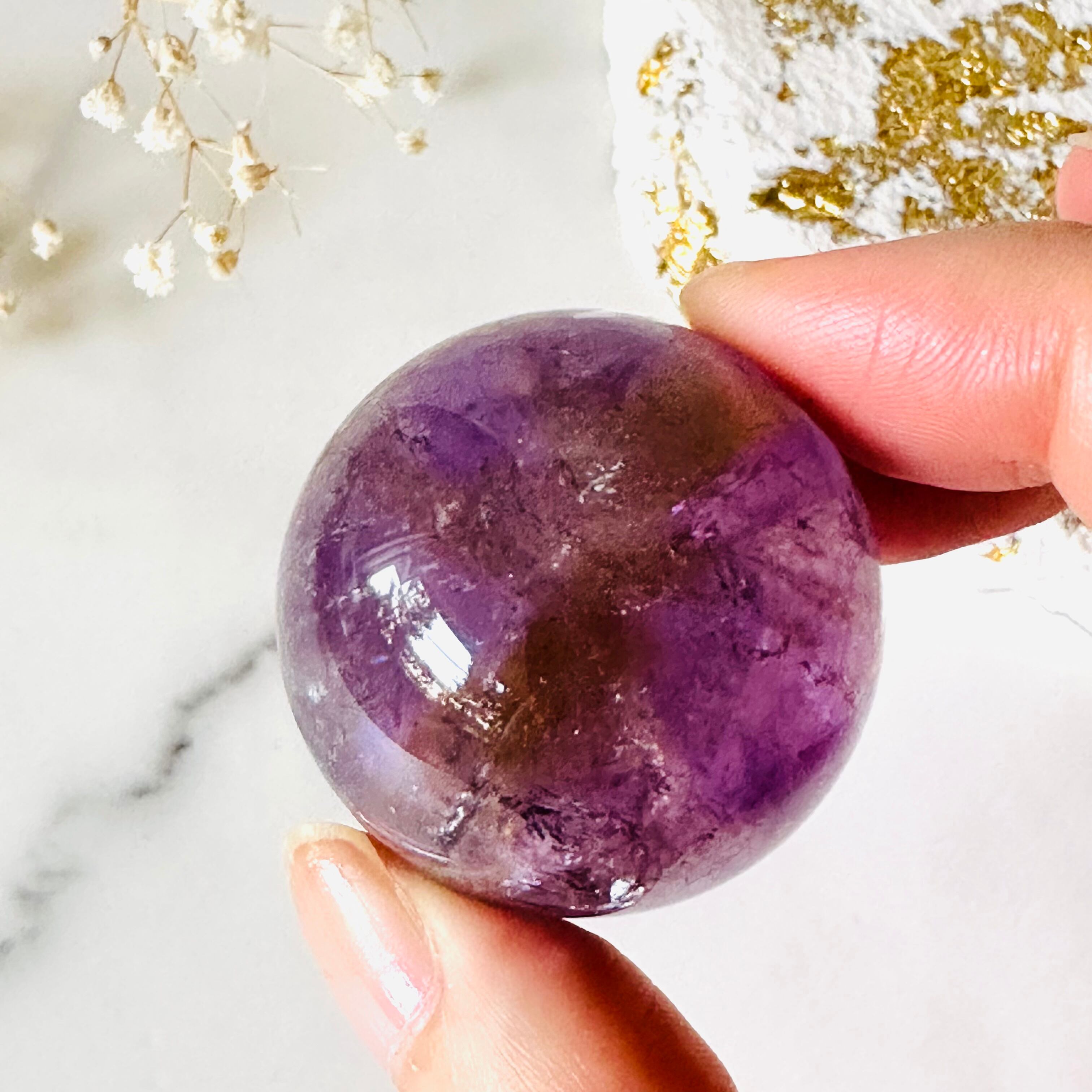 アメジストの紫とシトリンの黄金色のクォーツが混ざり合い、みる角度によって色合いや表情の変化を見せてくれる美しいアメトリンのスフィア。虹も入ります。