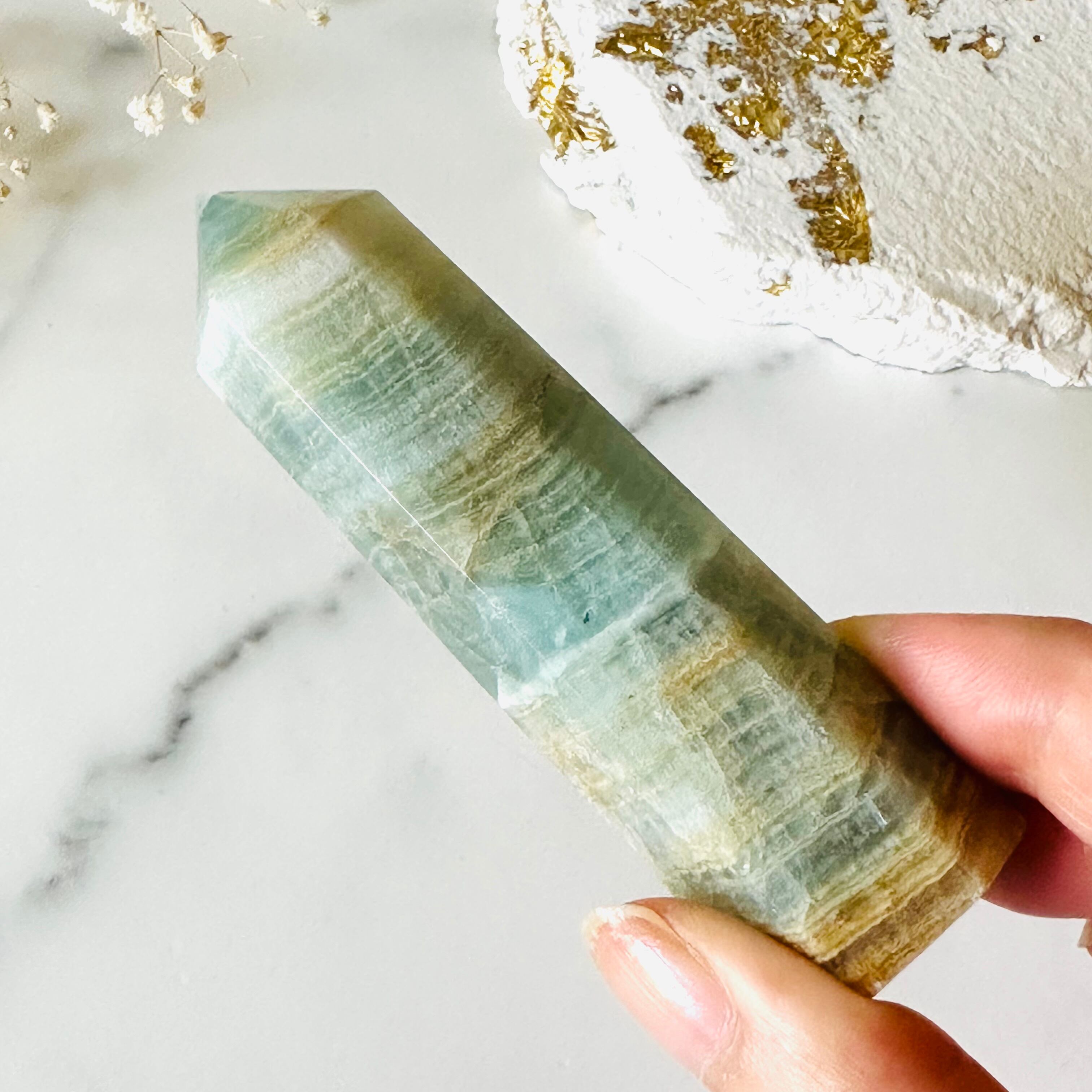 何層にも重なり合ったブルーとブラウンの縞模様が美しい色と模様を作り出しています。艶もありとても綺麗なタワーです。