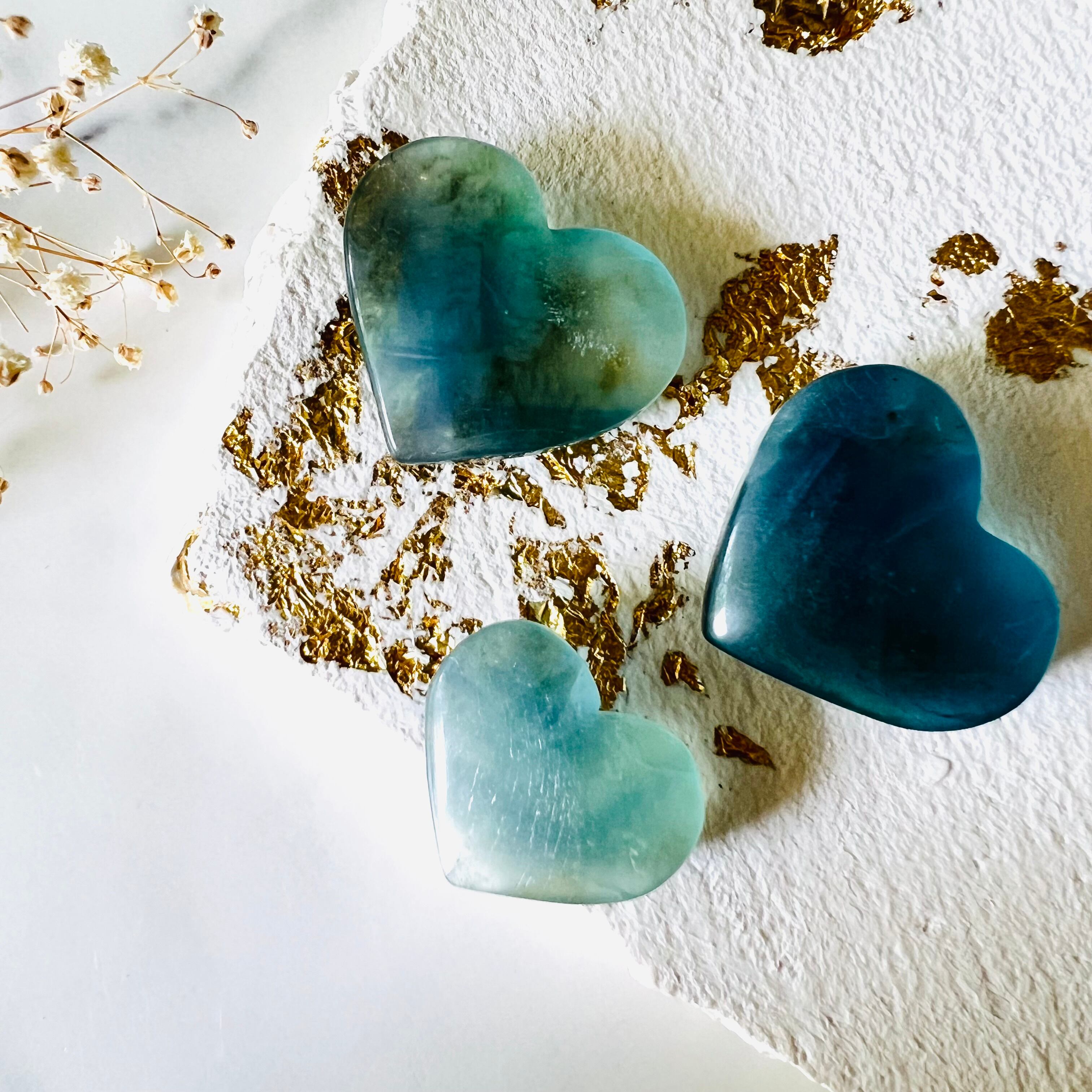 ブルーの陰影がきれいなブルーフローライトのハート型ストーンです。濃いめのブルーや淡いブルー、個体の中にも濃淡があります。音のない静謐な海中の世界を連想させるような幻想的なアイテムです。