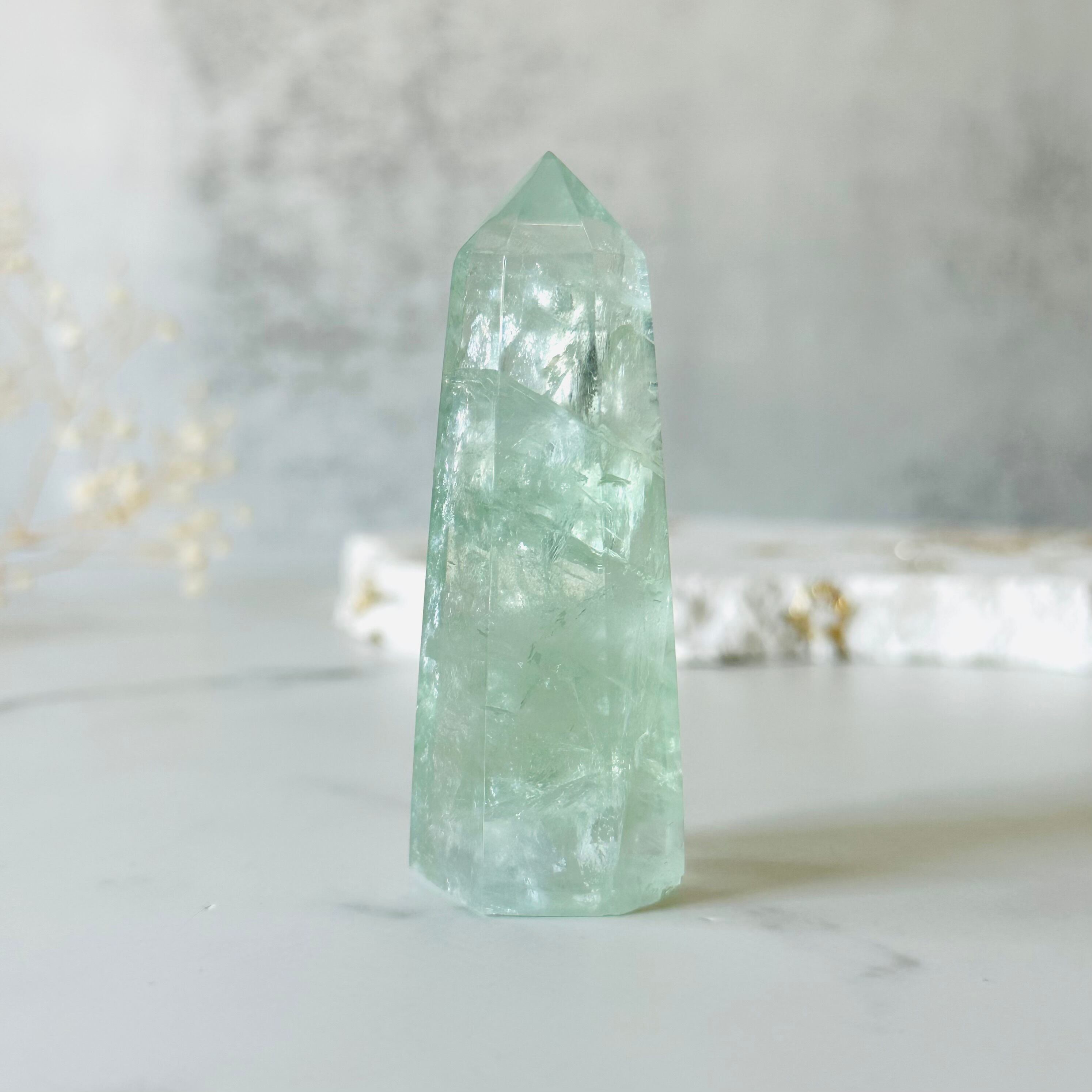 透明度の高いグリーンフローライトのタワーです。透き通ったミントグリーンが美しく、光を透過してすっきりと涼しげなアイテムです。美しい虹がたっぷりと入ります。