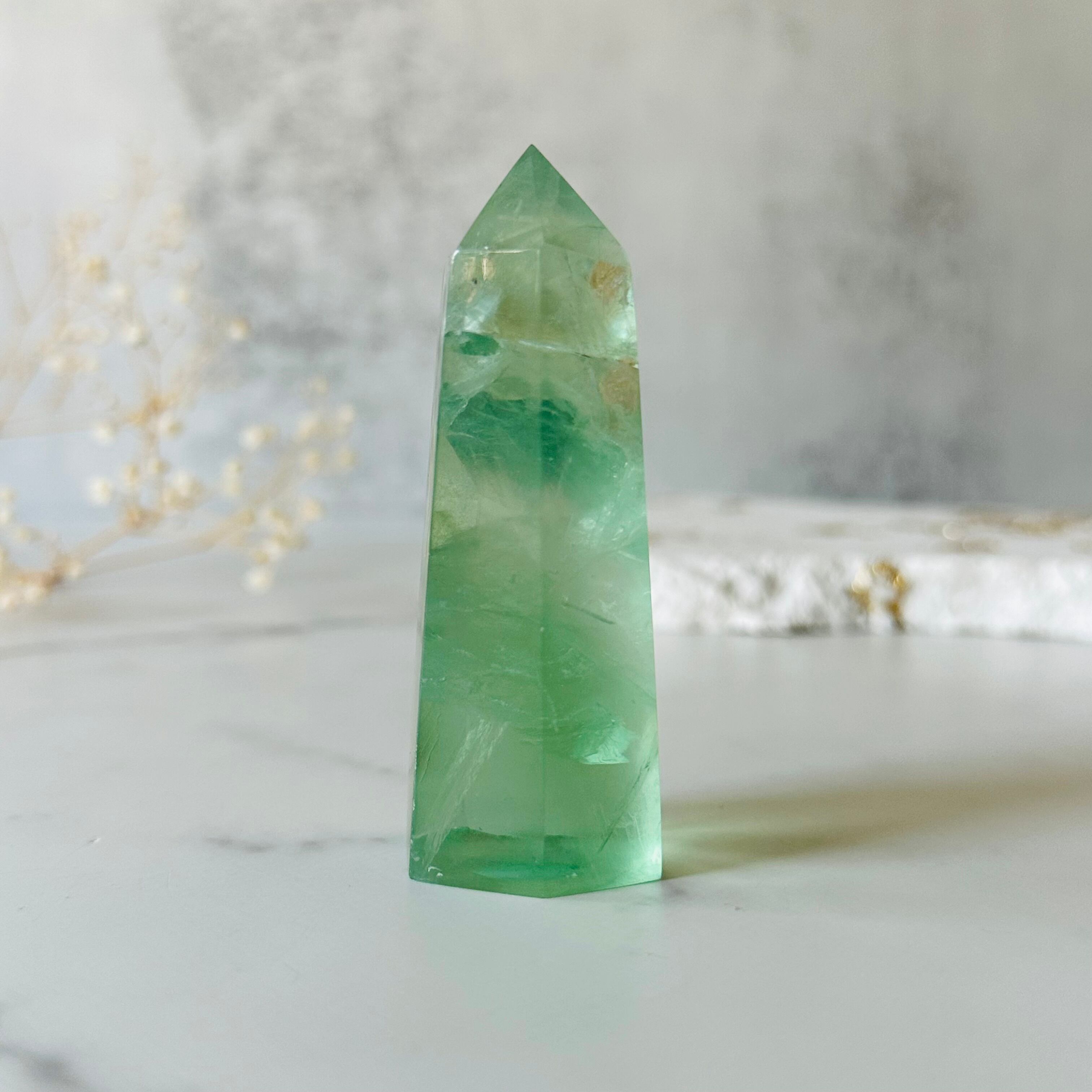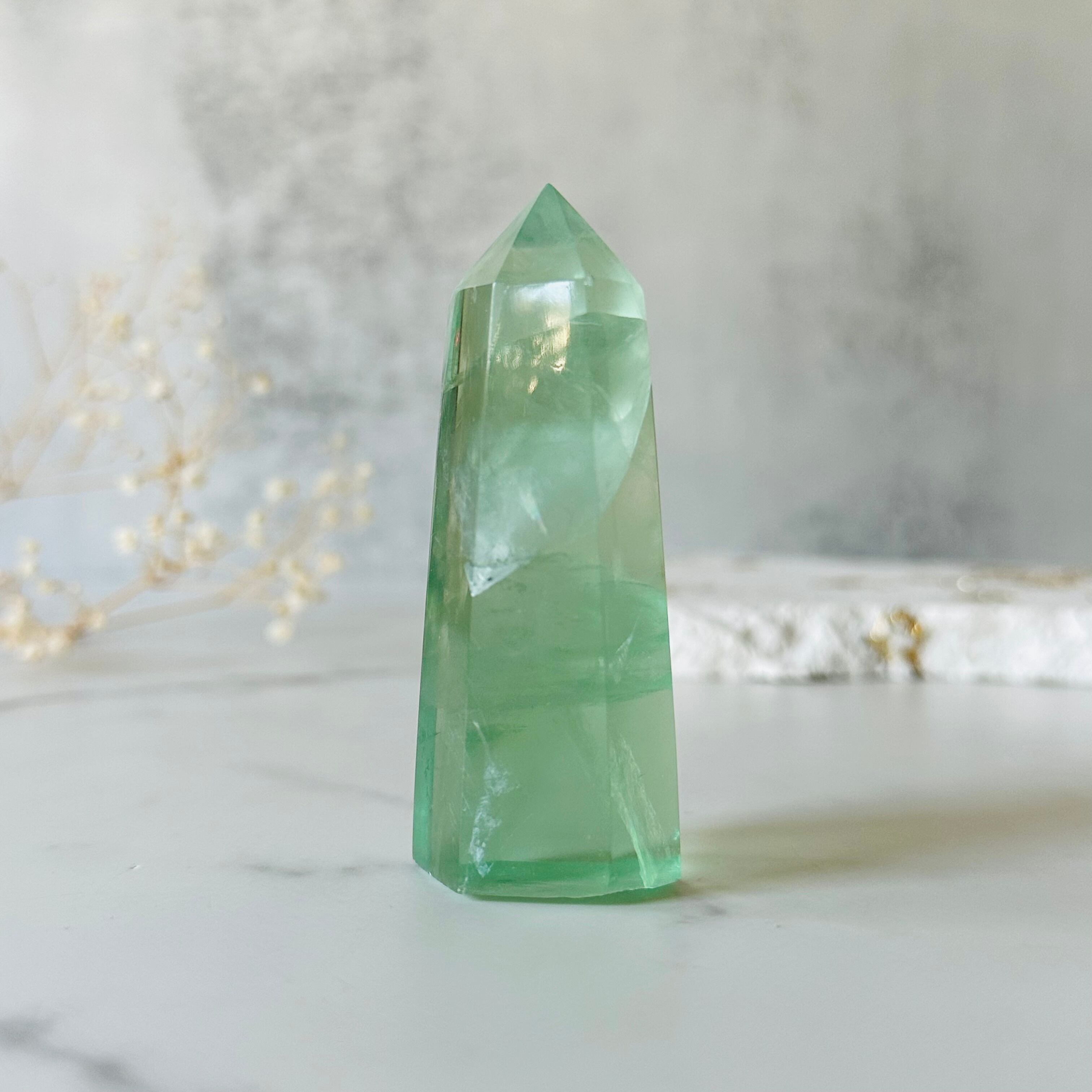透明度の高いグリーンフローライトのタワーです。透き通った鮮やかなグリーンが美しく、光を透過してすっきりと涼しげなアイテムです。美しい虹も入ります。