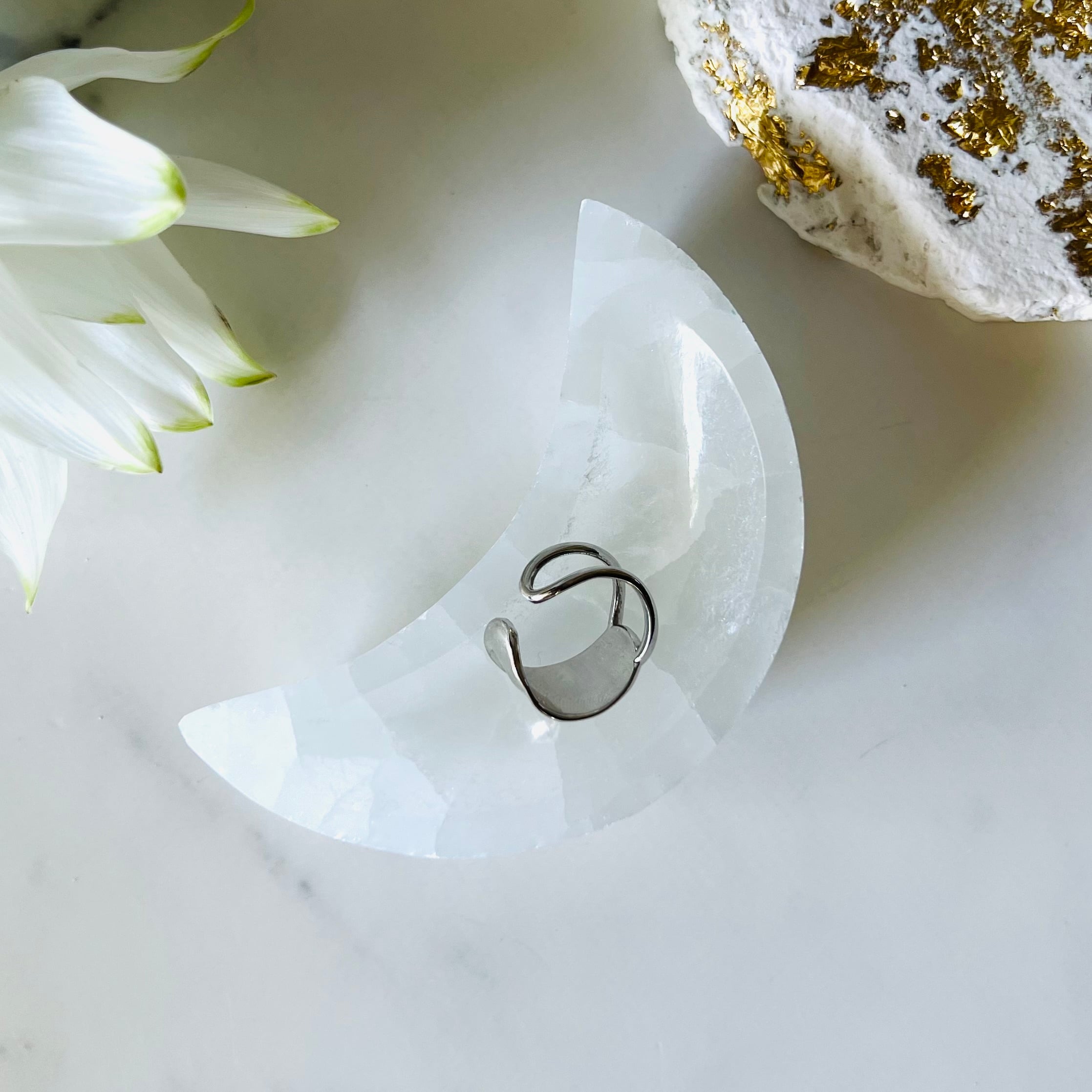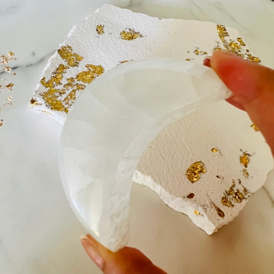 月のように清らかで美しい光を放つセレナイトの月型トレイです。