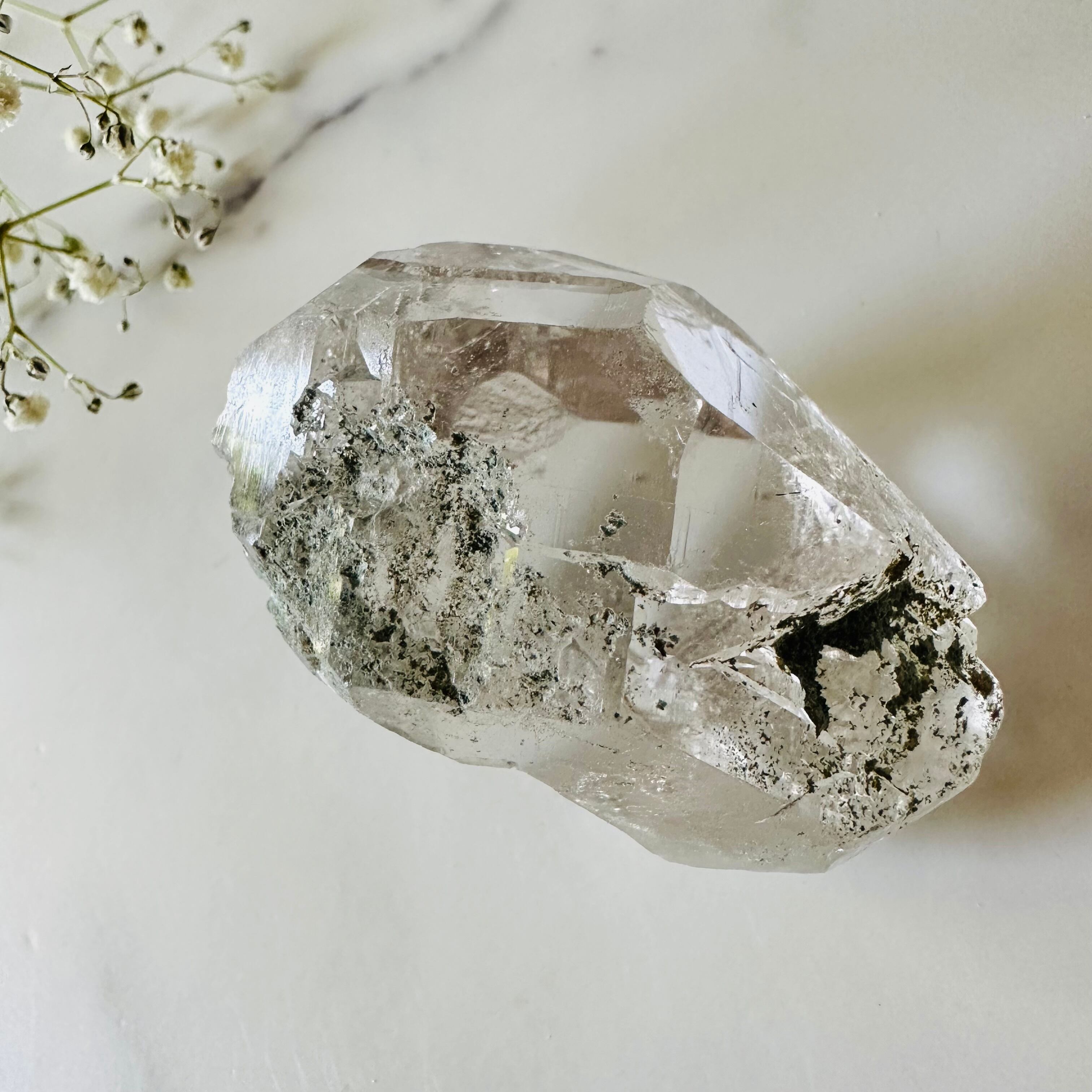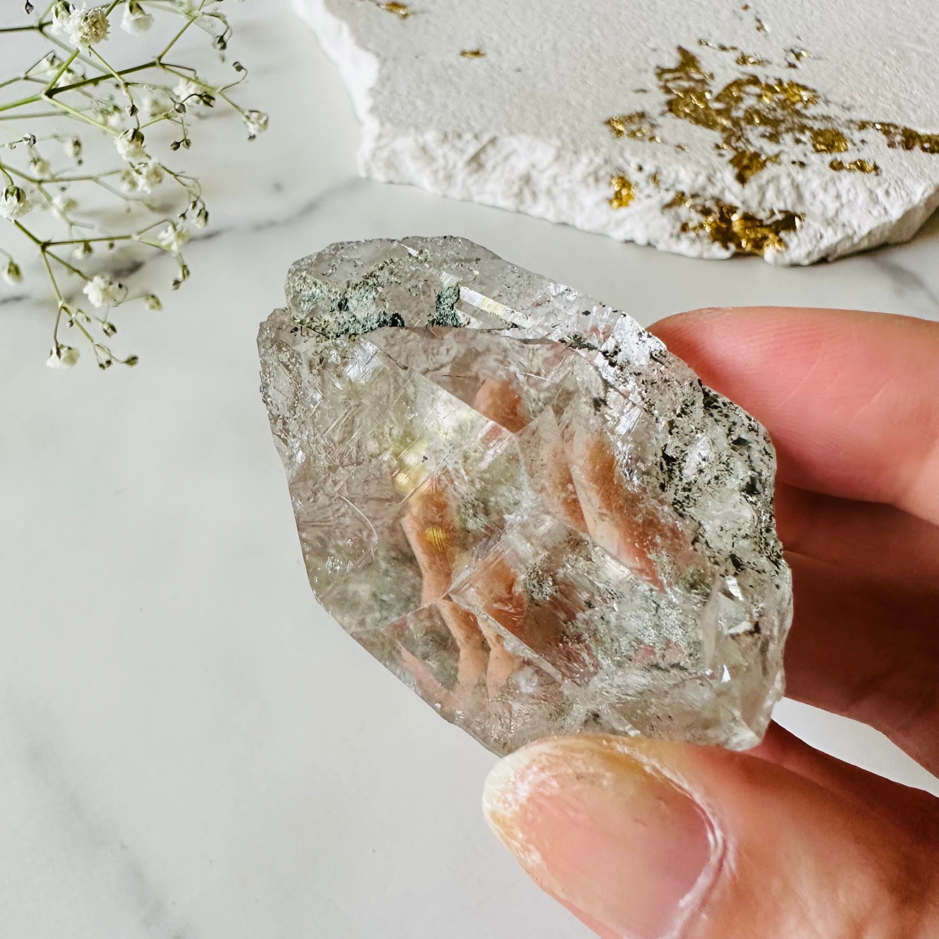 クローライトのモスグリーンと水晶のコントラストが綺麗で、極上の艶テリを兼ね備えた一級品です。まるで清流が流れる深い森にいるような気持ちにさせてくれるクリスタルです。瞑想や自己対話の際にそばにおけば、より深い気づきへと導いてくれることでしょう。