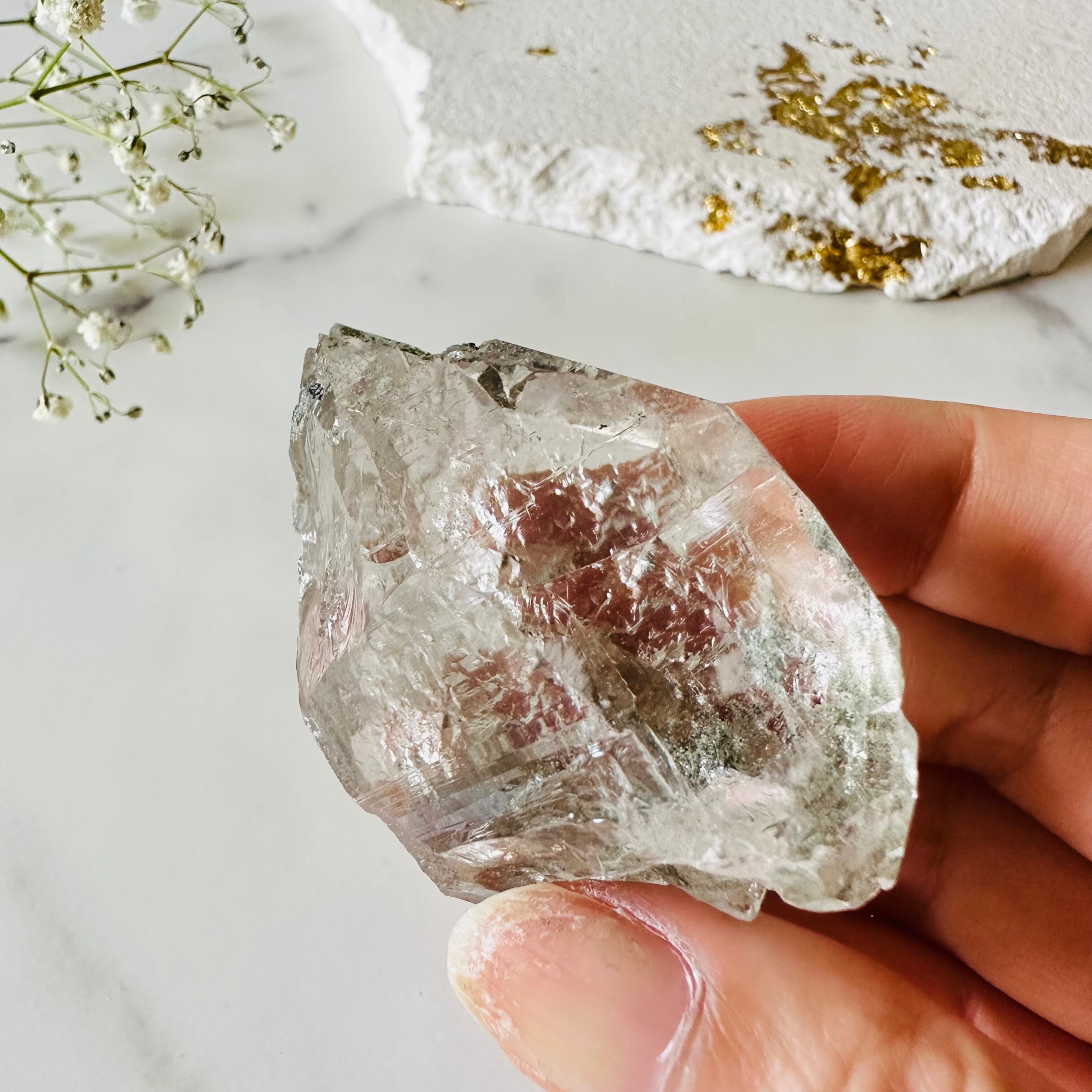 地殻変動等で一度欠損した部分が再結晶化したものをいいます。折れて再生するのはとても珍しく、奇跡的に条件が整ったときにだけ、断面に結晶の赤ちゃんのようなものが成長します。