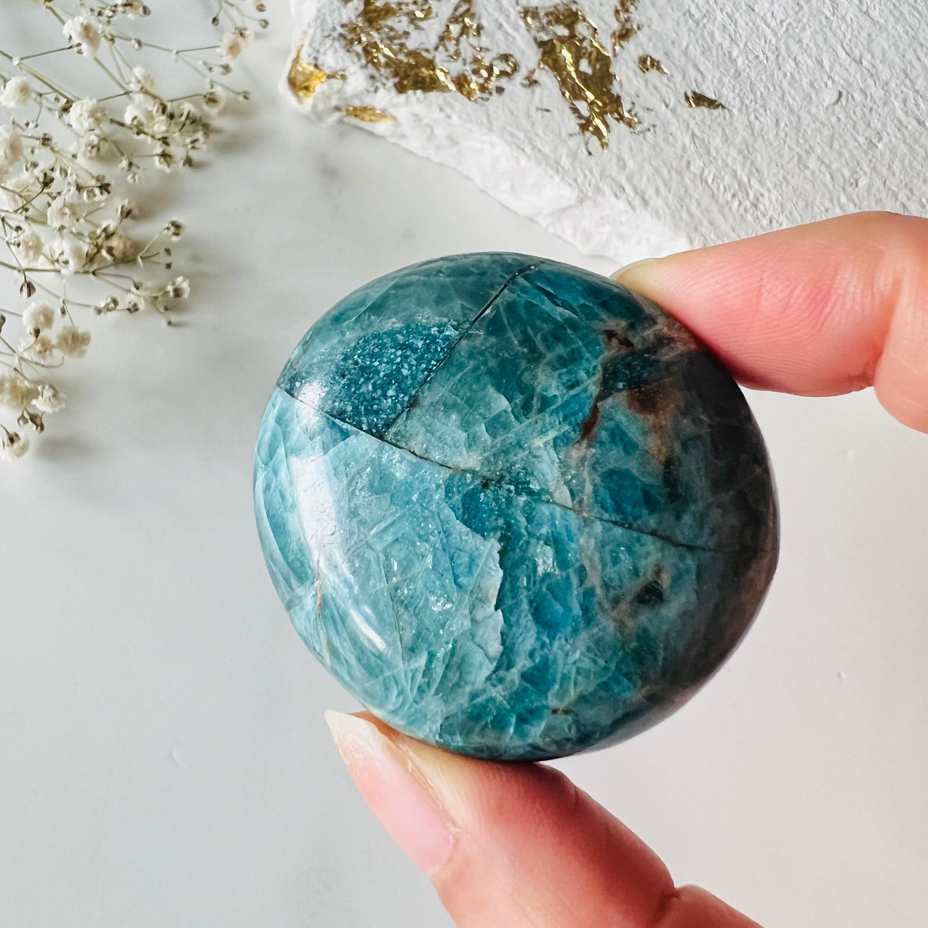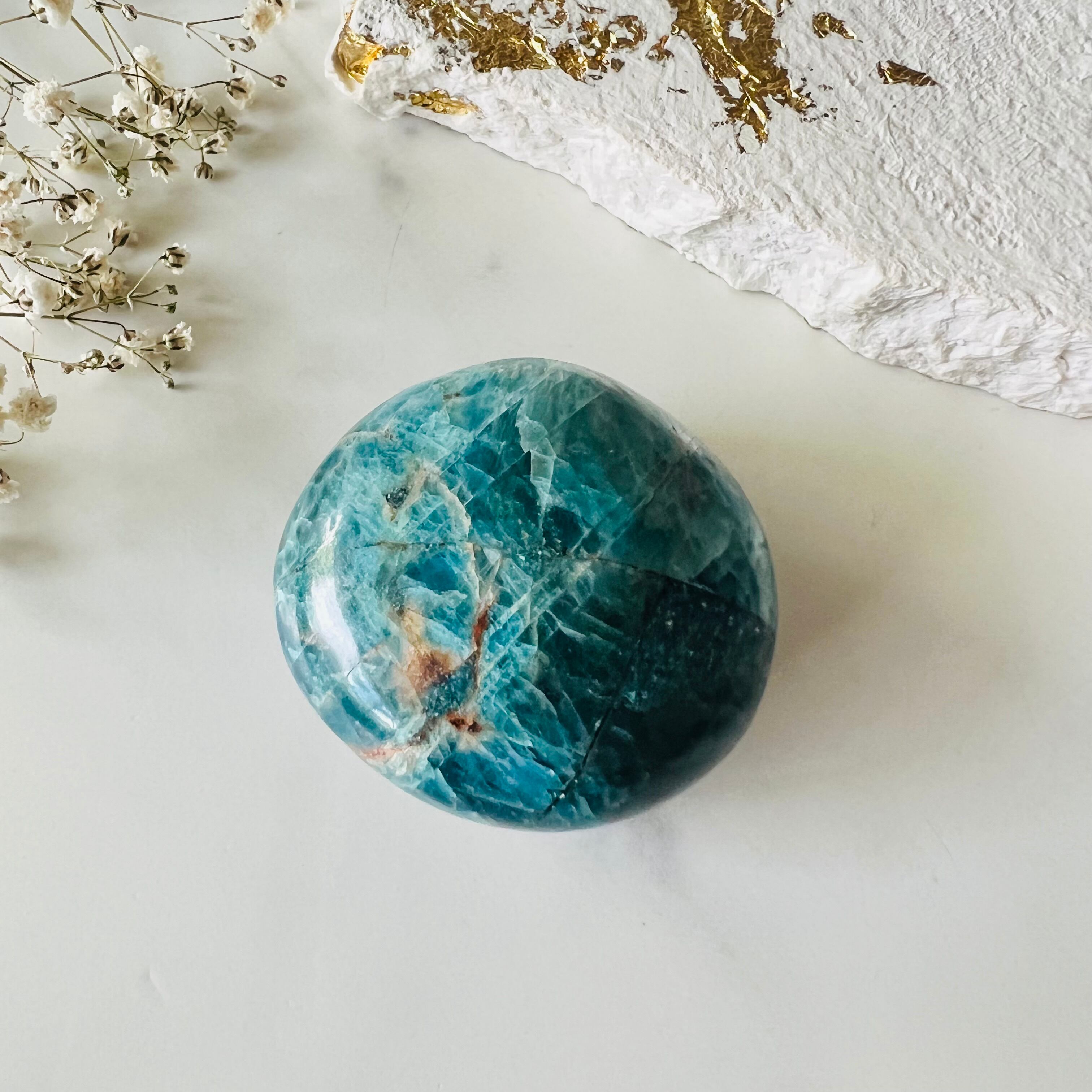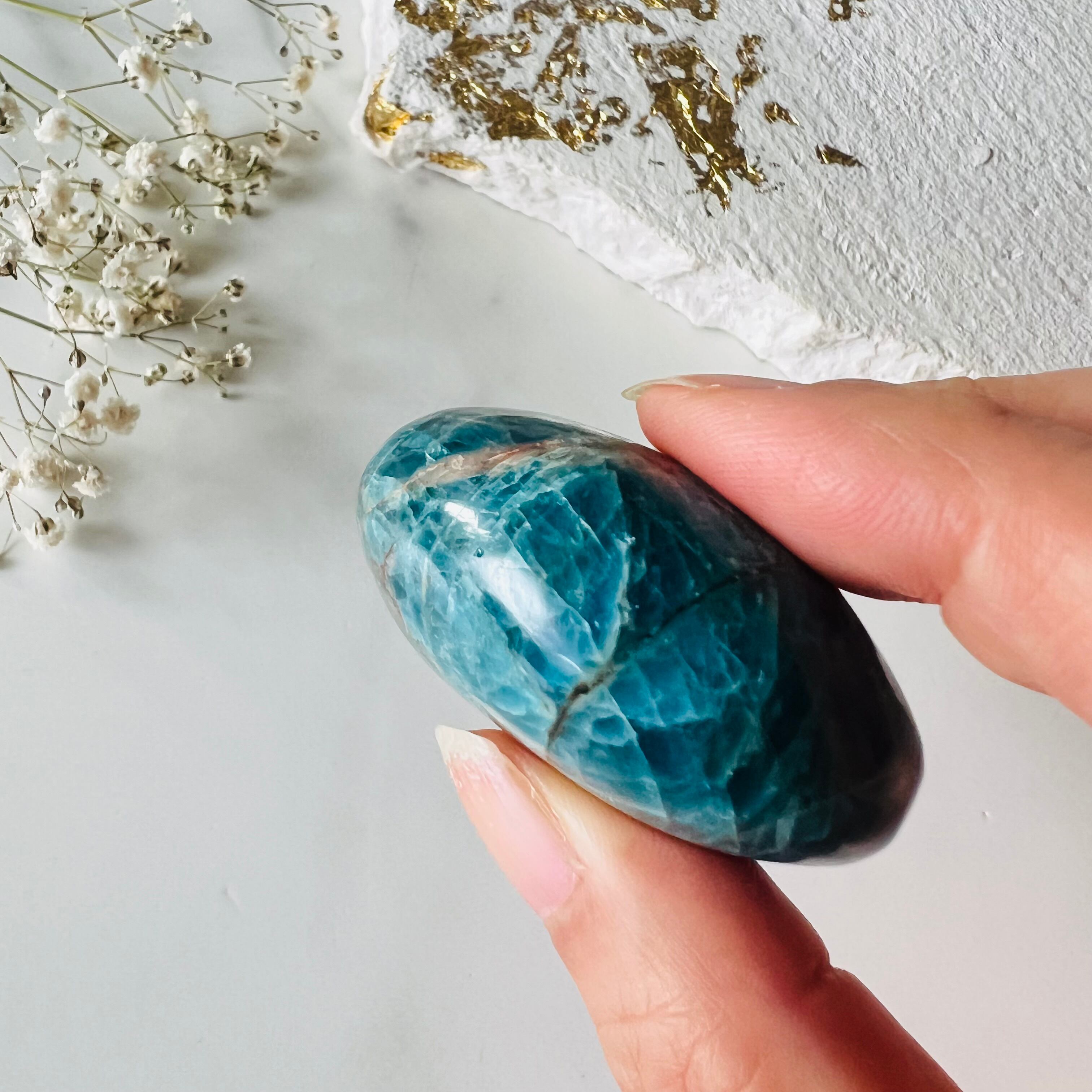 濃いブルーとシルバーのシラーが美しいブルーアパタイトのパームストーンです。