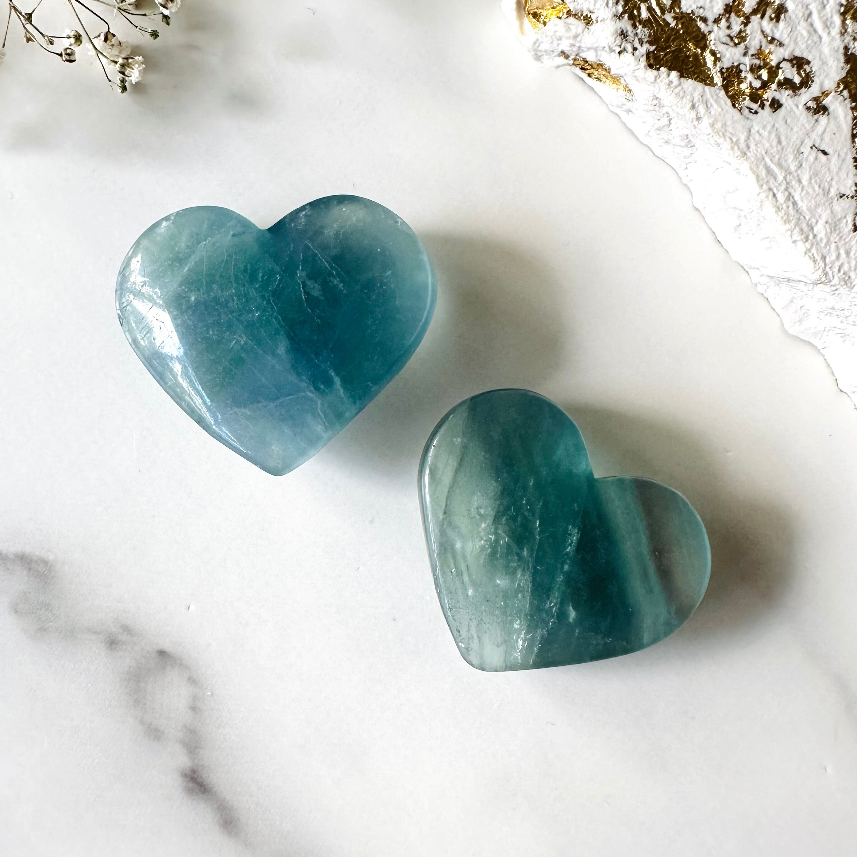 ブルーの陰影がきれいなブルーフローライトのハート型ストーンです。濃いめのブルーや淡いブルー、個体の中にも濃淡があります。音のない静謐な海中の世界を連想させるような幻想的なアイテムです。