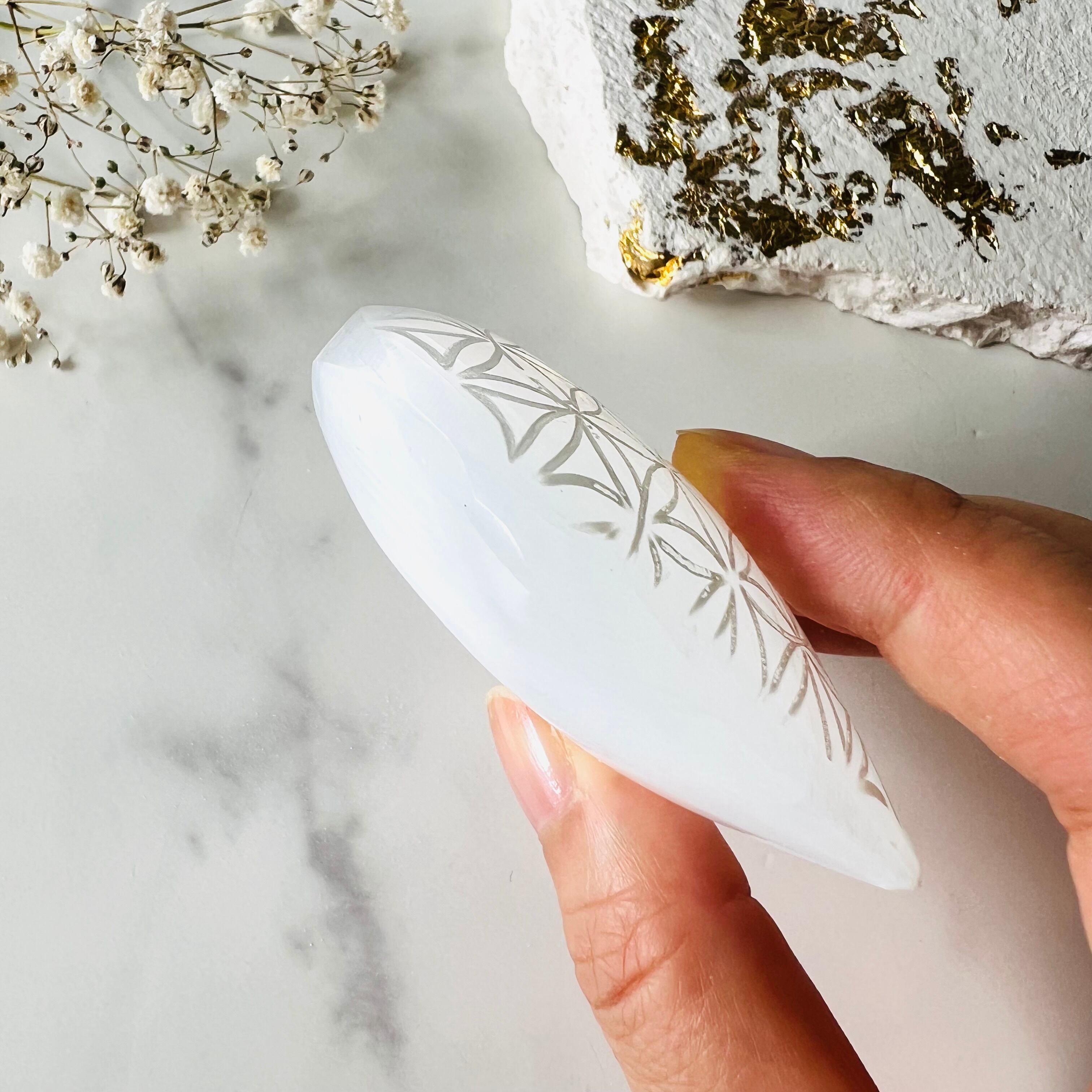 神聖幾何学・フラワーオブライフの模様が入ったセレナイトのハート型パームストーンです。