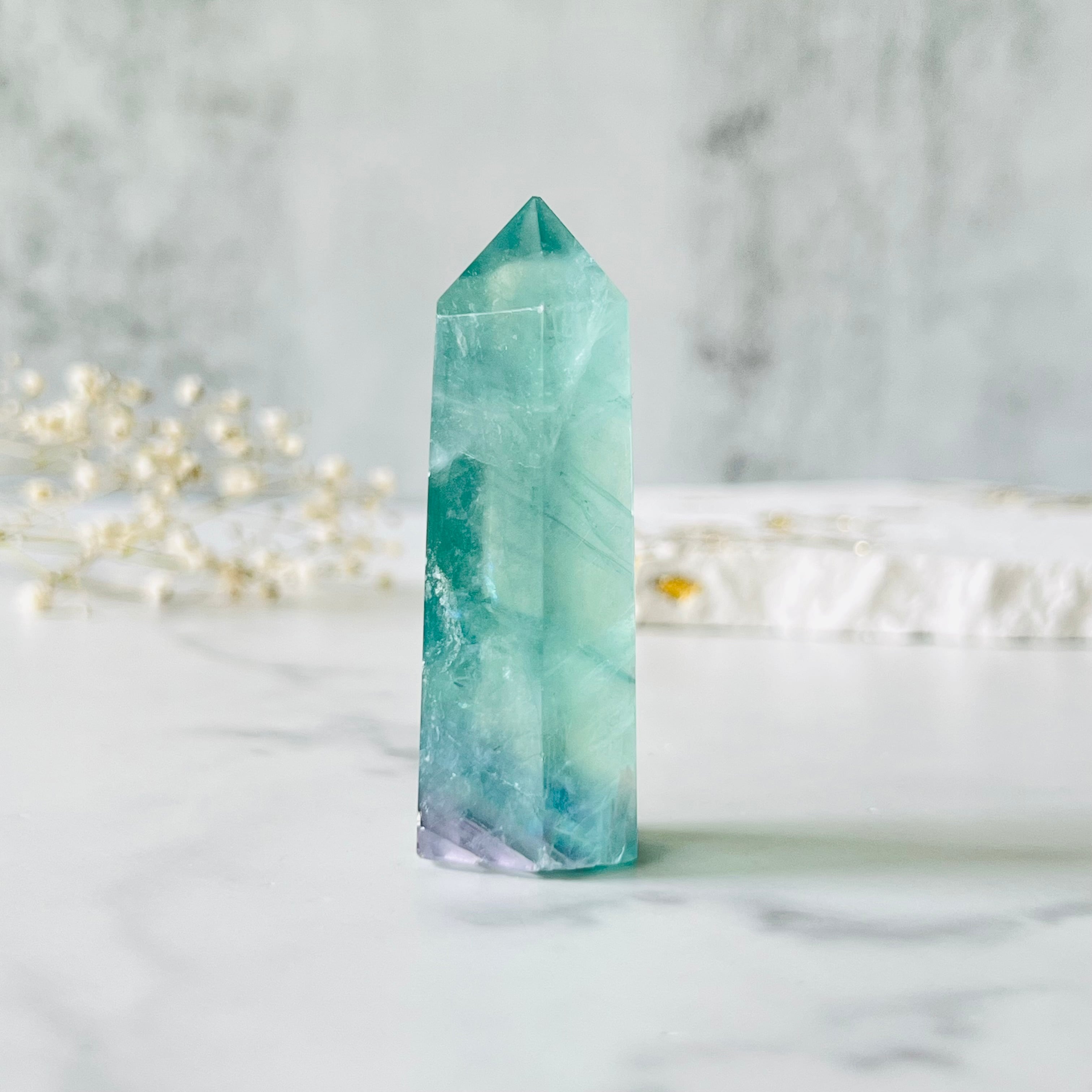 透明度の高いフローライトのタワーです。透き通った鮮やかなブルーグリーンが美しく、足元に少しだけパープルが入っています。光を透過してすっきりと涼しげなアイテムです。美しい虹もたっぷりと入ります。