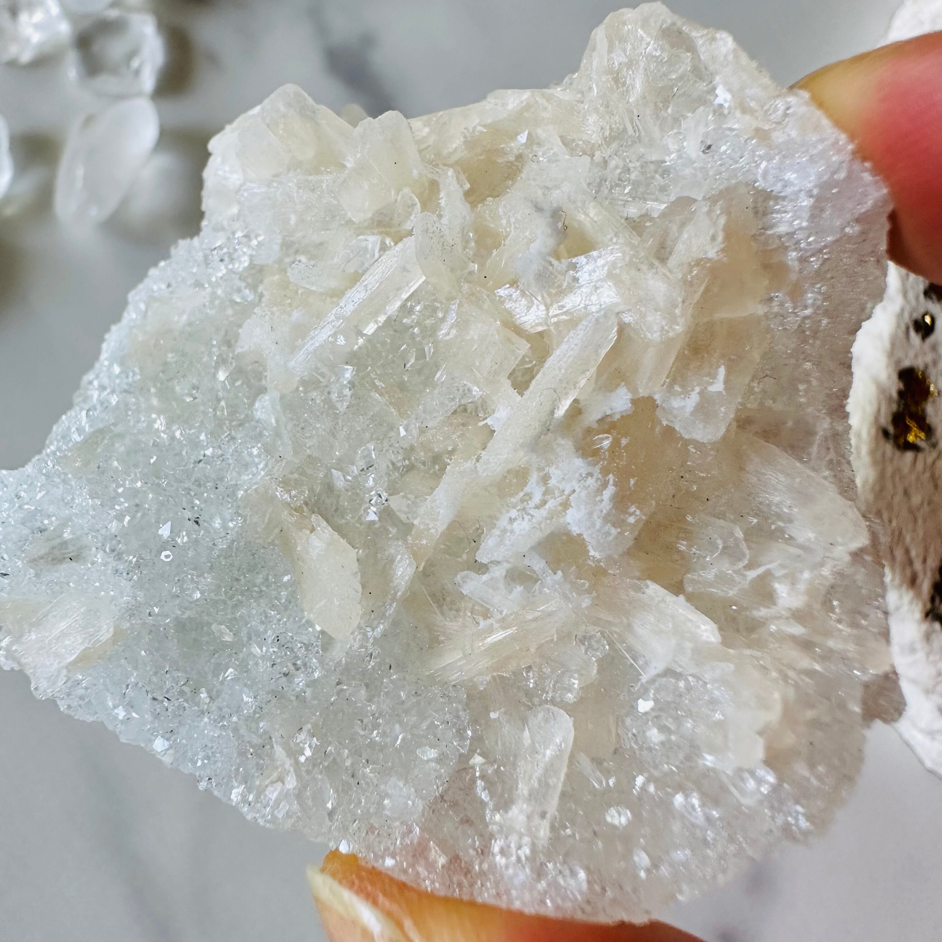 薄いシート状でキラキラした姿は、グラニュー糖をまぶした砂糖菓子のようでもあり、手のひらに乗せたらスッと溶けてしまう儚い雪の結晶のようでもあります。淡く繊細なピンク色のスティルバイトが共生していて、可愛すぎるビジュにキュン!胸がときめきます。