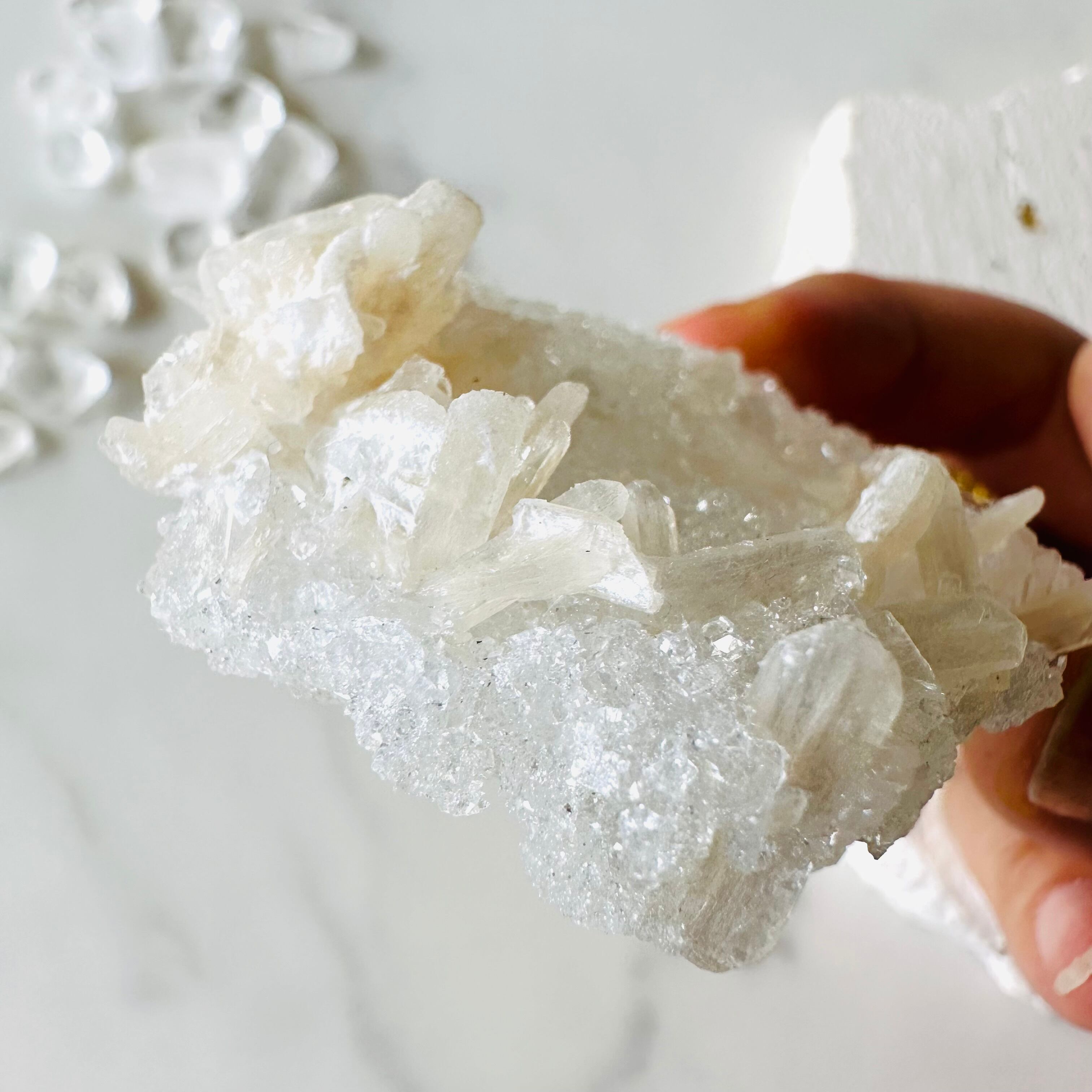 薄いシート状でキラキラした姿は、グラニュー糖をまぶした砂糖菓子のようでもあり、手のひらに乗せたらスッと溶けてしまう儚い雪の結晶のようでもあります。淡く繊細なピンク色のスティルバイトが共生していて、可愛すぎるビジュにキュン!胸がときめきます。
