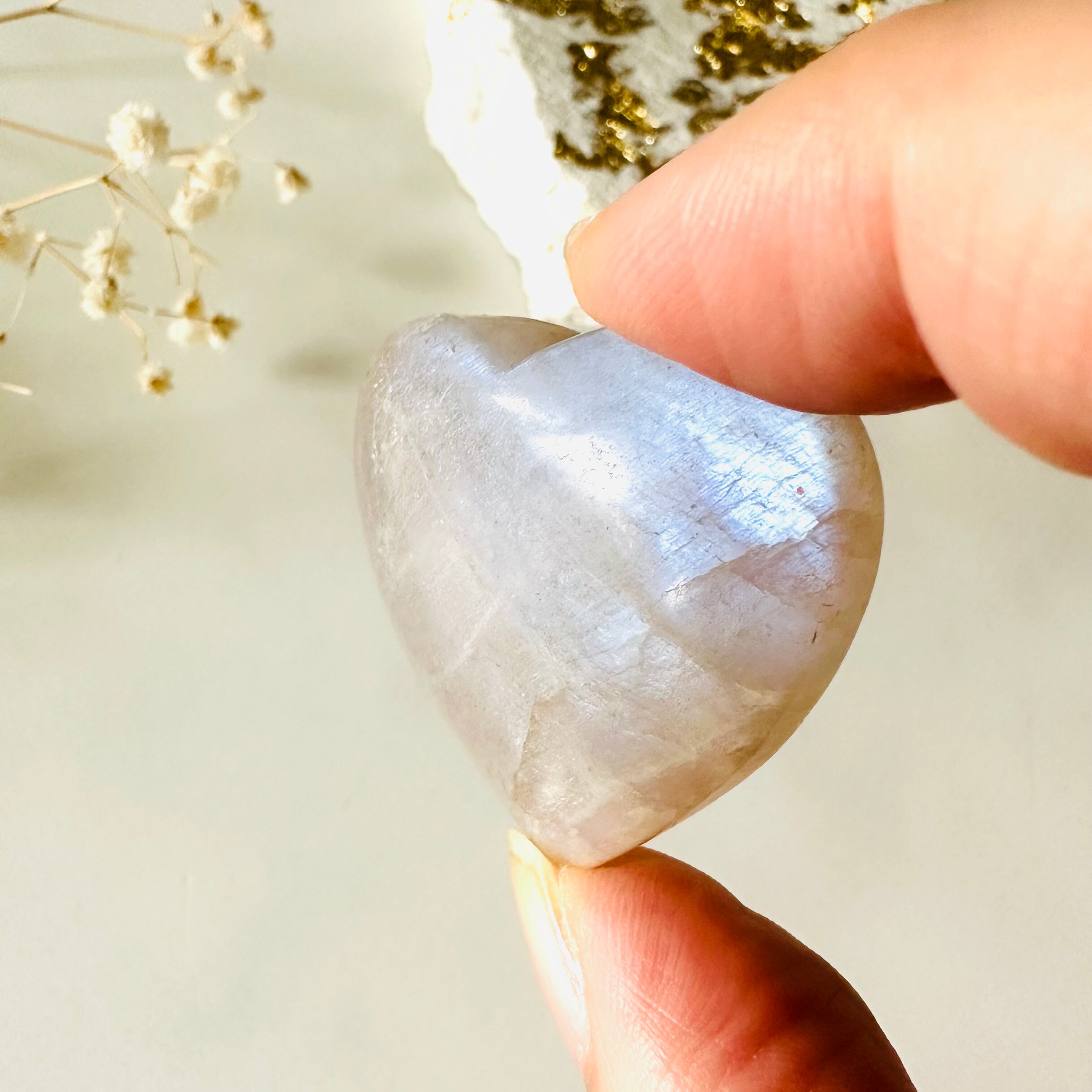 上品な青いシラーが美しい幻想的なムーンストーンのハート型ストーンです。優しいベージュの石肌が綺麗で、鮮やかなブルーフラッシュがとても美しく出ます。
