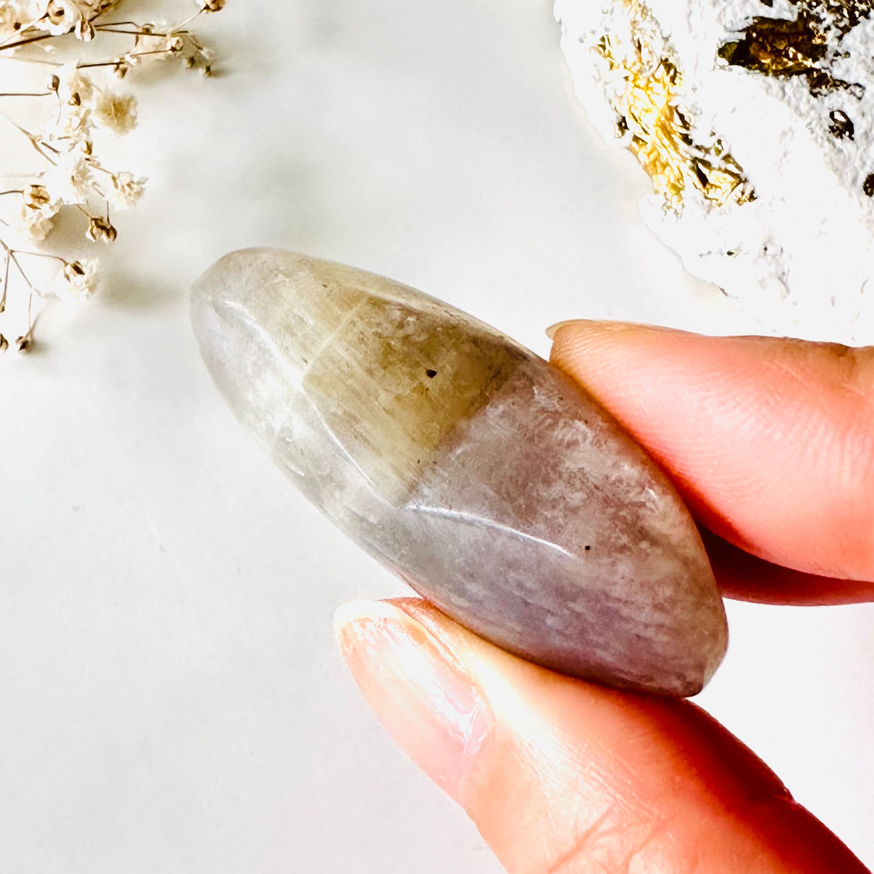 石の表面に、月の光を思わせる神秘的な光(シラー)が浮かぶことから、ムーンストーンと呼ばれます。月は女性性を司り、女性がムーンストーンを持つとより柔らかく女性らしい魅力が花開き、美しさが増すといわれています。