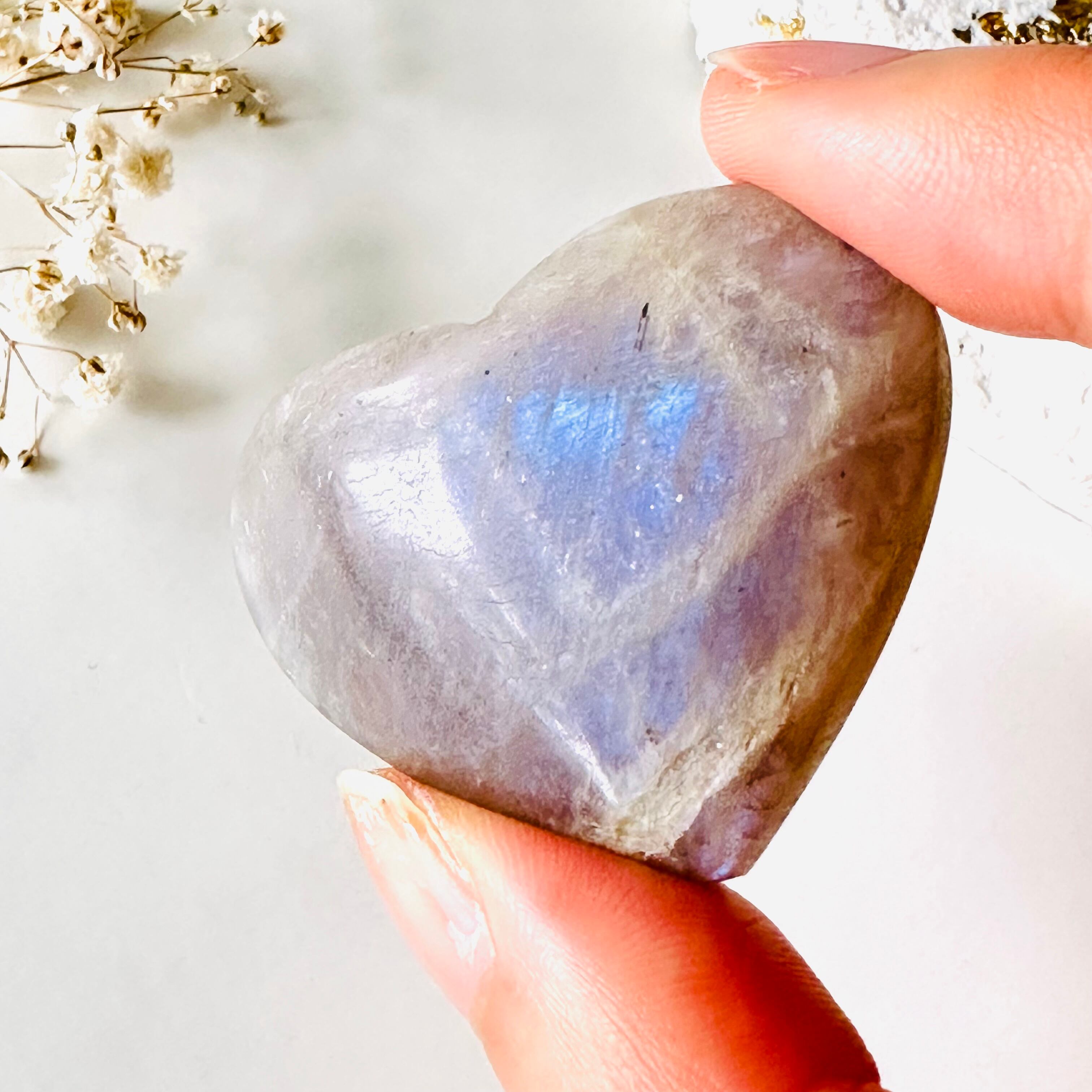上品な青いシラーが美しい幻想的なムーンストーンのハート型ストーンです。優しいベージュの石肌が綺麗で、鮮やかなブルーフラッシュとゴールドのラメが全面にとても美しく出ます。