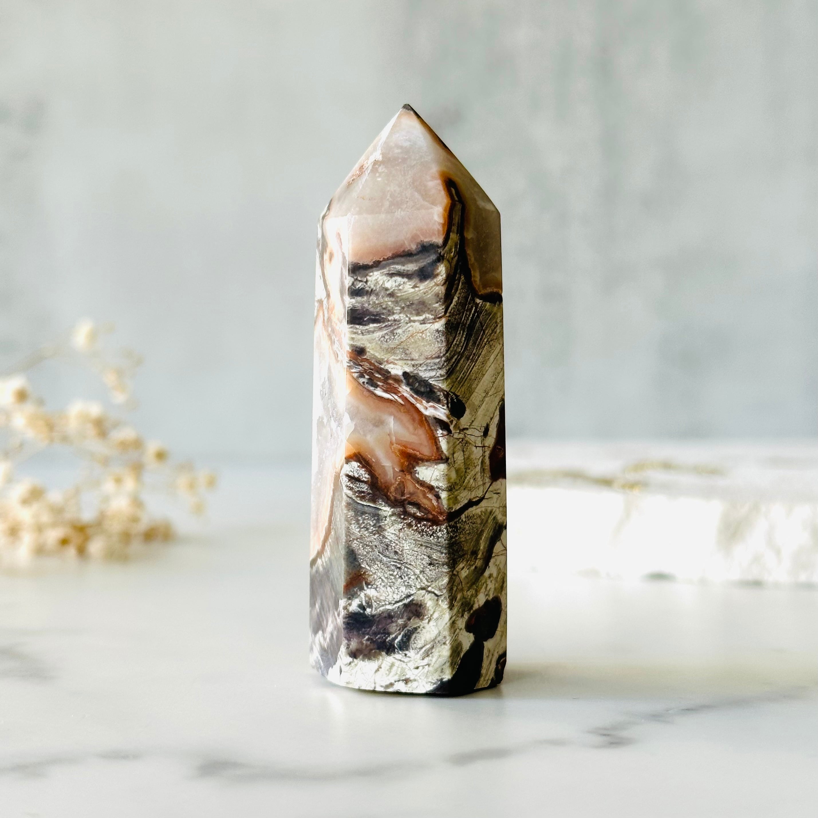 ウェハースチョコレートのような見た目がとっても美味しそうなチョコレートジャスパータワー。たくさんある中からドゥルージーのある子だけを厳選しました。マットな質感の白い石にブラウンのマーブル模様が綺麗です。ドゥルージーはトップとサイドの2箇所に大きく入り、ザクザク、キラキラした様子を楽しむことができます。