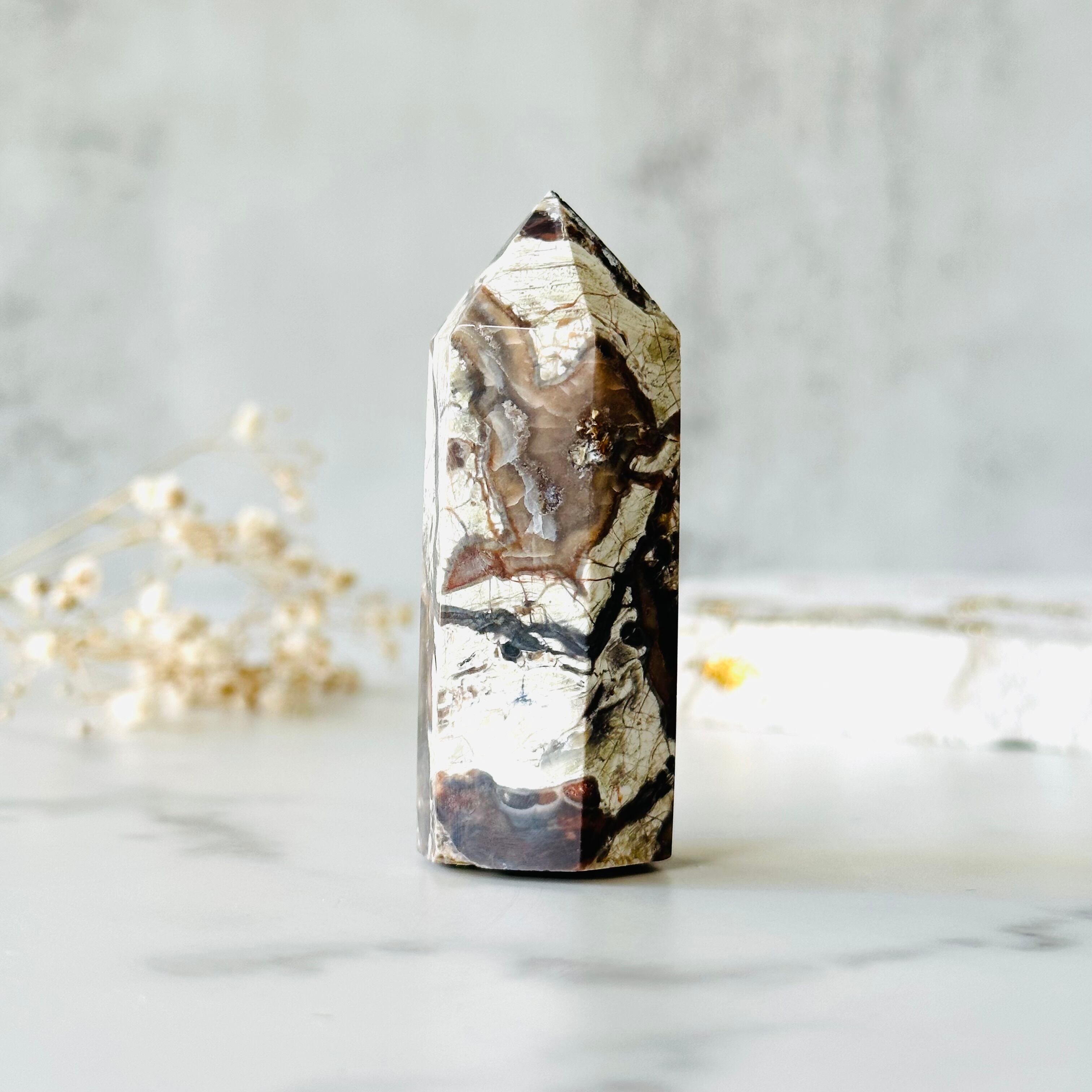 ウェハースチョコレートのような見た目がとっても美味しそうなチョコレートジャスパータワー。たくさんある中からドゥルージーのある子だけを厳選しました。マットな質感の白い石にチョコレートブラウンのマーブル模様が綺麗です。ココア色のドゥルージーがザクザクしています。