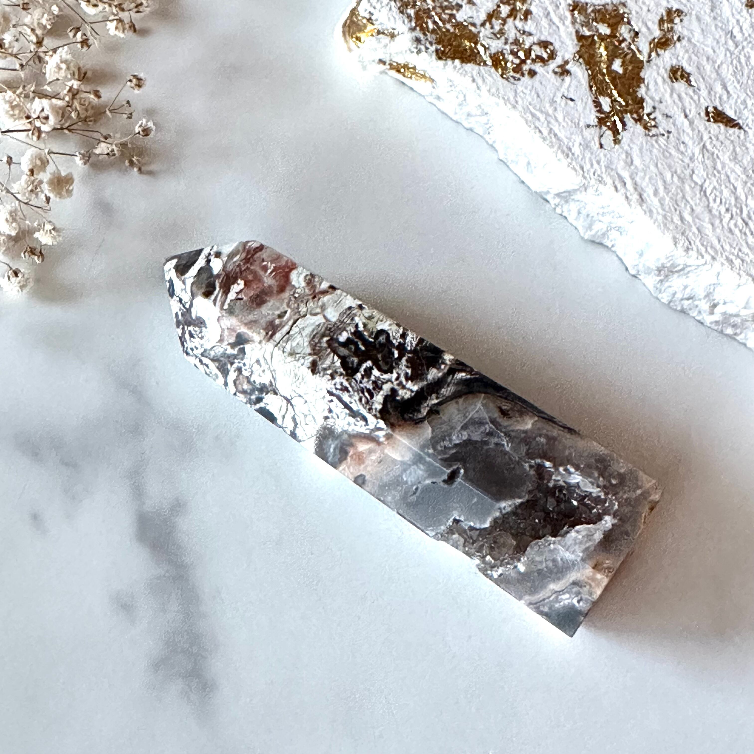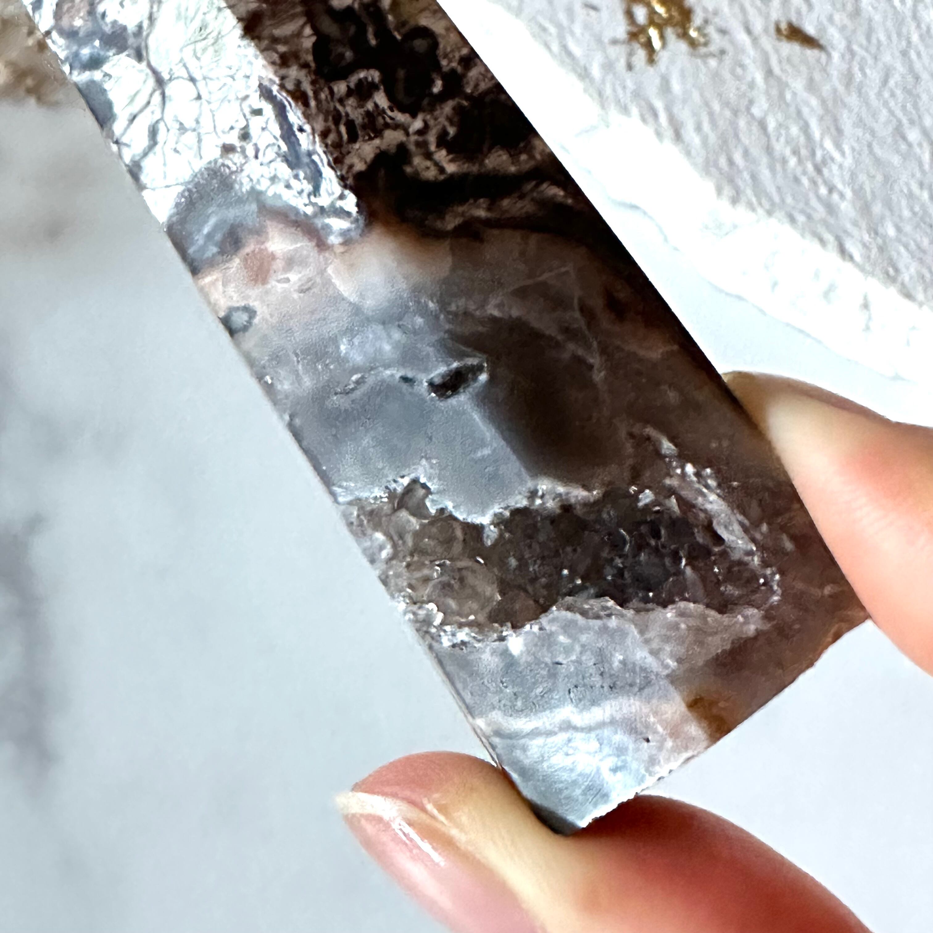 ウェハースチョコレートのような見た目がとっても美味しそうなチョコレートジャスパータワー。たくさんある中からドゥルージーのある子だけを厳選しました。マットな質感の白い石にチョコレートブラウンのマーブル模様が綺麗です。ココア色のドゥルージーがザクザク、キラキラしている様子を楽しめます。