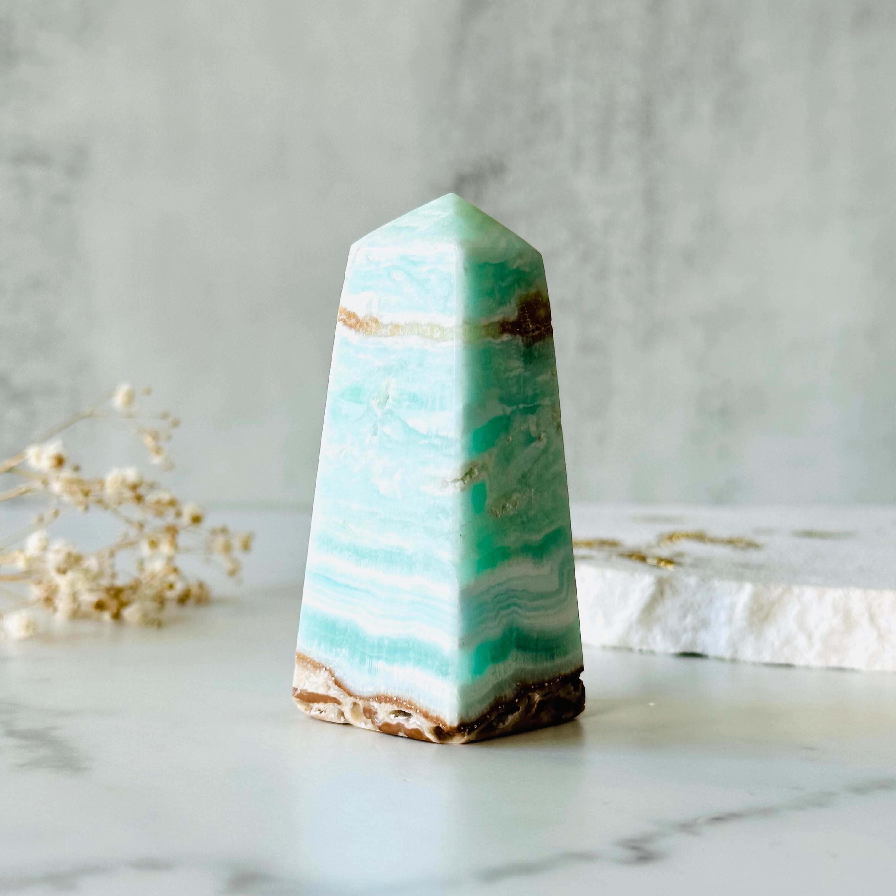 爽やかな水色のカリビアンブルーカルサイトタワー。幾重にも重なった石の層が美しい模様を描き出します。夏にぴったりの涼しげなタワーです。