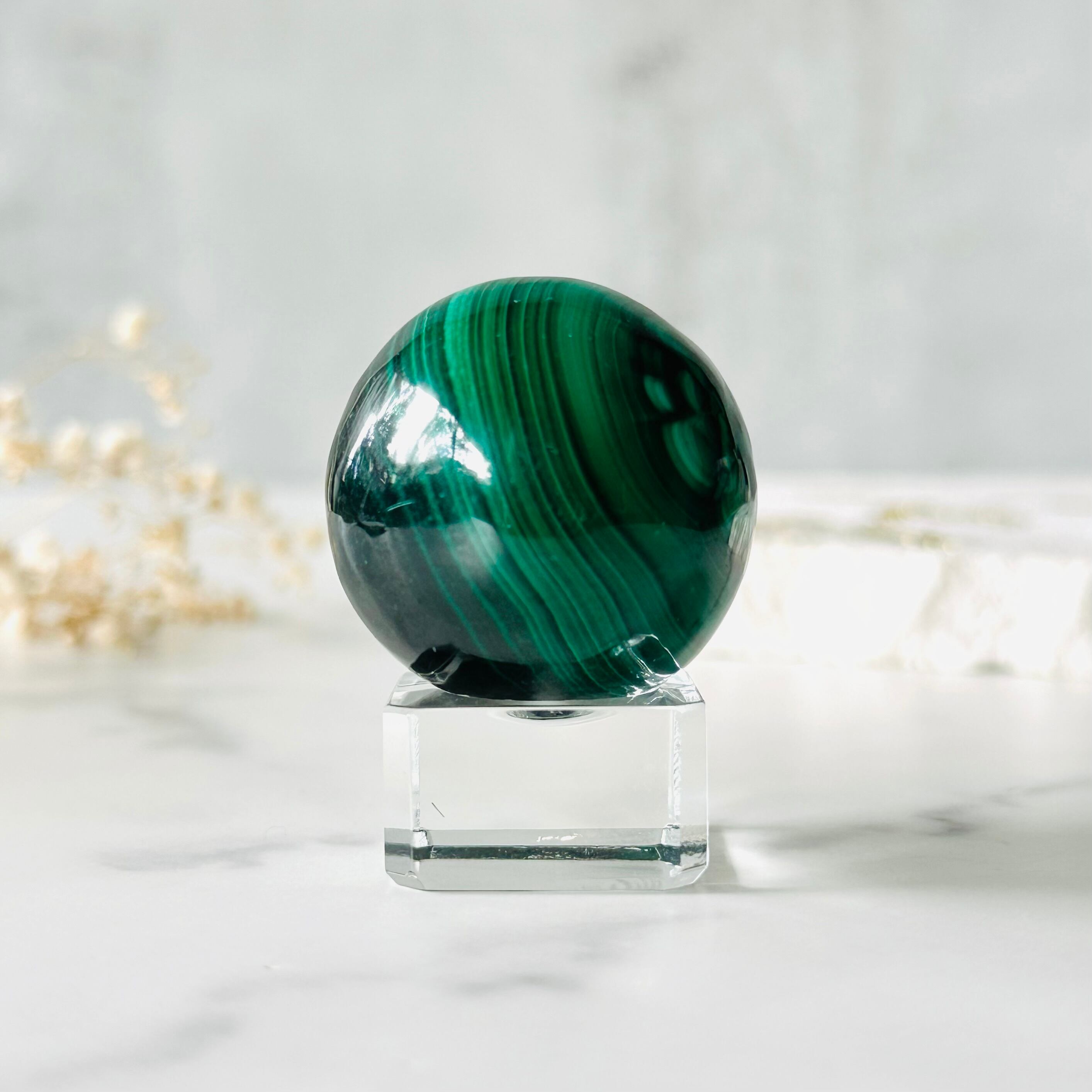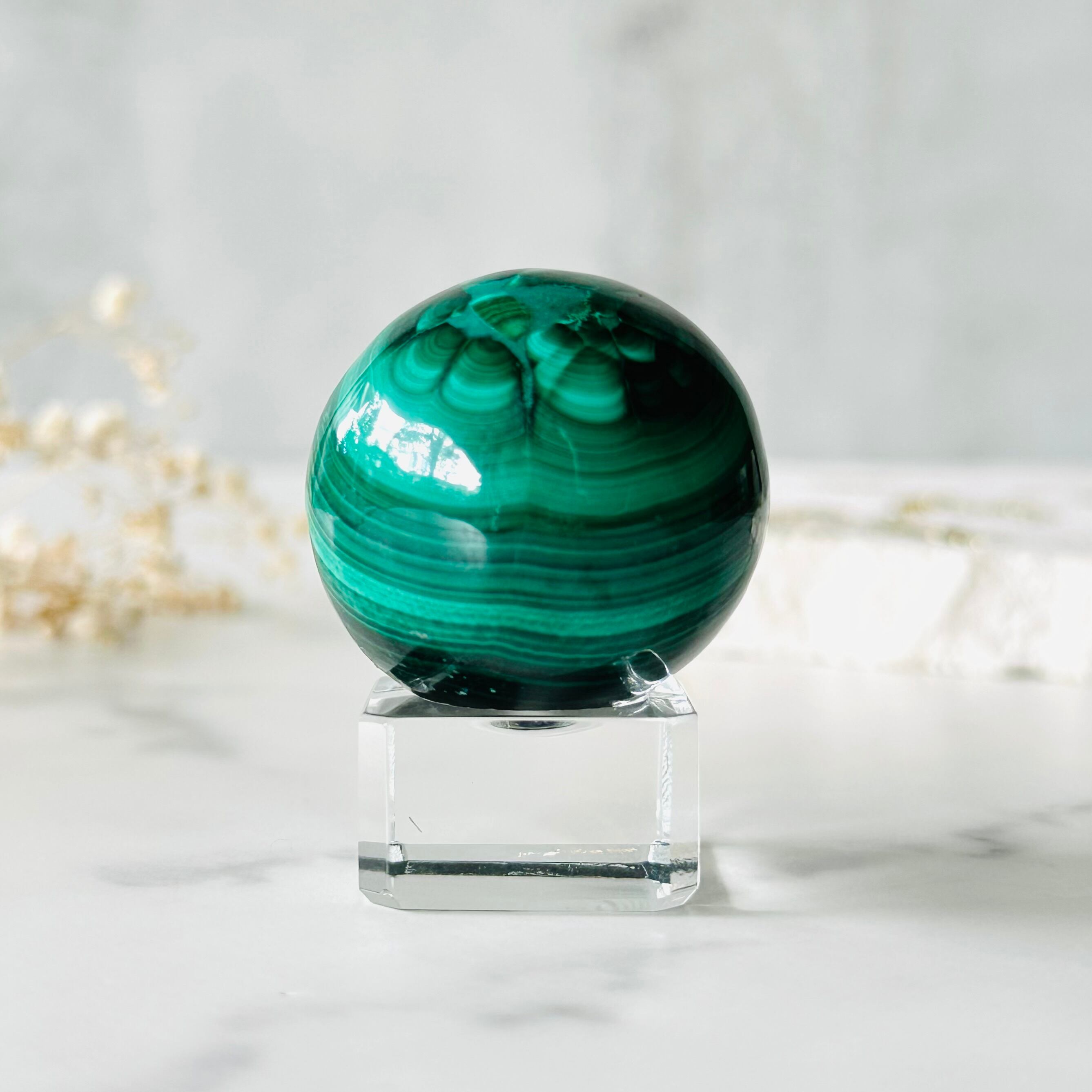 鮮やかなグリーンのグラデーションに、自然のお花模様が浮かび上がるマラカイトのスフィアです。