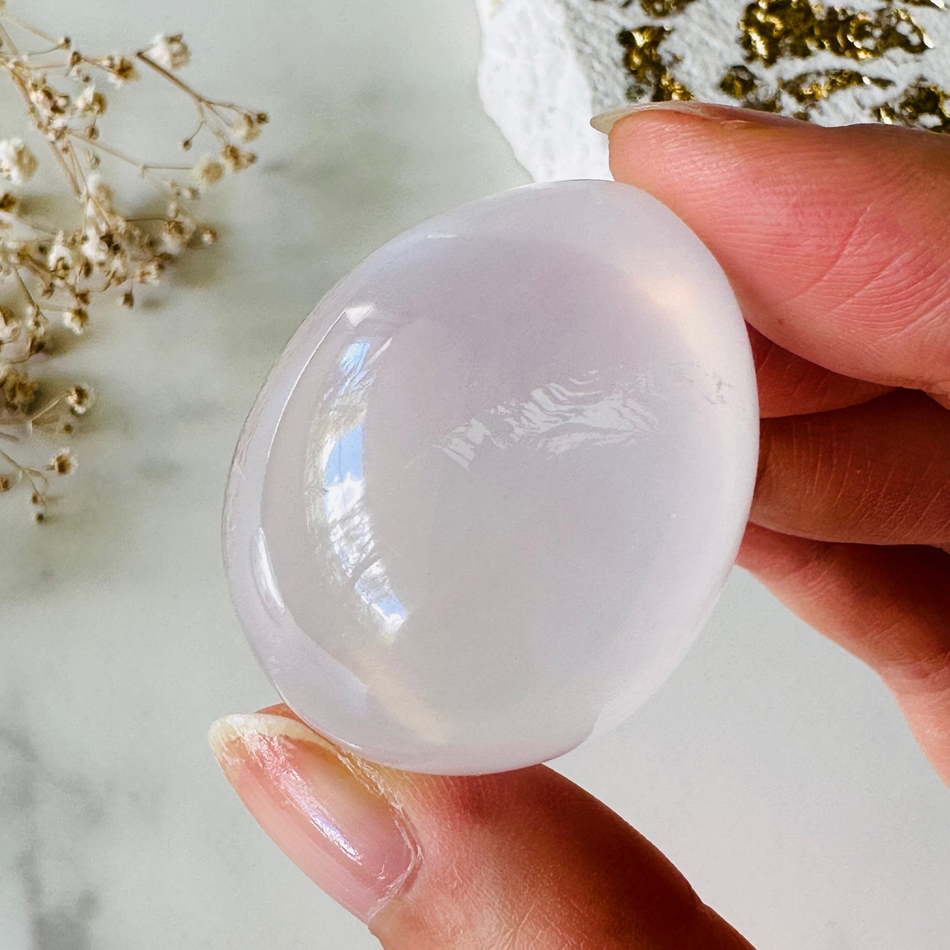 ほんのりクリーム色がかった乳白色で、コロンとしたフォルムがとても可愛らしいです。内側から発光するような美しいクォーツは、優しい波動で癒しを与えてくれます。