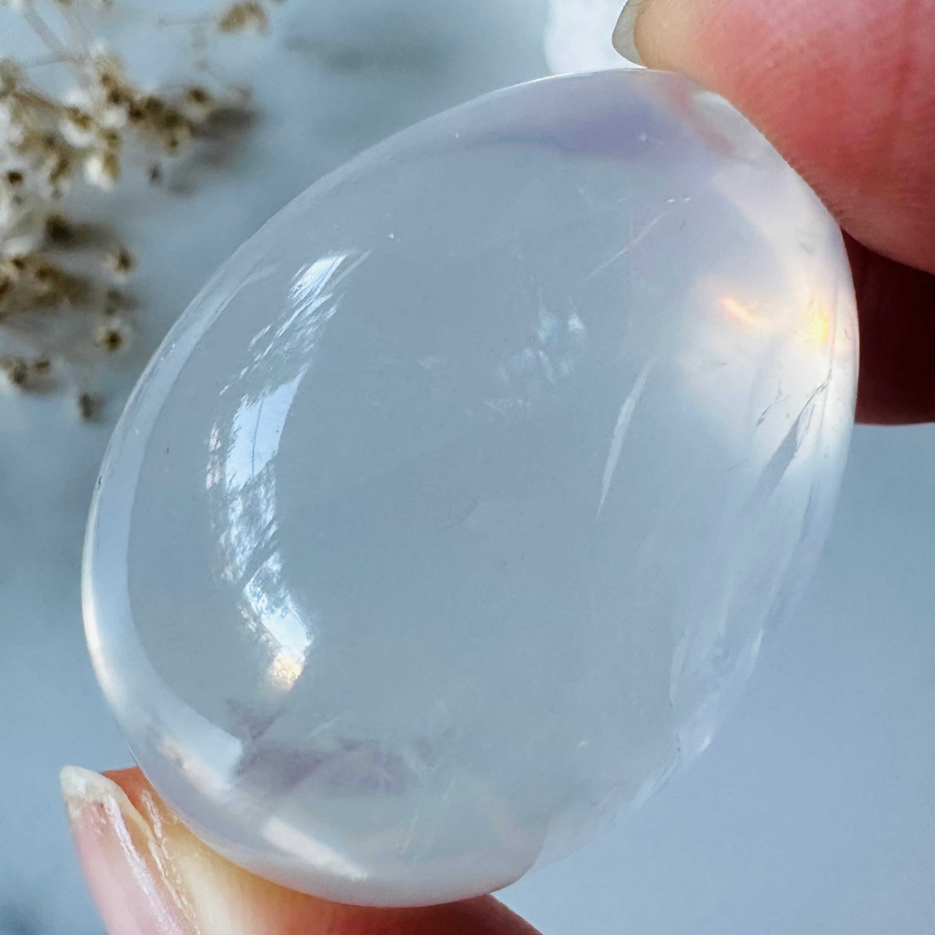 わずかに青みがかった透明感のあるクォーツです。水晶に近い透明感がありますが、実際に水晶と並べてみると、ふんわりと柔らかいジラソル特有の雰囲気が感じられます。数箇所控えめなクラックがあり虹が確認できます。内側から発光するような美しいクォーツは、優しい波動で癒しを与えてくれます。