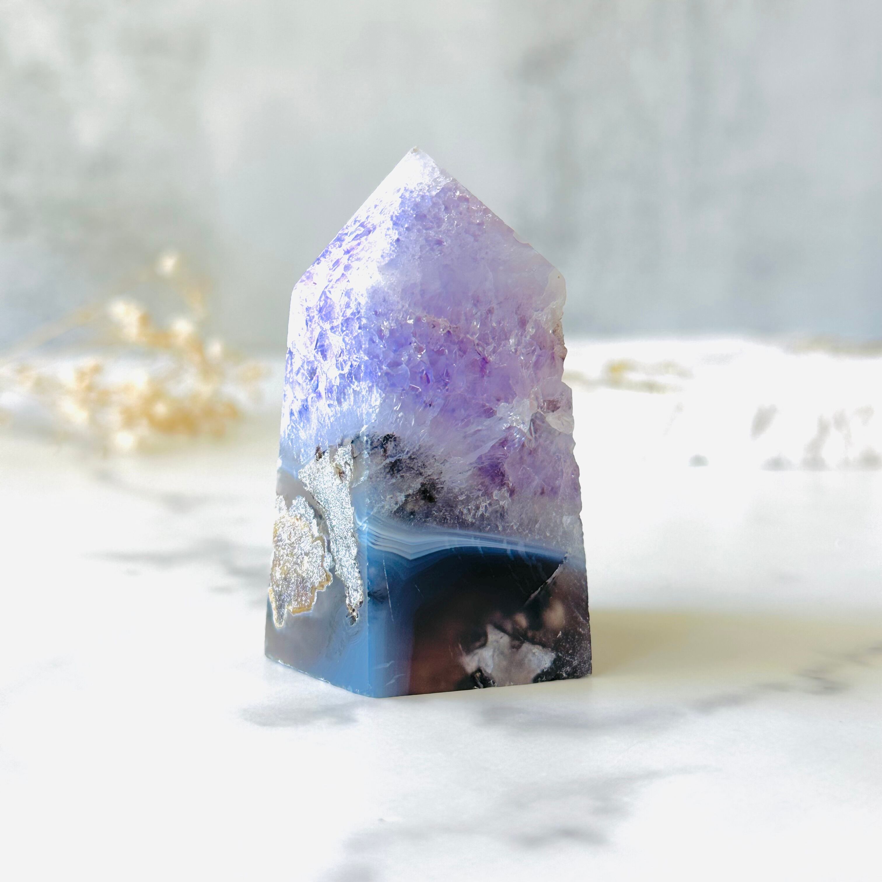 透明感のある淡い紫色の奥から濃い紫色が透けて見えるとても美しいデザインです。ダークカラーのアゲートと共生しており、凛とした印象があります。つるつるとした表面とは対照的に、ホールからはザクザクとした原石の粒たちが覗いていて、光に当てるとキラキラと光ります。