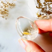 非常にクリアで質の高い水晶に、ひとひら黄色い花びらが閉じ込められたような美しいデザインです。黄色い花びらはゴールデンヒーラーです。トップは無垢でクリア、ボトムはクラックが重なり美しい虹を映し出します。