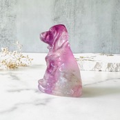 お顔はくっきりとしたパープルで、お尻の辺りは淡い水色です。透明感があってとても綺麗なフローライトです。玄関に飾れば毎日「いってきます」「おかえり」と声をかけたくなるような可愛いわんこです。ぜひ名前もつけてあげていただきたいです。