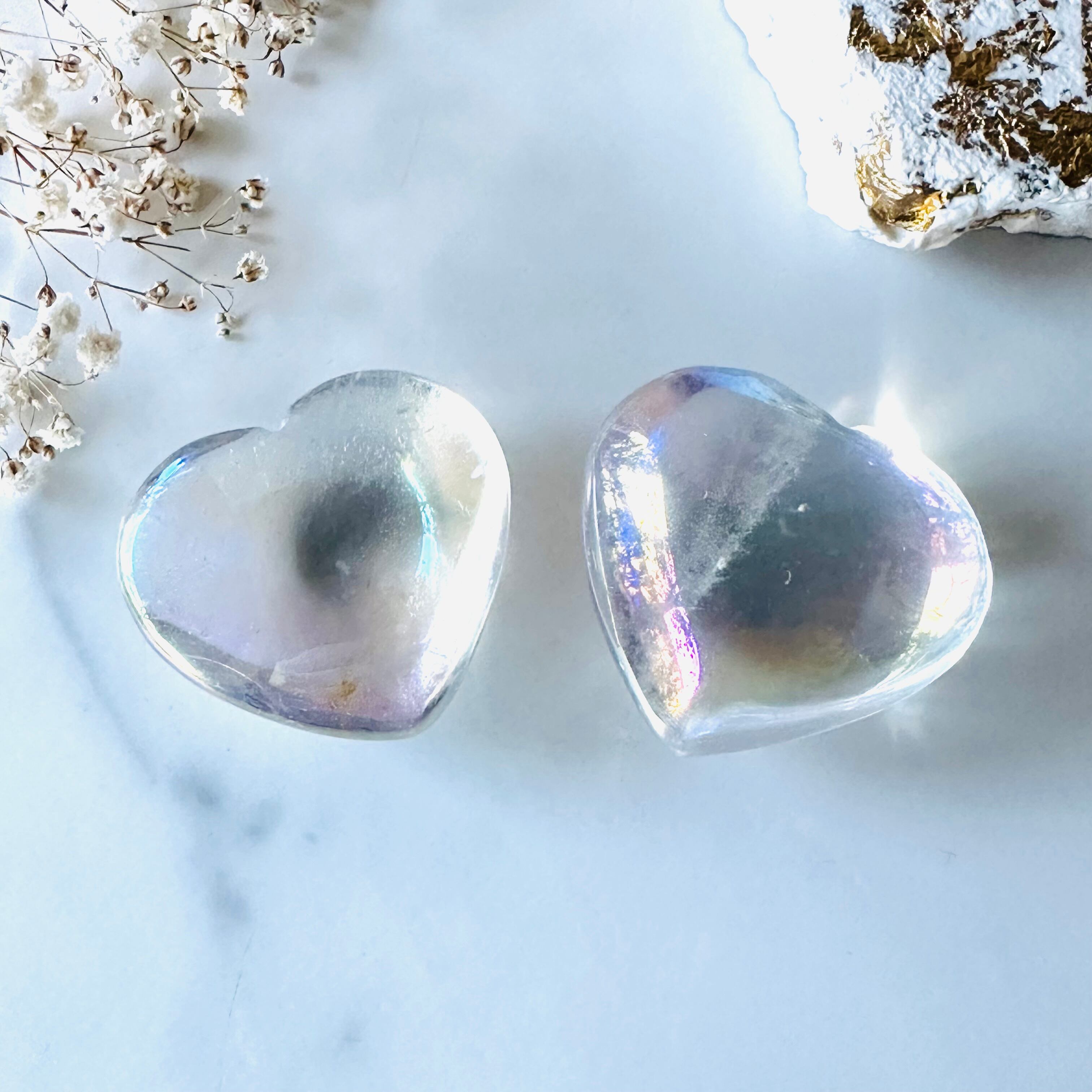 ピンクがかったオーラのハートと、青みがかったオーラのハートのセットです。どちらもとても可愛いです。透明度が高く微細な気泡のような内包物も綺麗です。